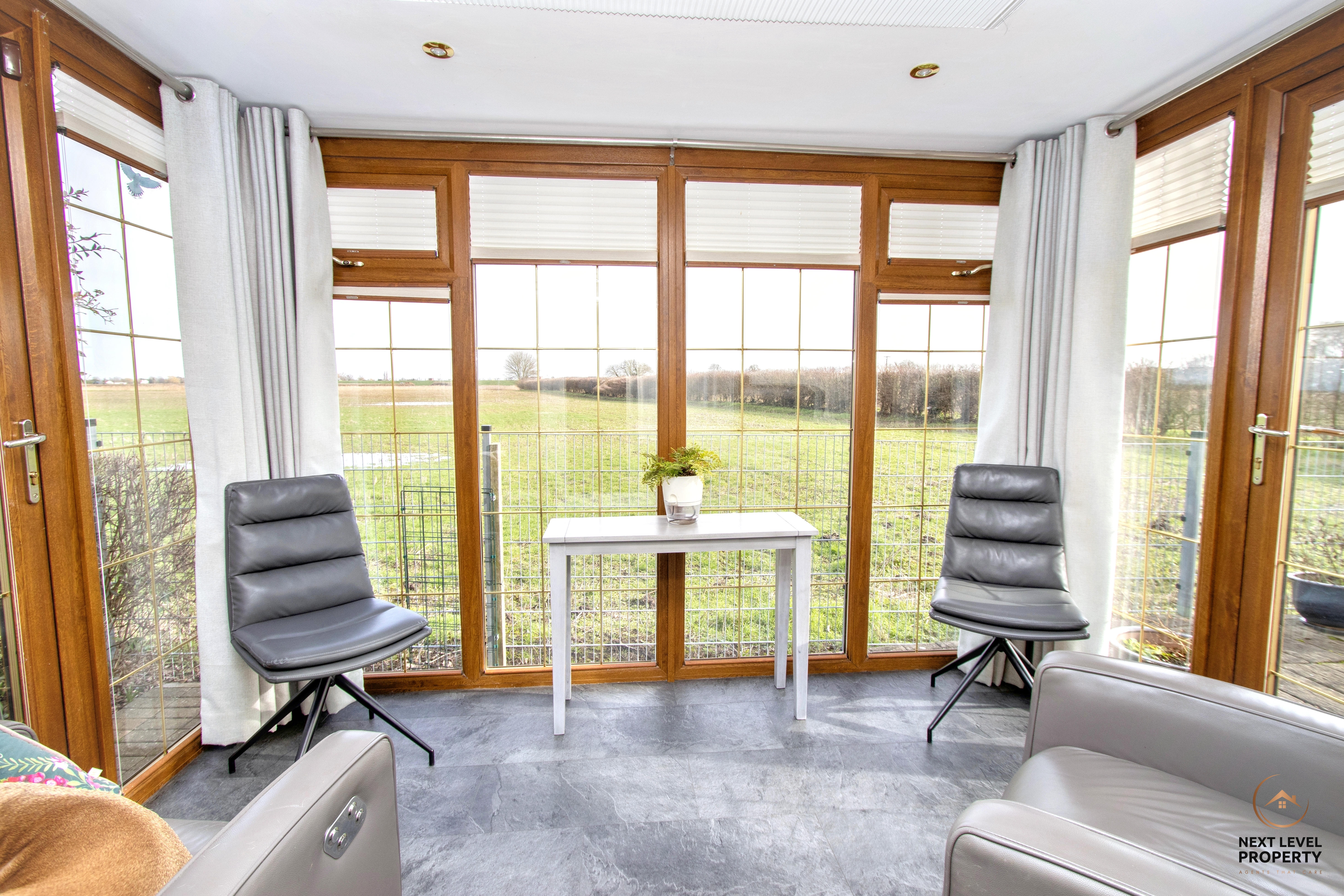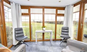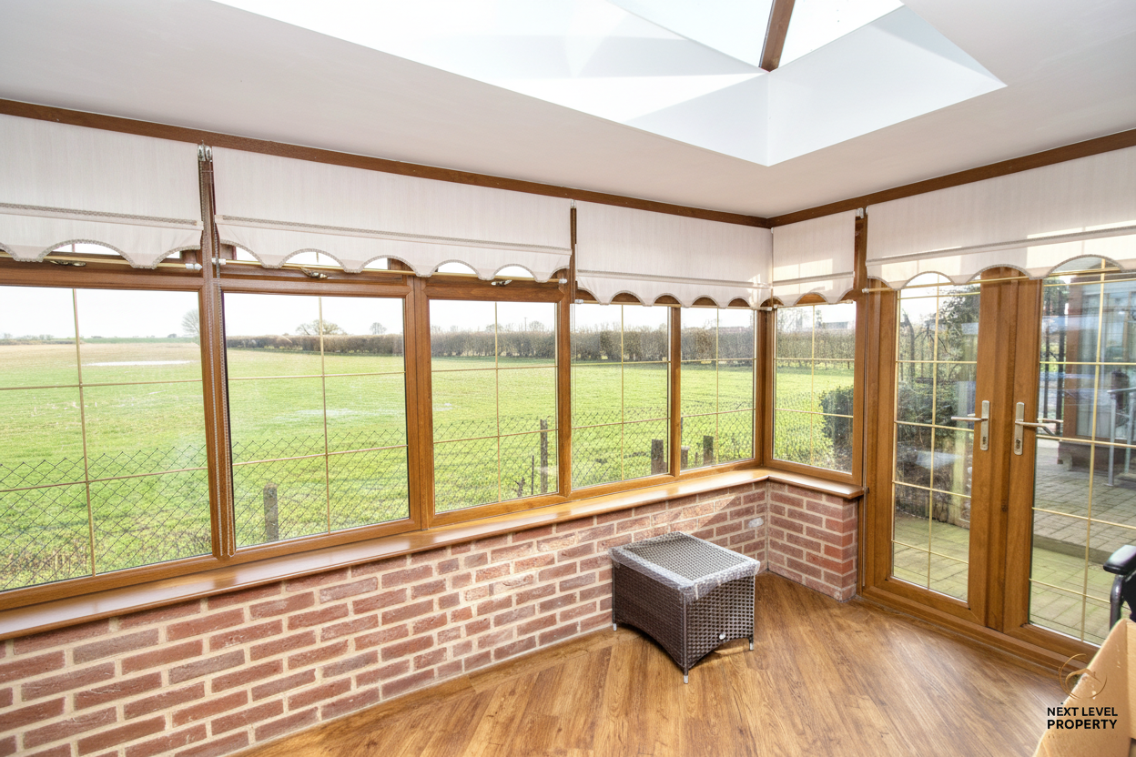 Constructed in uPVC and designed to maximise the outlook, this light-filled conservatory enjoys full-length windows that frame uninterrupted views across open arable fields — a truly calming backdrop to everyday life. Doors to either side provide easy access out to the gardens, making it a wonderful space to relax with a morning coffee, entertain guests, or simply sit and take in the ever-changing countryside views.