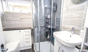 Well-appointed and thoughtfully designed, the shower room features a WC with concealed cistern and integrated storage for a sleek, uncluttered finish. A shower cubicle with electric shower provides everyday convenience, while the hand basin is set within a vanity storage unit, complemented by additional fitted storage to keep everything neatly organised. Tiled walls add a clean, modern touch, and a uPVC window to the rear allows natural light and ventilation.