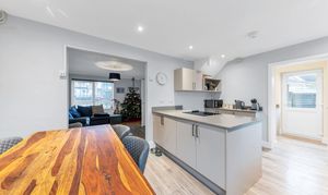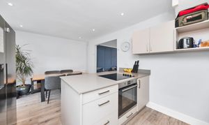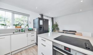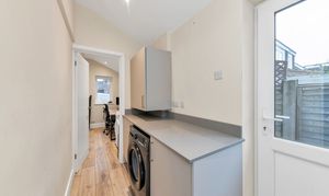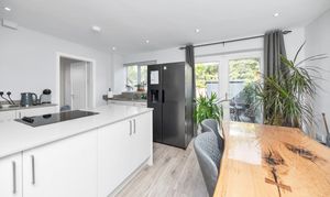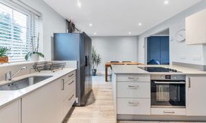 The kitchen/dining room is wonderfully open-plan, enjoying windows and double French doors to a garden aspect, a range of modern base and wall units, Quartz worktops, inset lighting, new Quick-step laminate flooring, an integrated oven, hob and dishwasher, and space for an American fridge/freezer, smaller kitchen appliances, and a large dining setting. The utility room provides further storage, access to the side of the property, and space for laundry appliances.