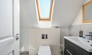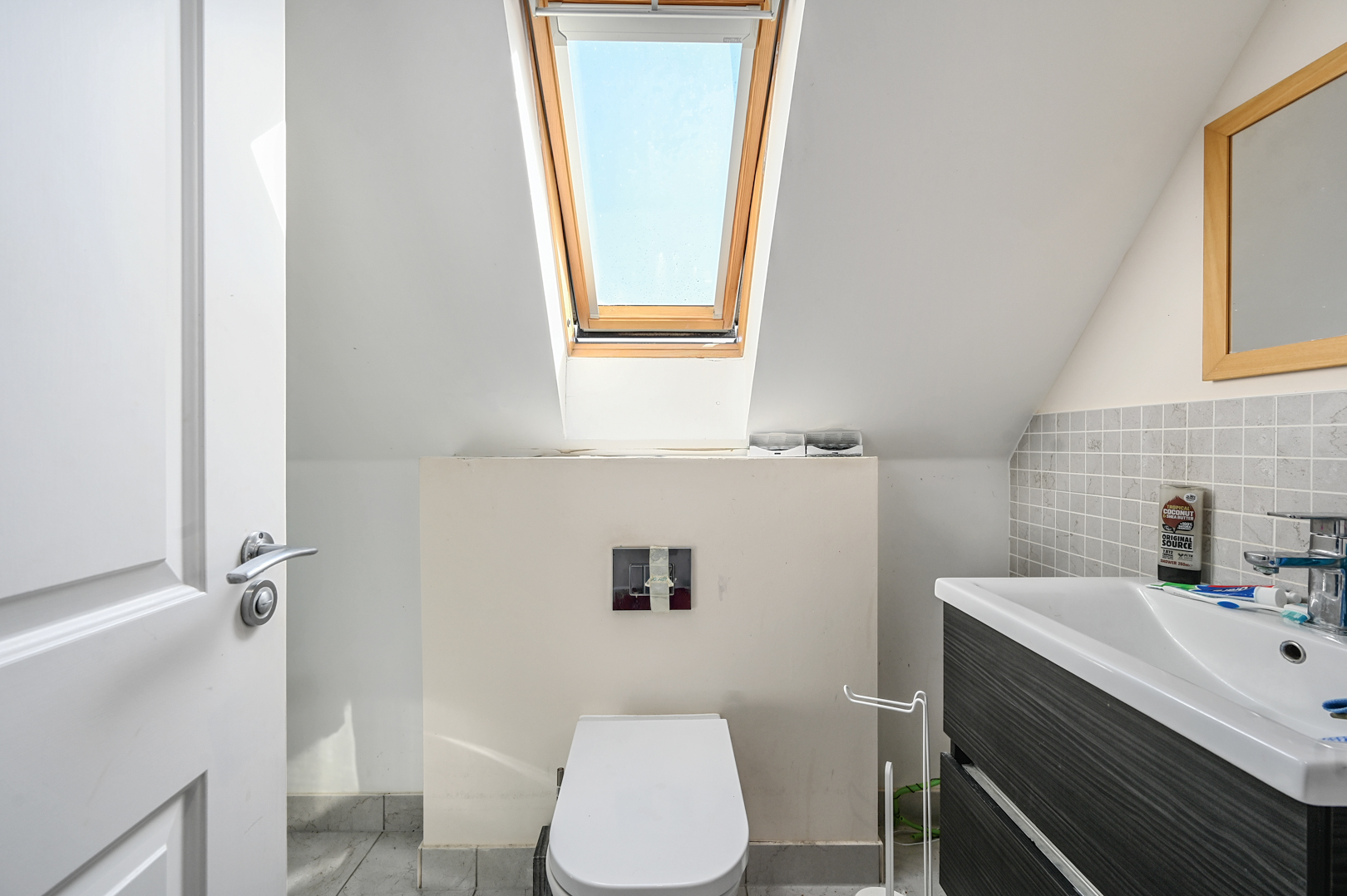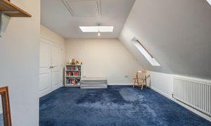 A generous double bedroom with neutral décor and fitted carpet, featuring a built-in wardrobe and an en-suite shower room. Two skylights to the front and one to the rear provide excellent natural light throughout the space.