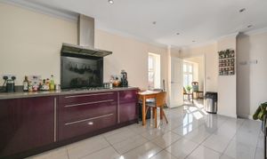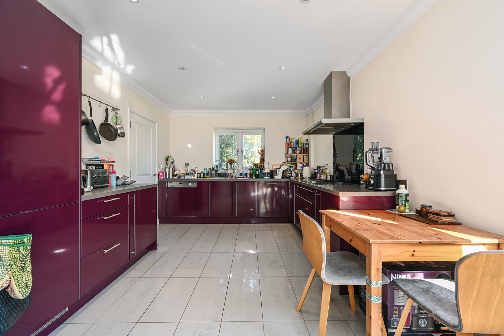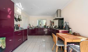 Fitted with a range of modern gloss units and integrated Miele appliances. The room features tiled flooring with underfloor heating, ample worktop space, and room for a dining table. Window overlooking the front garden to the side of the property.