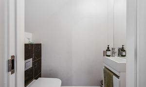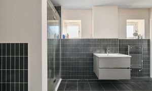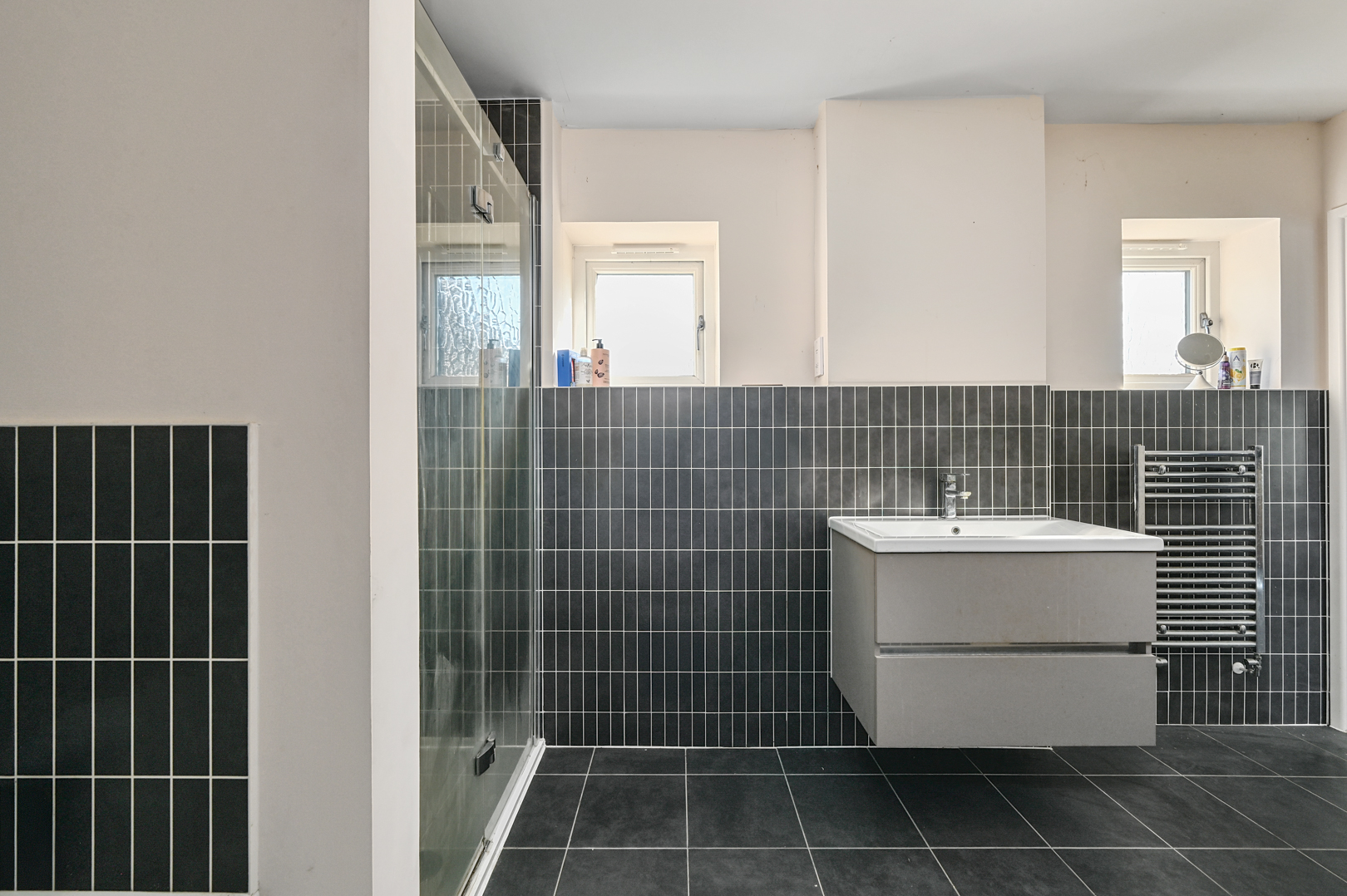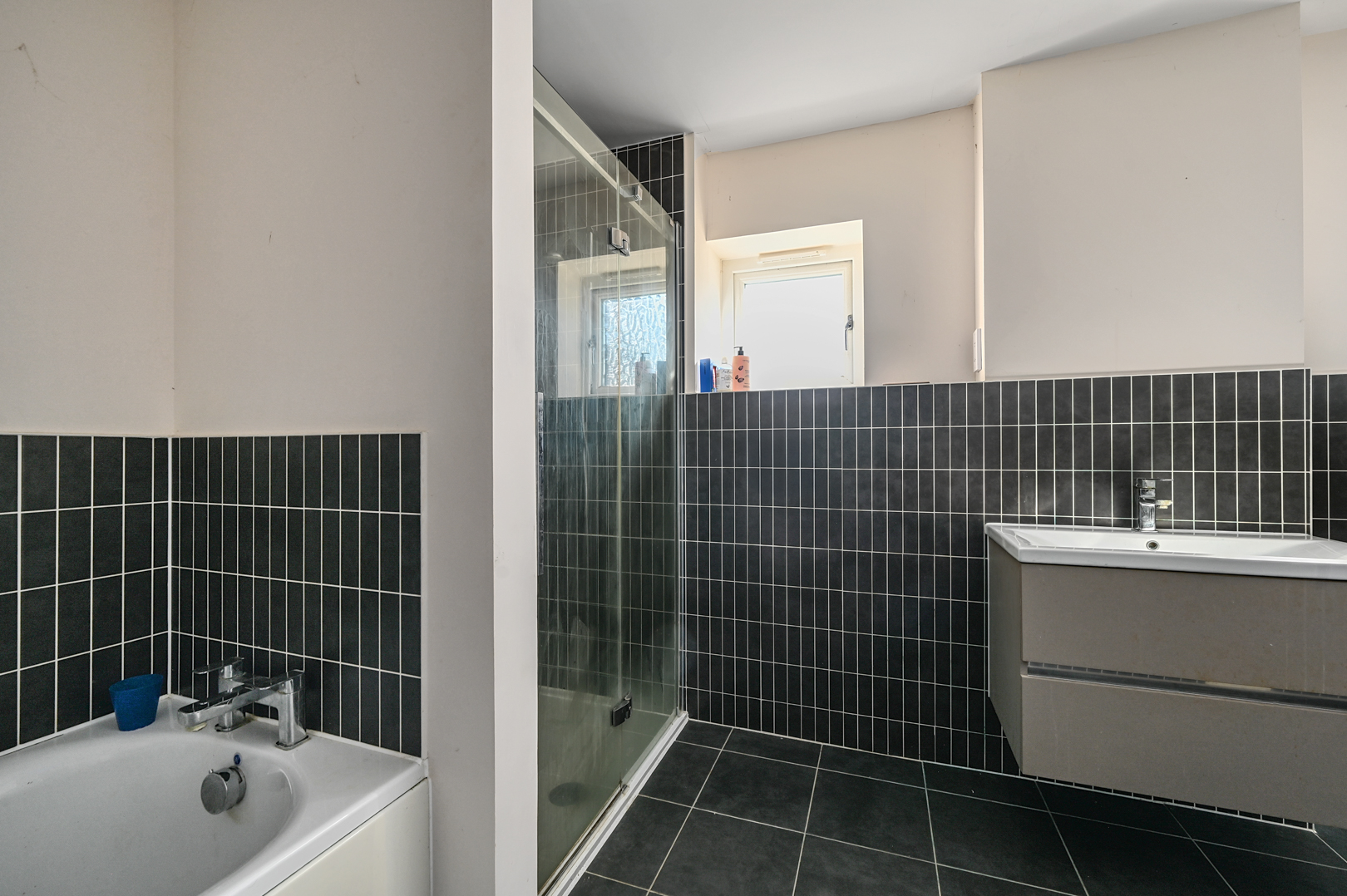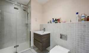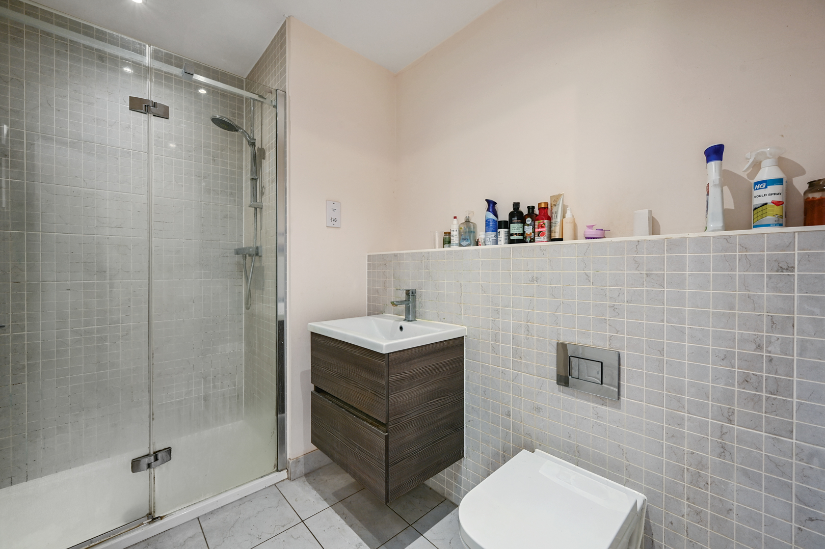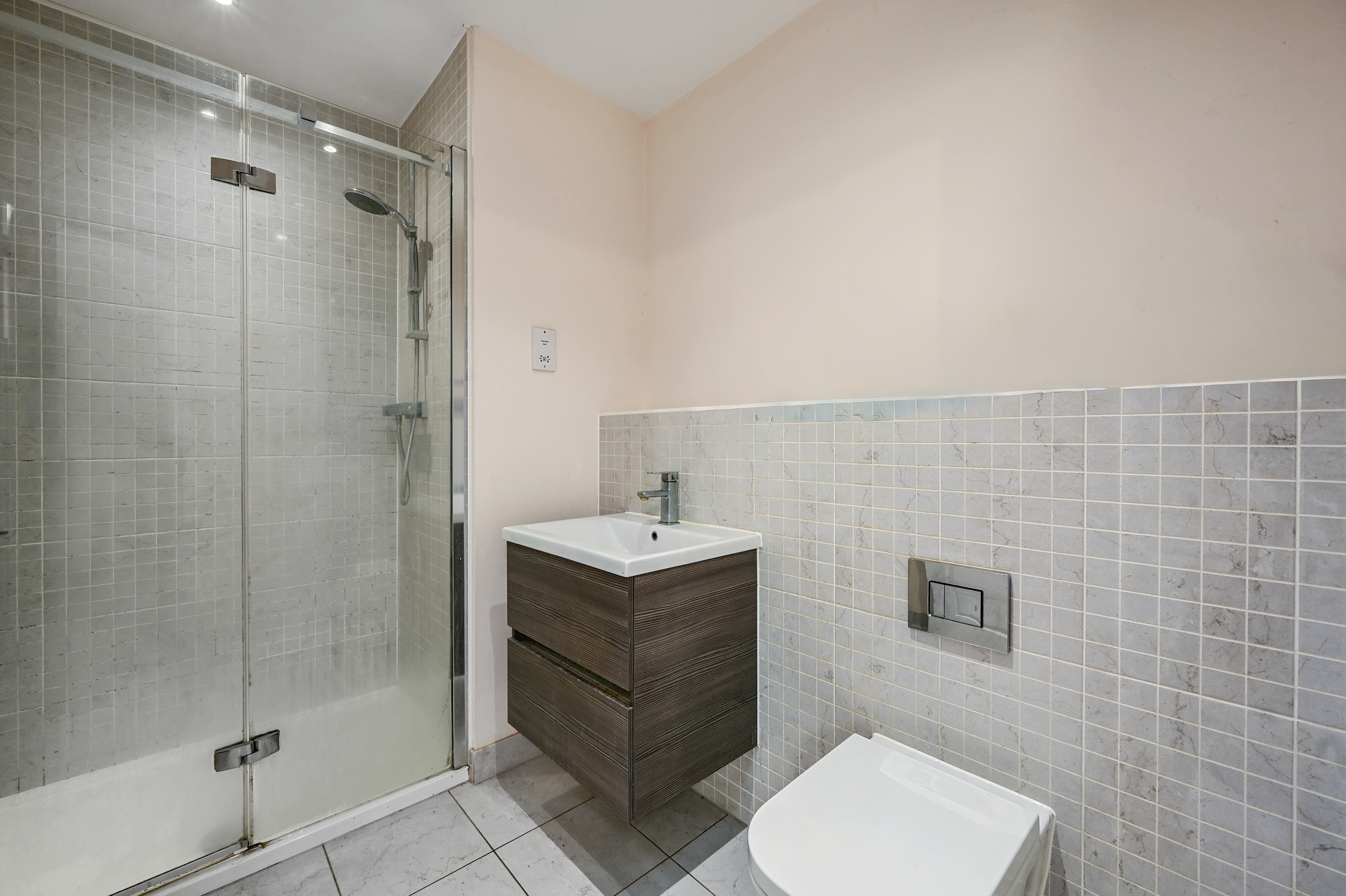 The en-suite to bedroom two is fitted with a walk-in shower with glass enclosure, a wall-mounted wash basin with storage drawers, and a concealed cistern WC. The room is finished with tiled flooring and part-tiled walls.