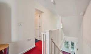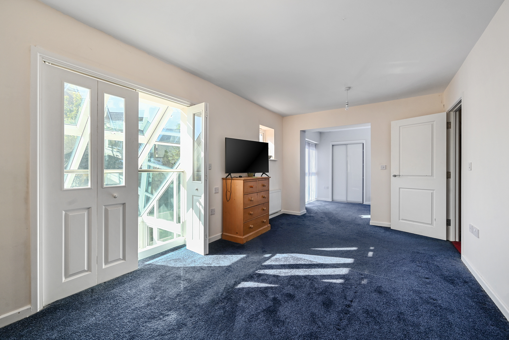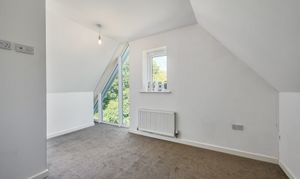 A first-floor bedroom with neutral décor, enjoying excellent natural light from a front-facing window and an internal side window that offers a pleasant outlook toward the landing and beyond. This versatile space could also serve well as a study.