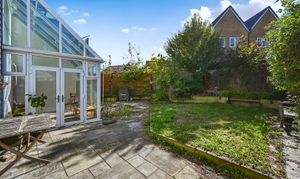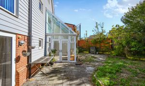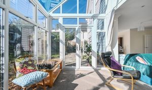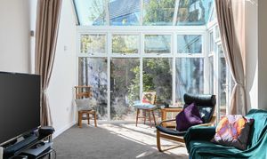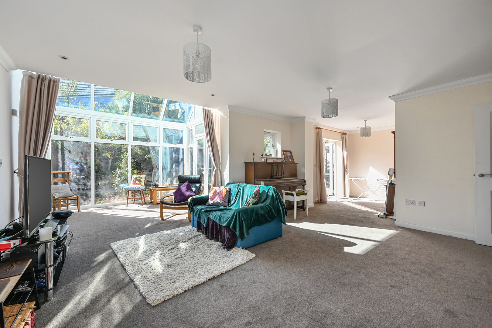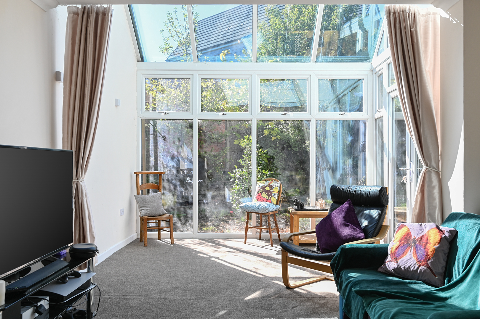A bright glazed extension with pitched roof and double doors opening to the garden. The space provides excellent natural light and a direct connection between the lounge and outdoor patio.