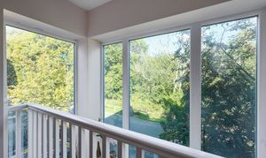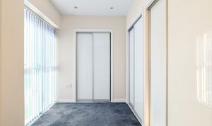 A spacious master bedroom with neutral décor and carpeted flooring, featuring multiple windows and folding doors that overlook the sunroom. The room includes a dressing area fitted with sliding wardrobes and access to a modern en-suite bathroom.