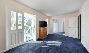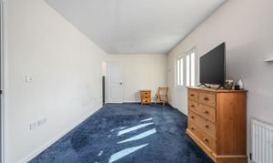 A bright open-plan lounge dining area benefitting from underfloor heating with neutral décor and carpeted flooring. Featuring multiple windows and glazed doors that provide plenty of natural light. The room includes a sealed fireplace that adds character and balance to the space and offers an excellent opportunity to be reopened and restored as a multi fuel burner. The room leads directly into the adjoining sun room. To one side, a designated dining area includes French doors opening to the garden, making it suitable for both family meals and more formal dining.