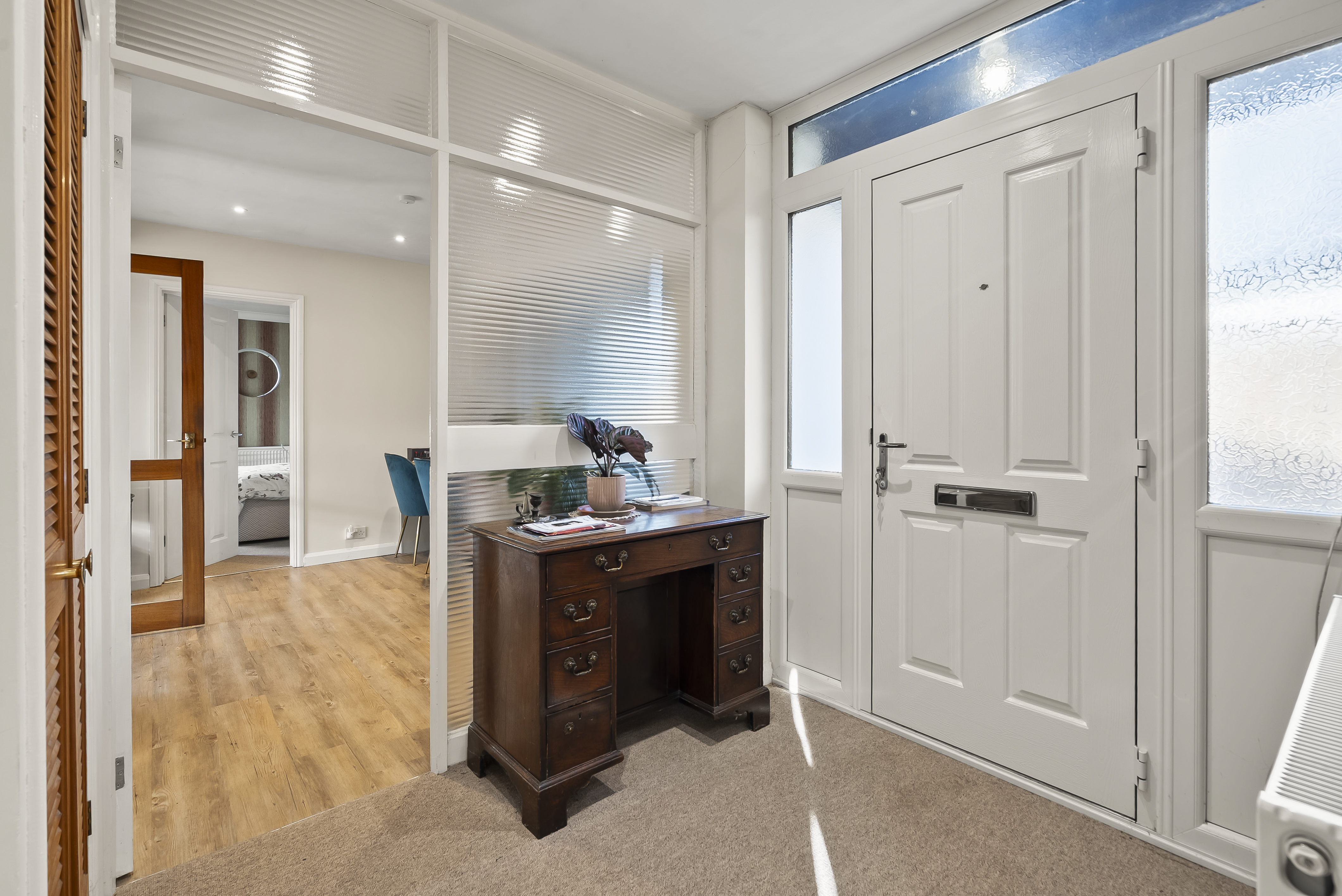 - Entrance hall leading to the cosy sitting room with a central open fireplace and dual aspect windows, flooding the room with natural light