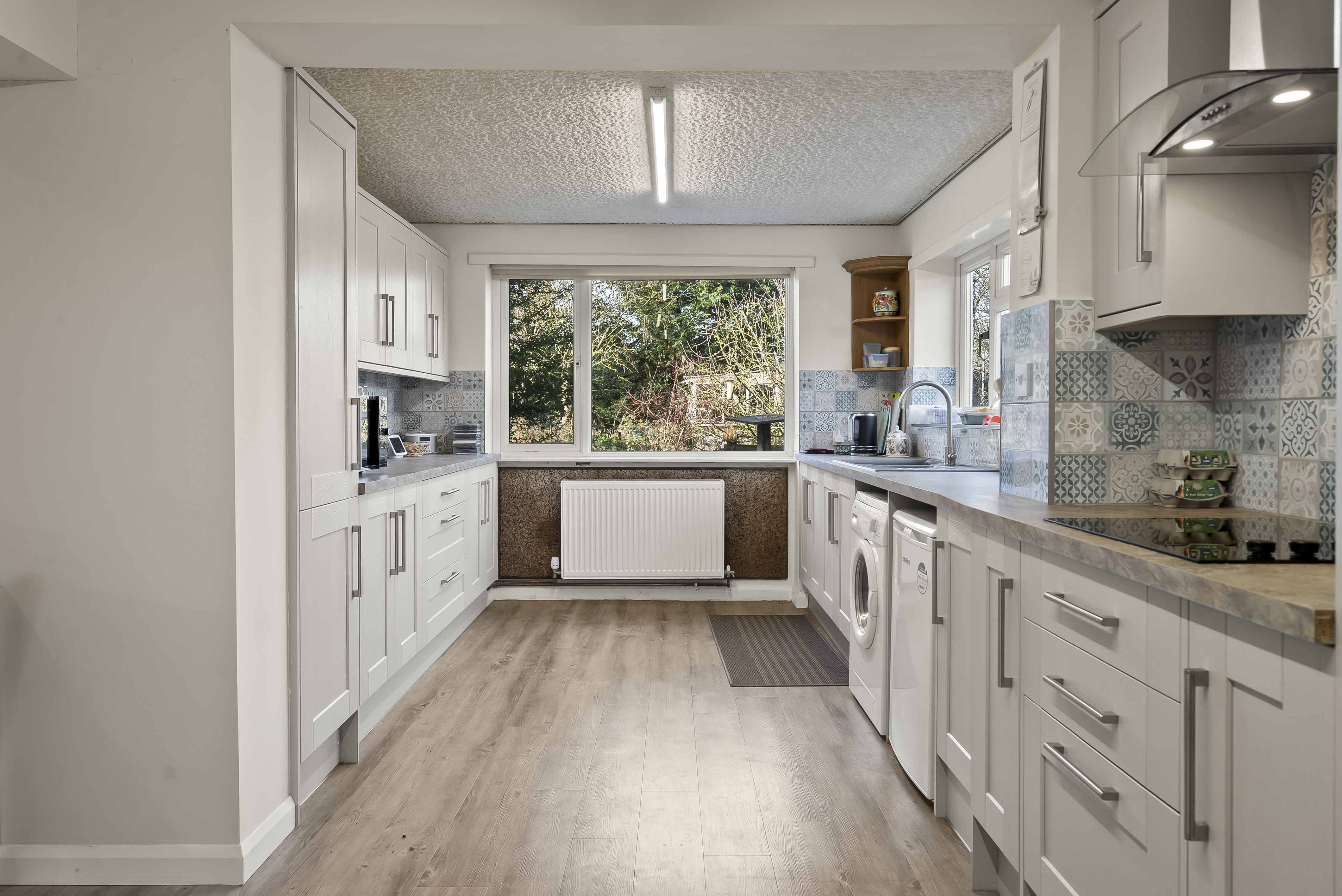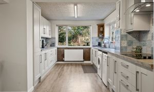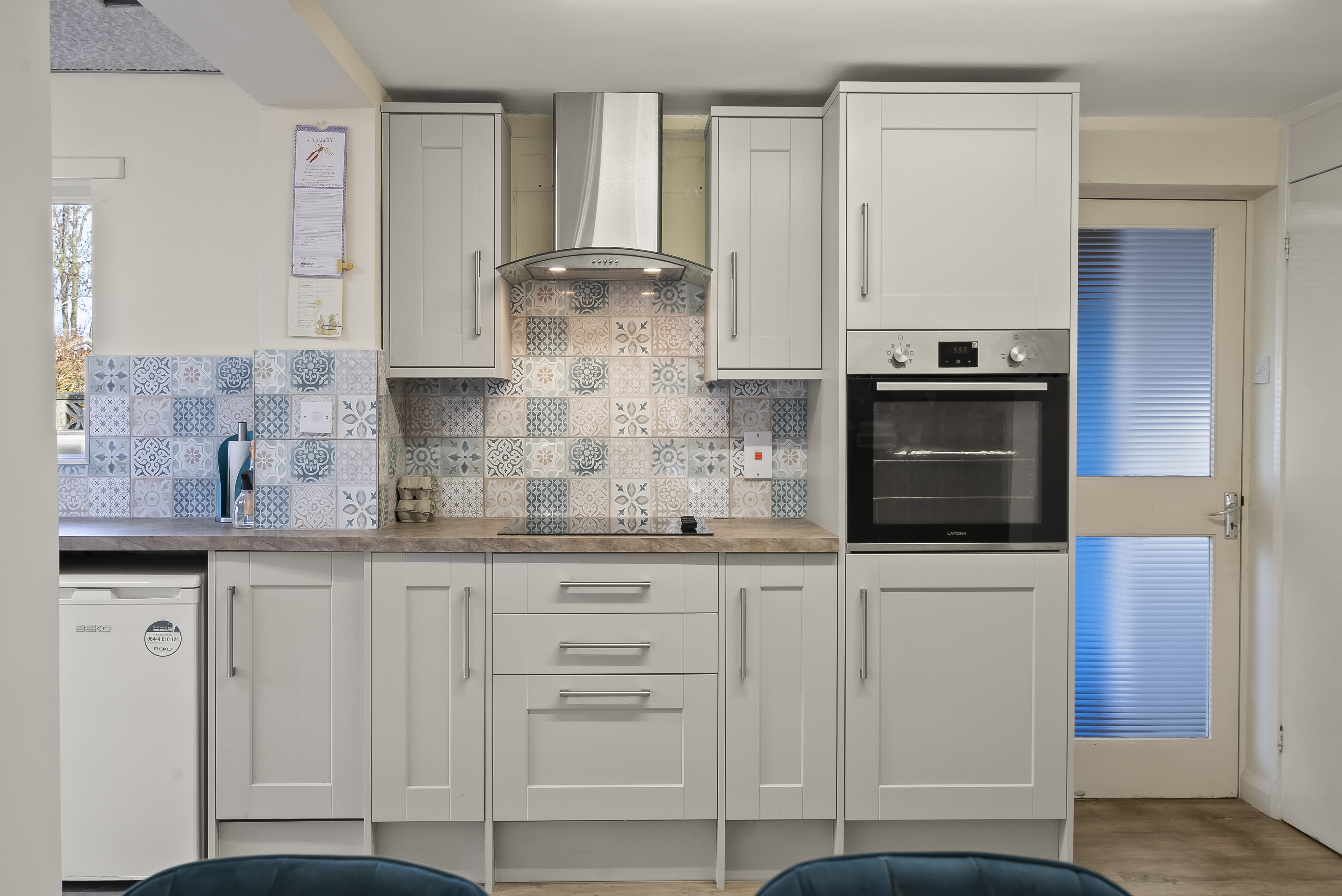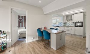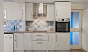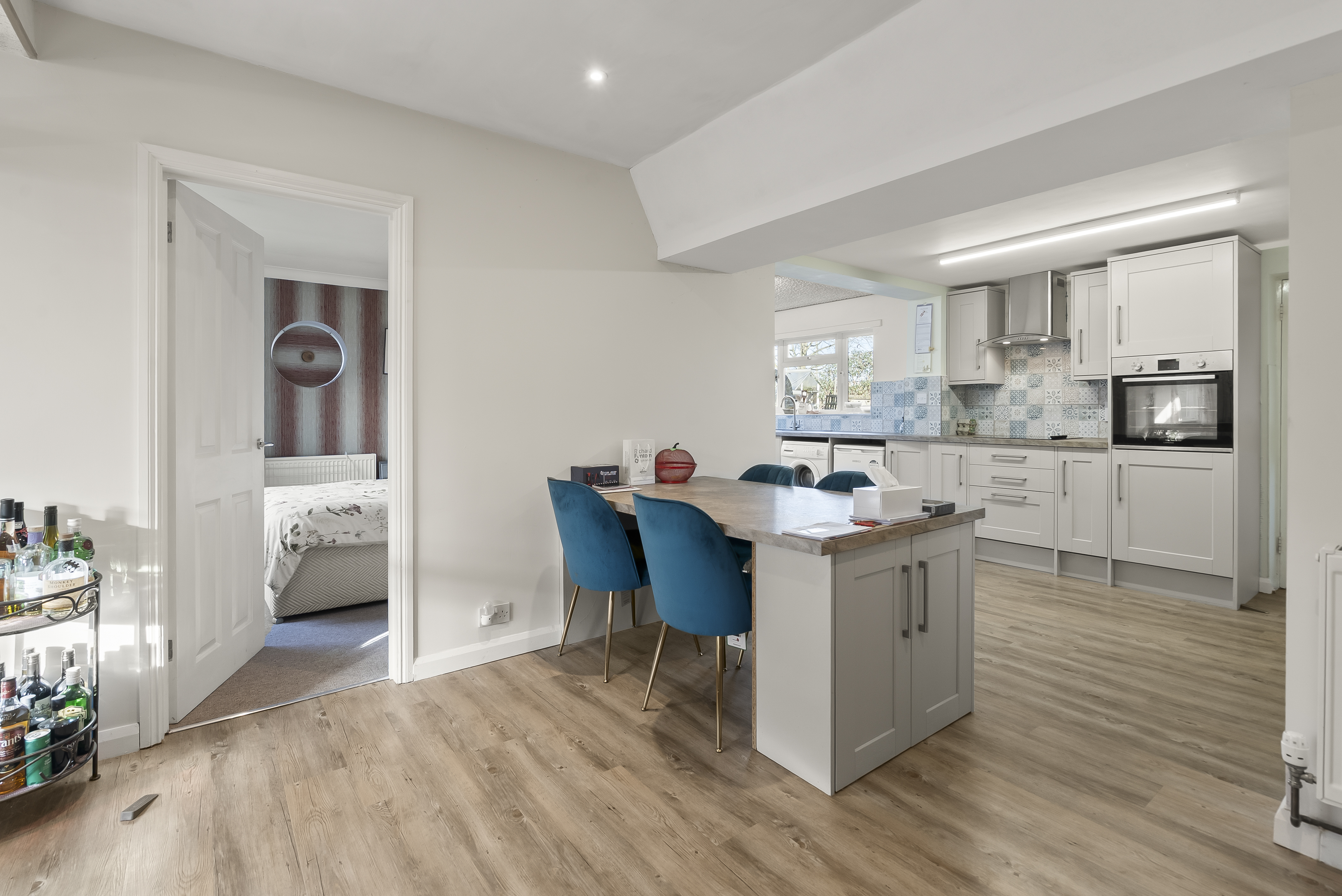 The accommodation is both comfortable and inviting, with an entrance hall opening into a cosy sitting room centred around an open fireplace. Dual-aspect windows draw in natural light throughout the day, creating a warm and welcoming space to relax, entertain or simply enjoy the changing seasons outside. The kitchen/ diner is thoughtfully arranged with a generous range of modern fitted units, integrated cooking appliances and a well-designed breakfast bar, making it a practical yet sociable hub of the home.
