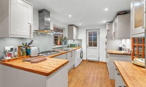 This deceptive four-bedroom, two-bathroom detached house offers generous split level living accommodation, thoughtfully arranged. To the front of the property you will find an expansive brick-paved driveway that provides ample off-road parking, leading to an integrated garage for further storage or vehicle use. Inside, each room features large picture windows, allowing an abundance of natural light, creating a warm and inviting atmosphere throughout. The sitting room with feature fireplace creates a harmonious transition leading you to the open plan kitchen and dining area with modern units, integrated appliances, and stylish wooden countertops - ideal for both family living and entertaining guests. The property also boasts a bright conservatory with wood flooring and French doors, offering seamless garden access and an ideal setting for relaxation or social gatherings.