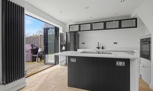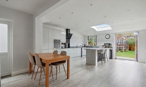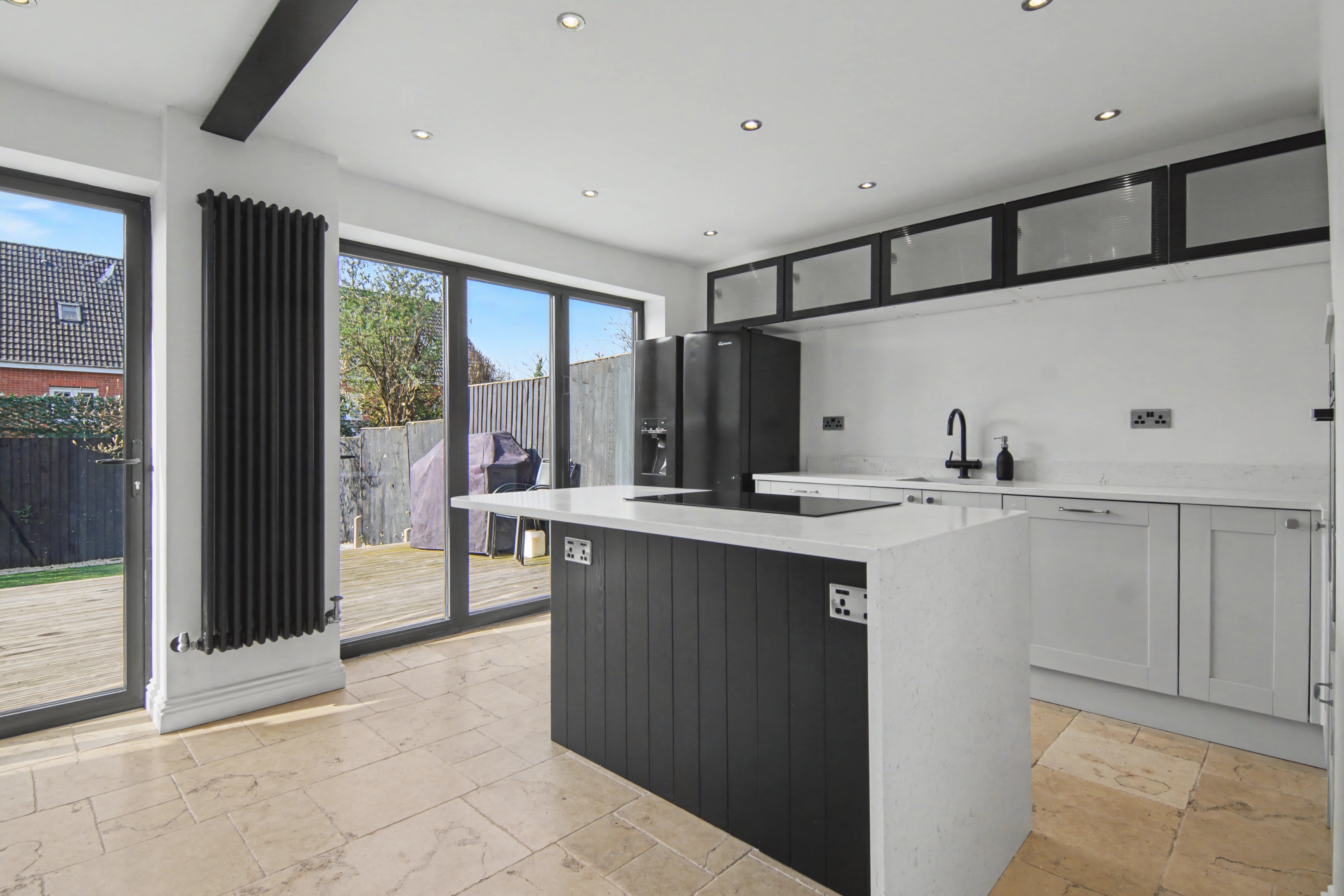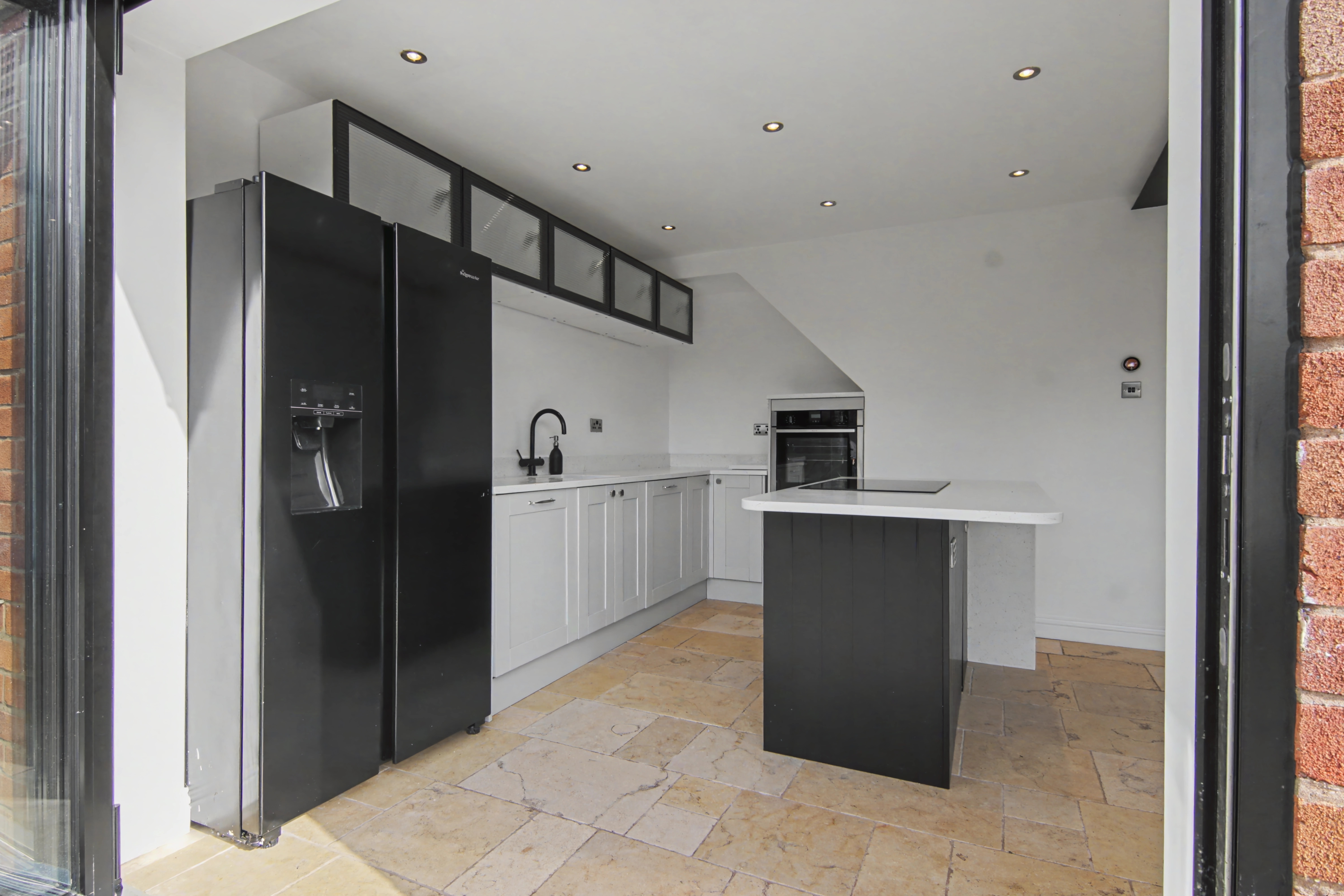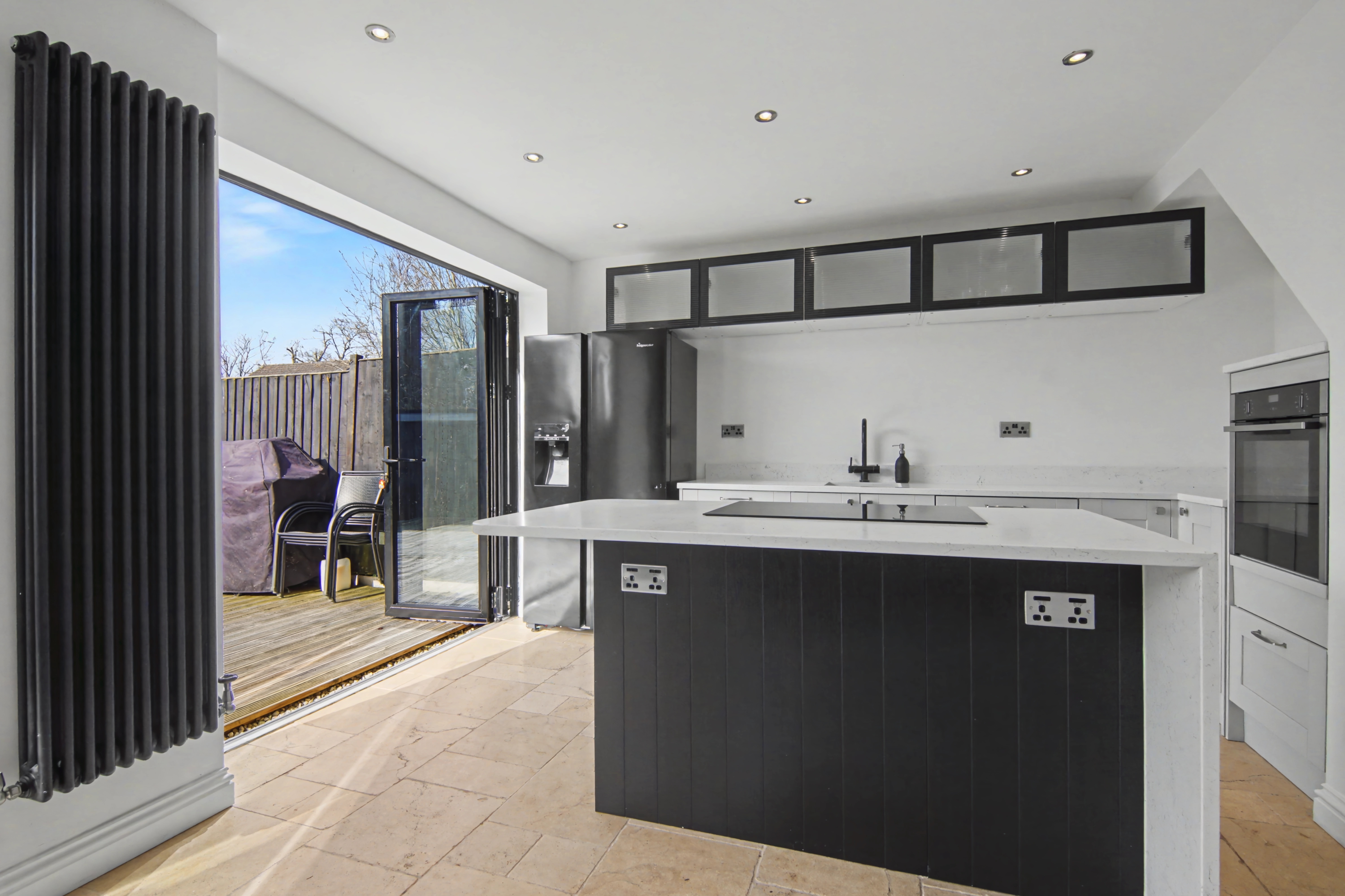 Recently refurbished throughout, the property combines contemporary design with practical living space. The heart of the home is the stunning open-plan kitchen and dining area, featuring a sleek quartz worktop island, natural stone flooring, integrated appliances, and large bi-fold doors that open directly onto the landscaped garden - creating the perfect space for entertaining or relaxed family living.