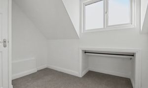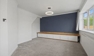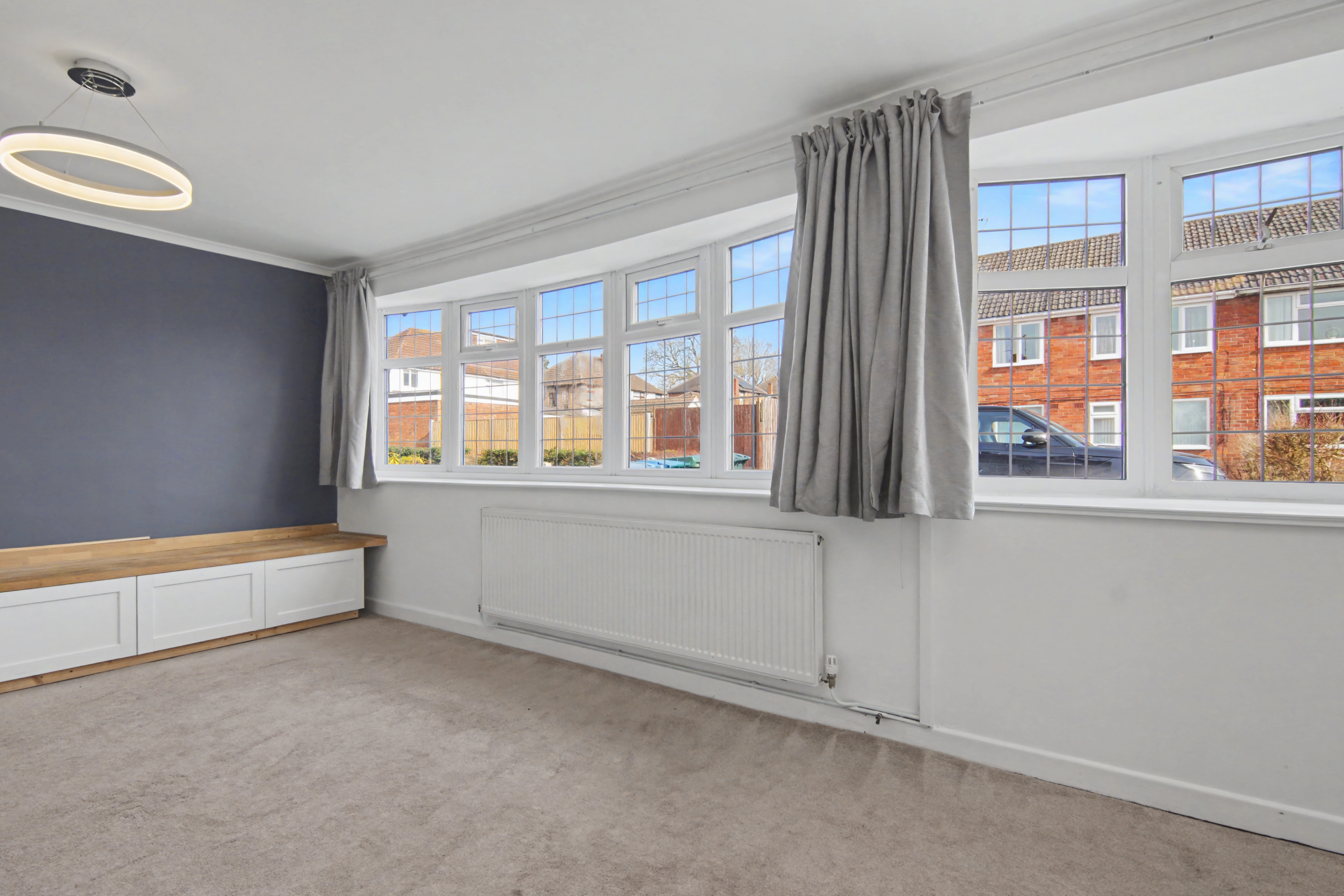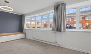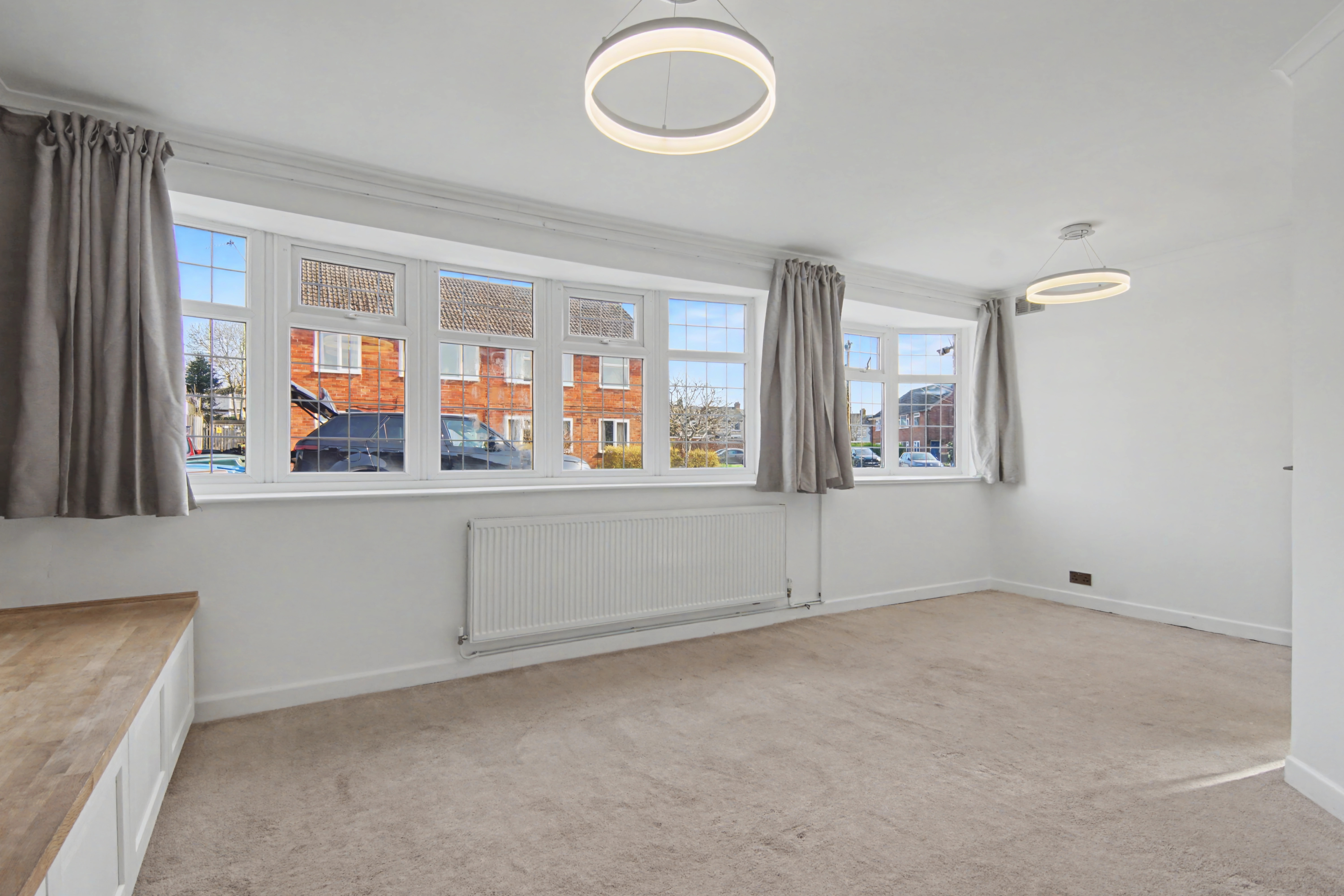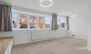 The bright and spacious living room benefits from large front windows allowing plenty of natural light, complemented by new flooring and fresh plasterwork throughout the property.