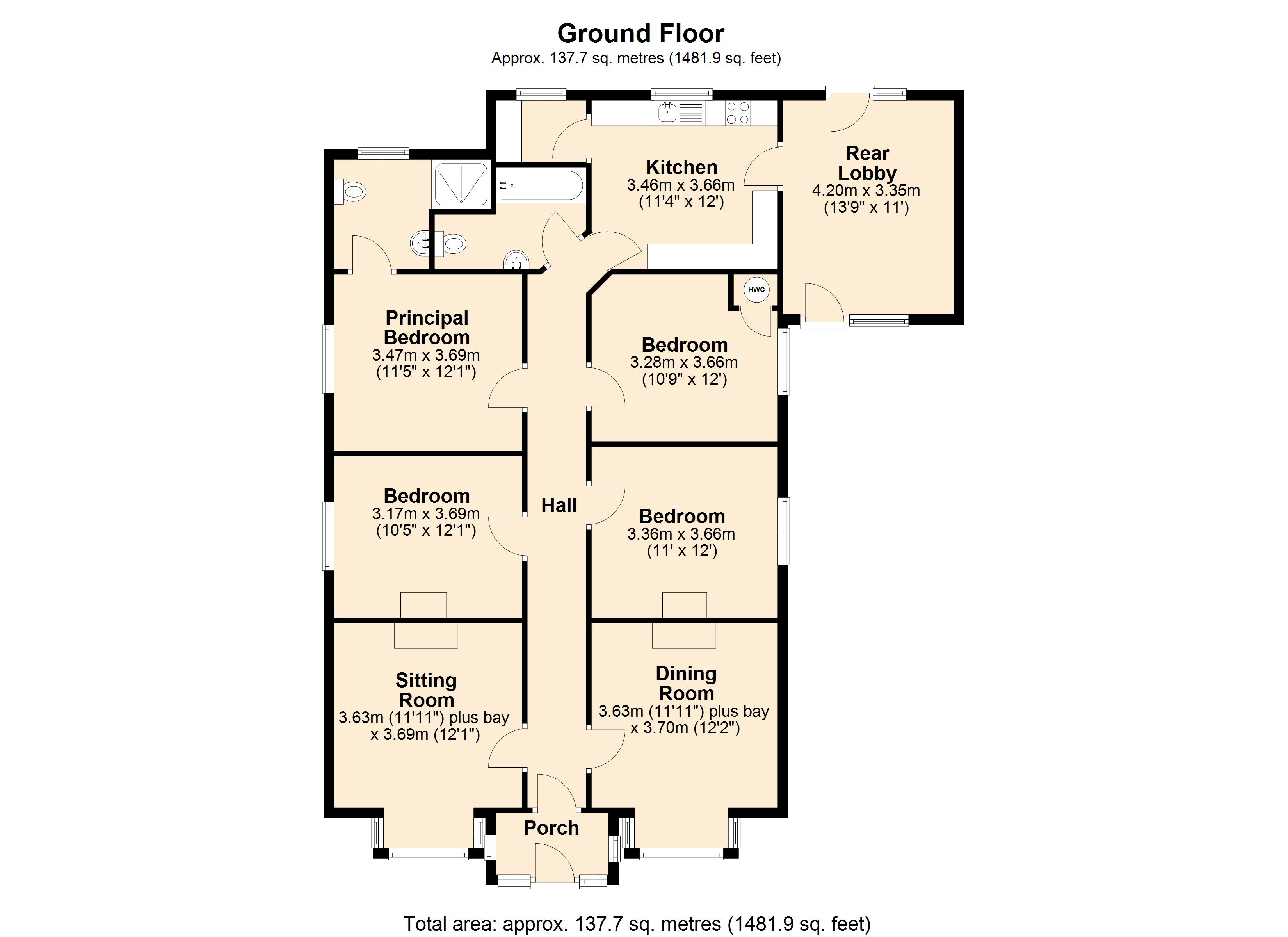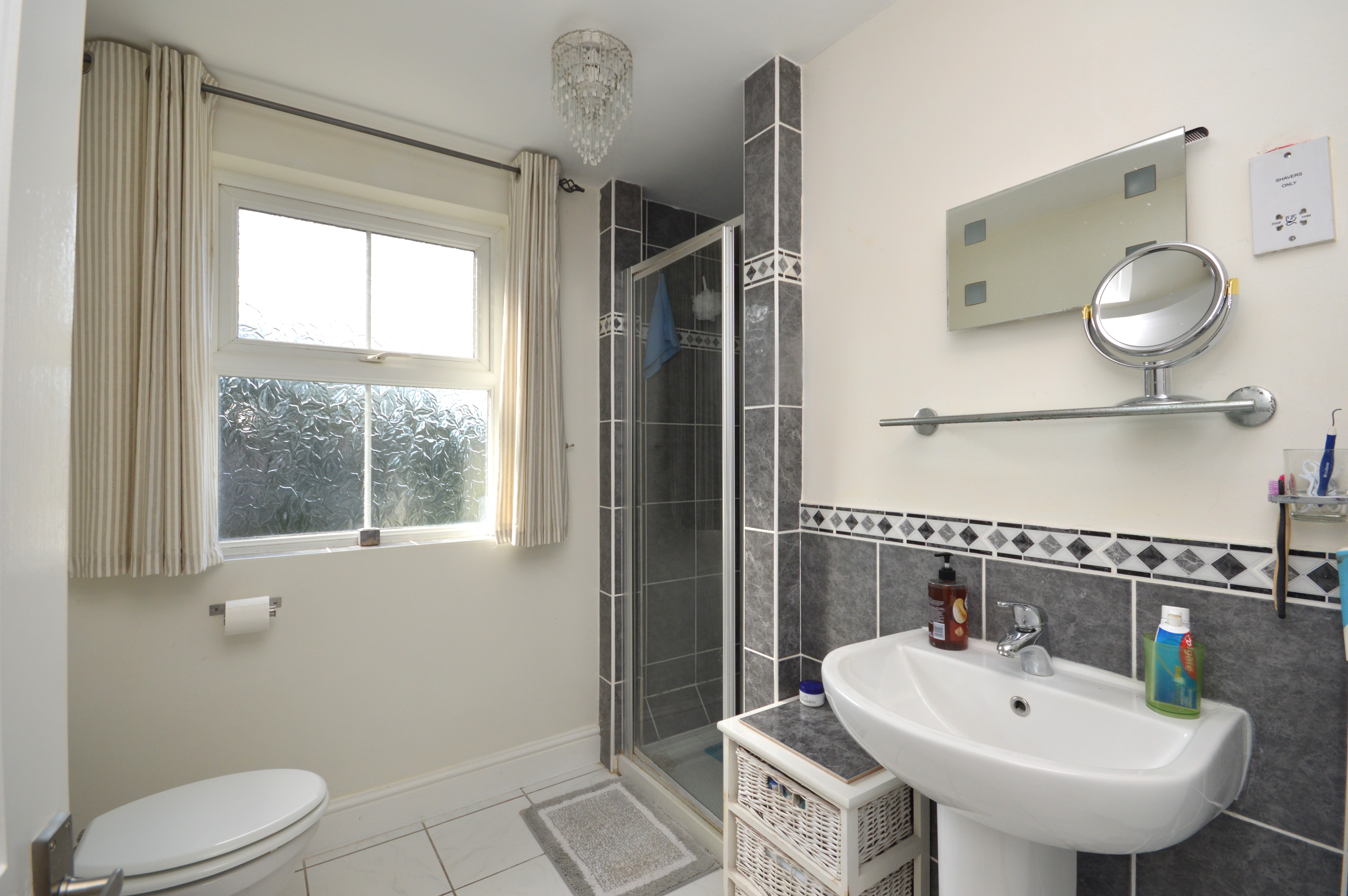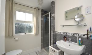 UPVC double glazed frosted window to the rear or the property. Large walk-in shower with electric shower. Pedestal hand basin, closed coupled WC, radiator with separate electric heated towel rail, tiled flooring, part tiled walls and an extractor fan.