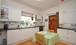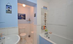 UPVC double glazed window overlooking the rear garden. Matching wall and base units in white with porcelain sink. Space for a freestanding oven. Extractor fan, Engineered oak flooring and loft hatch. Door To :-