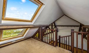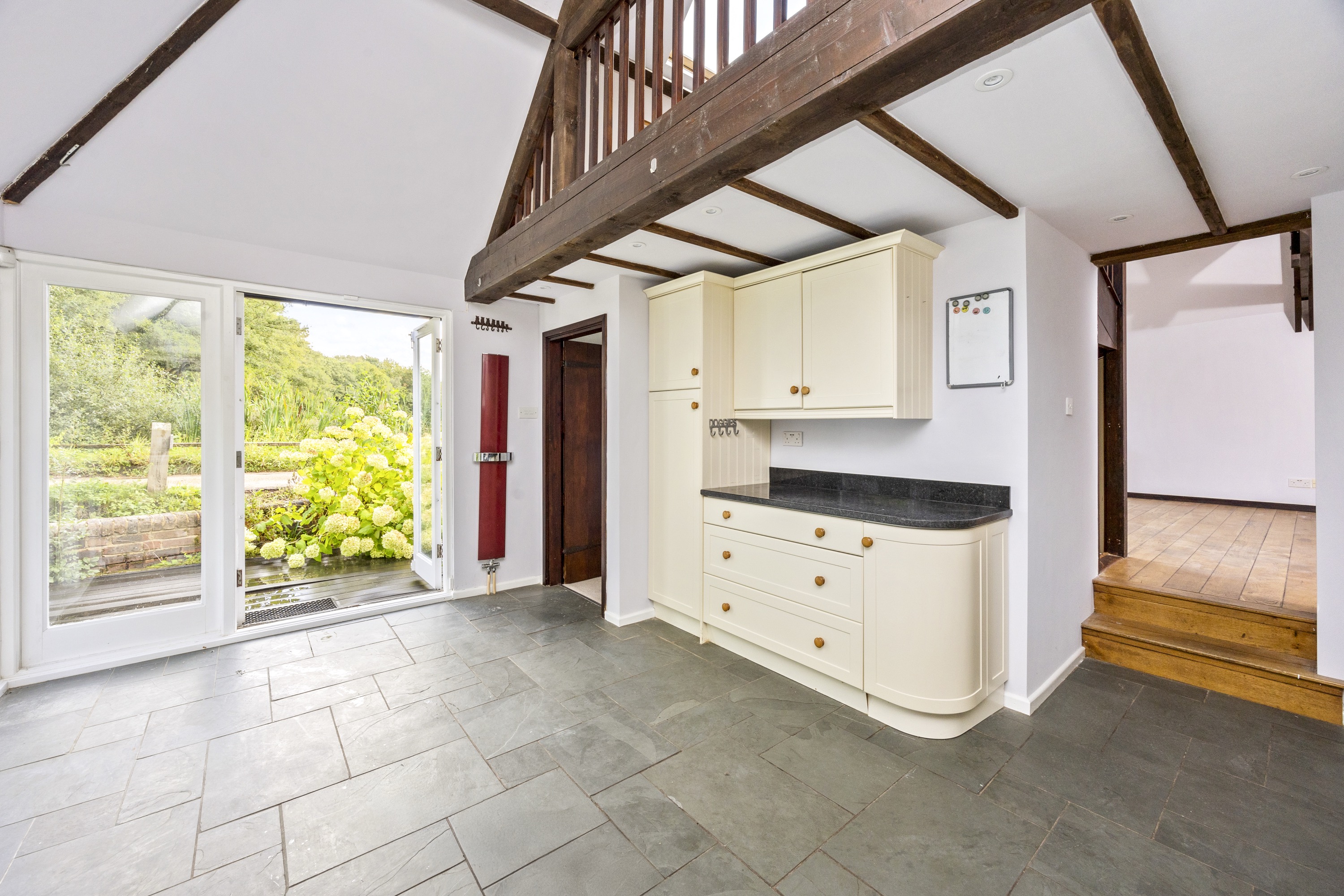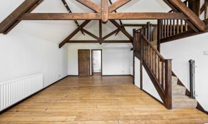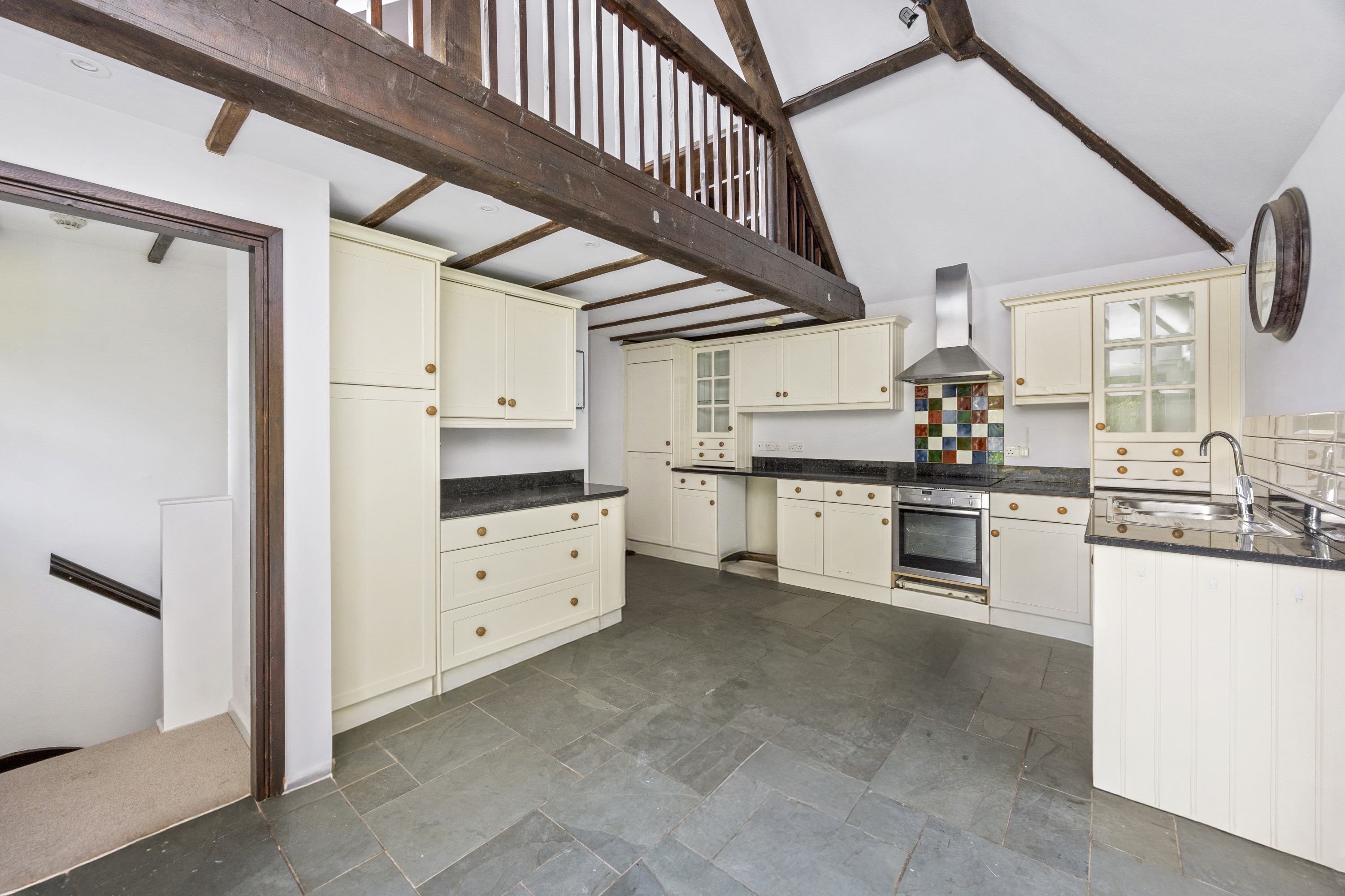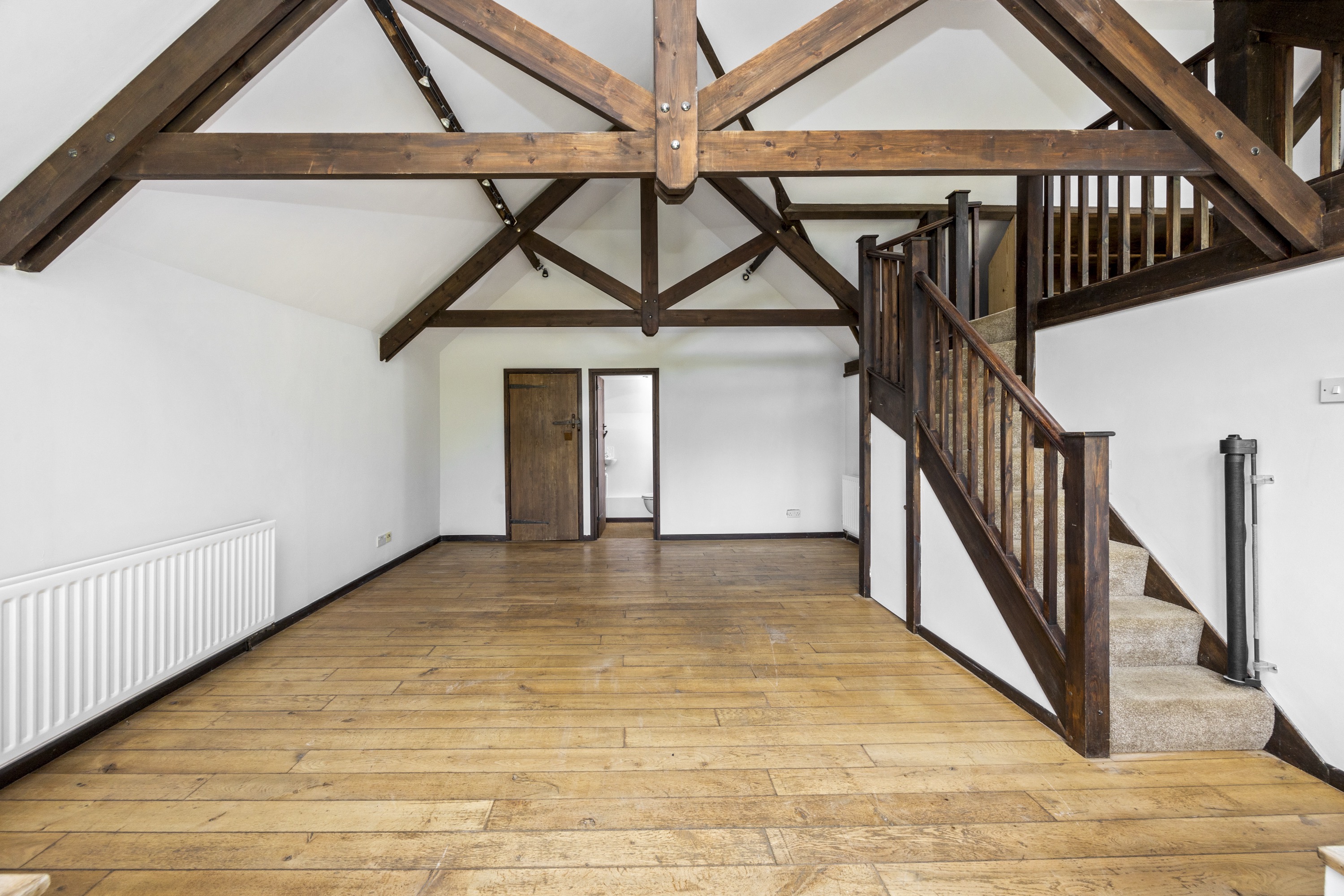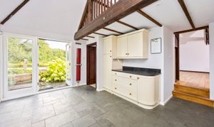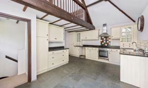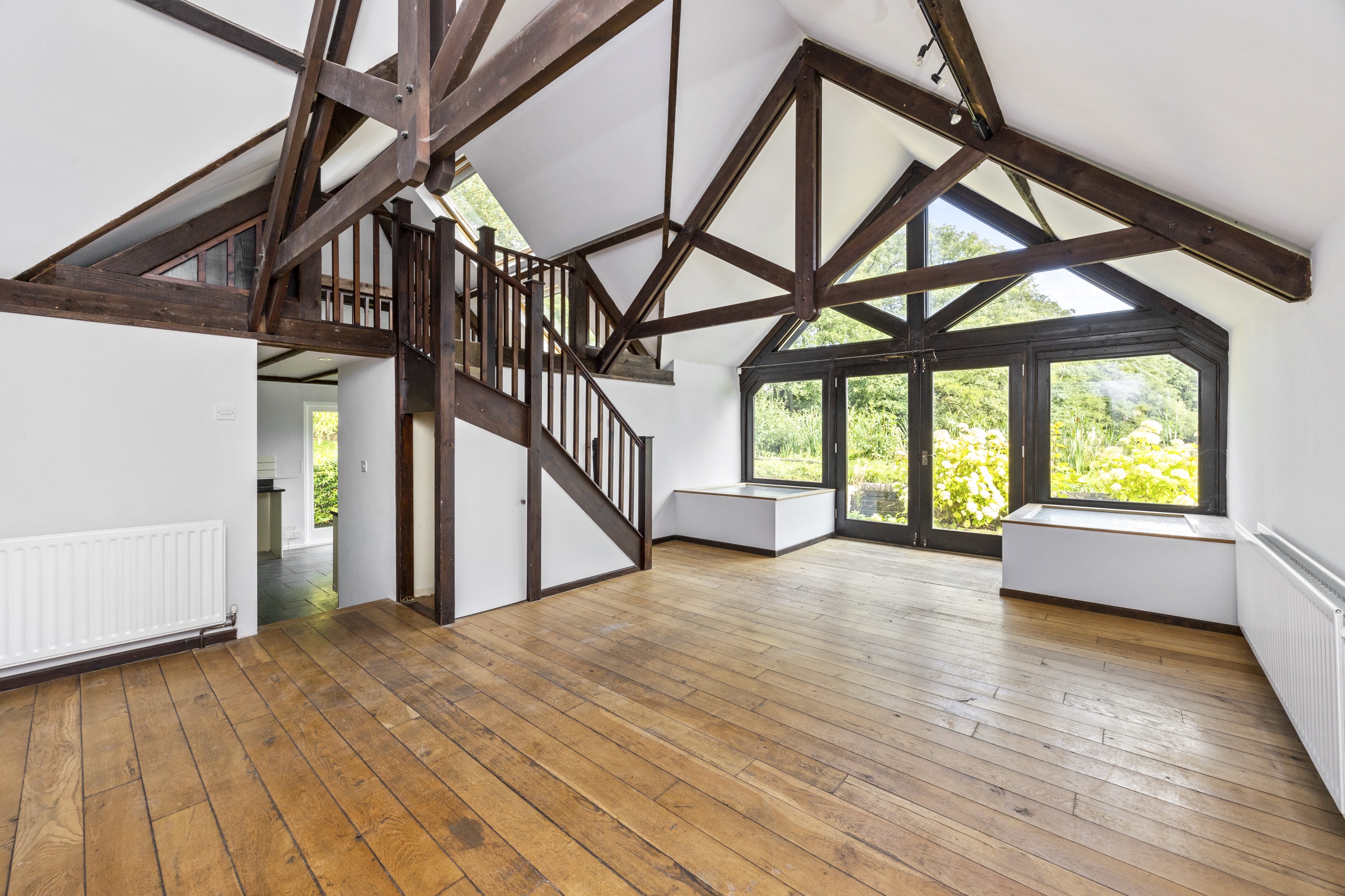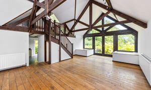 From the kitchen, a striking staircase leads to a mezzanine study area, which provides an excellent vantage point overlooking both the kitchen and the sitting room. This gallery-style space offers the ideal setting for home working, a library, or a quiet retreat, and is complemented by a cloakroom and a useful store cupboard. The sitting room itself is full of charm and warmth, with exposed beams and generous proportions, making it an inviting place to relax and unwind.