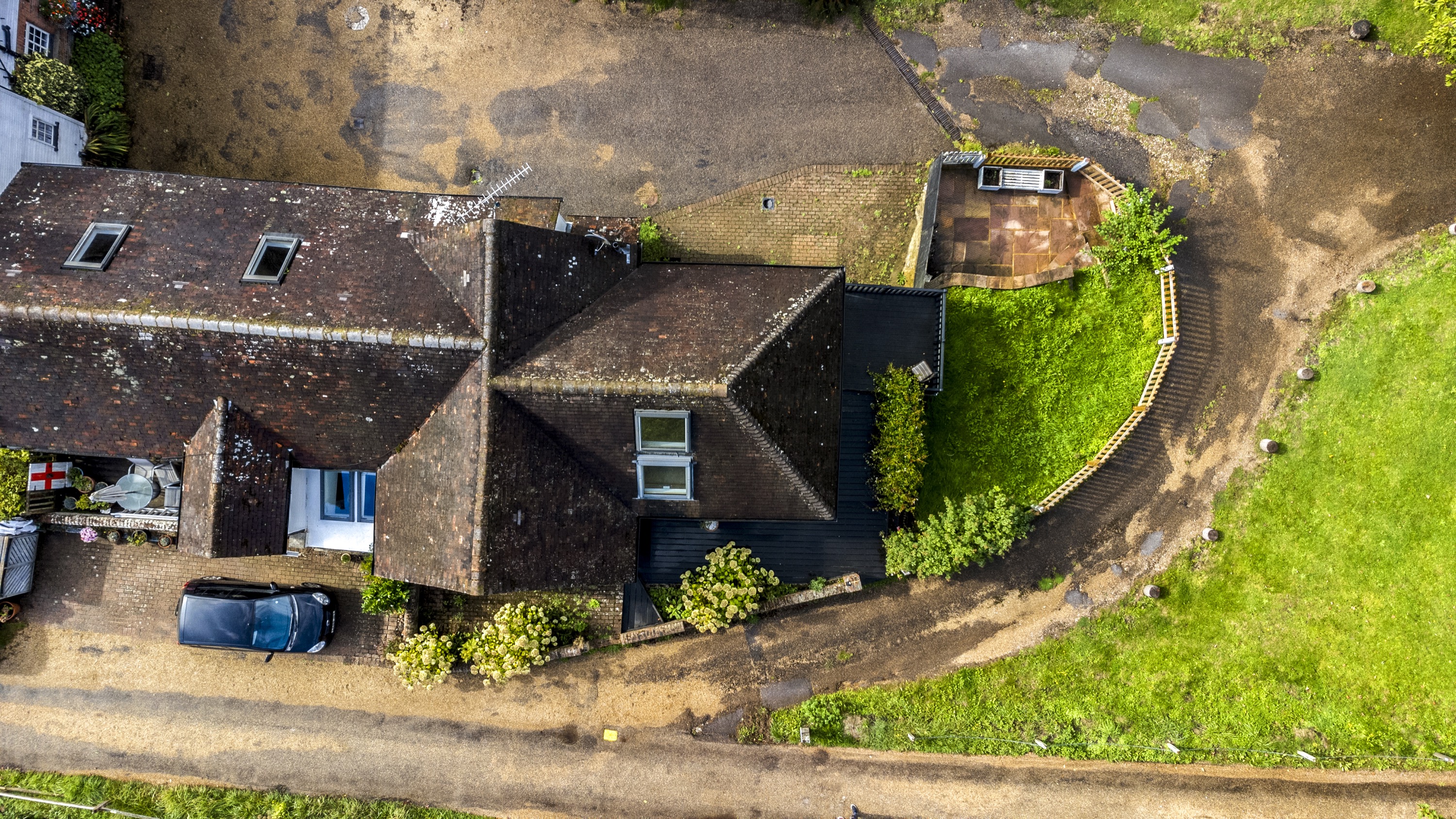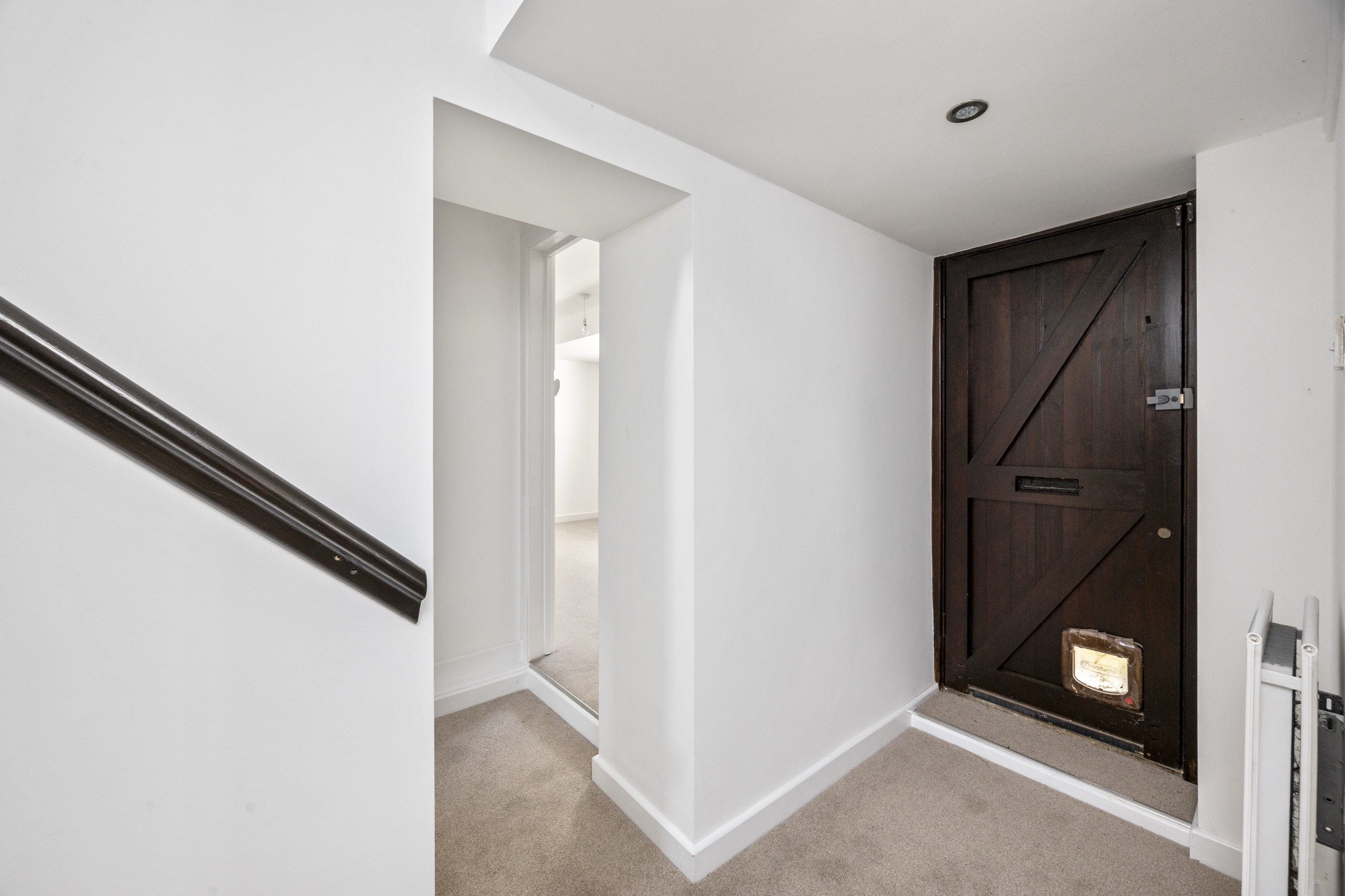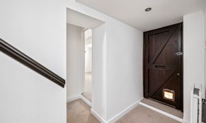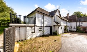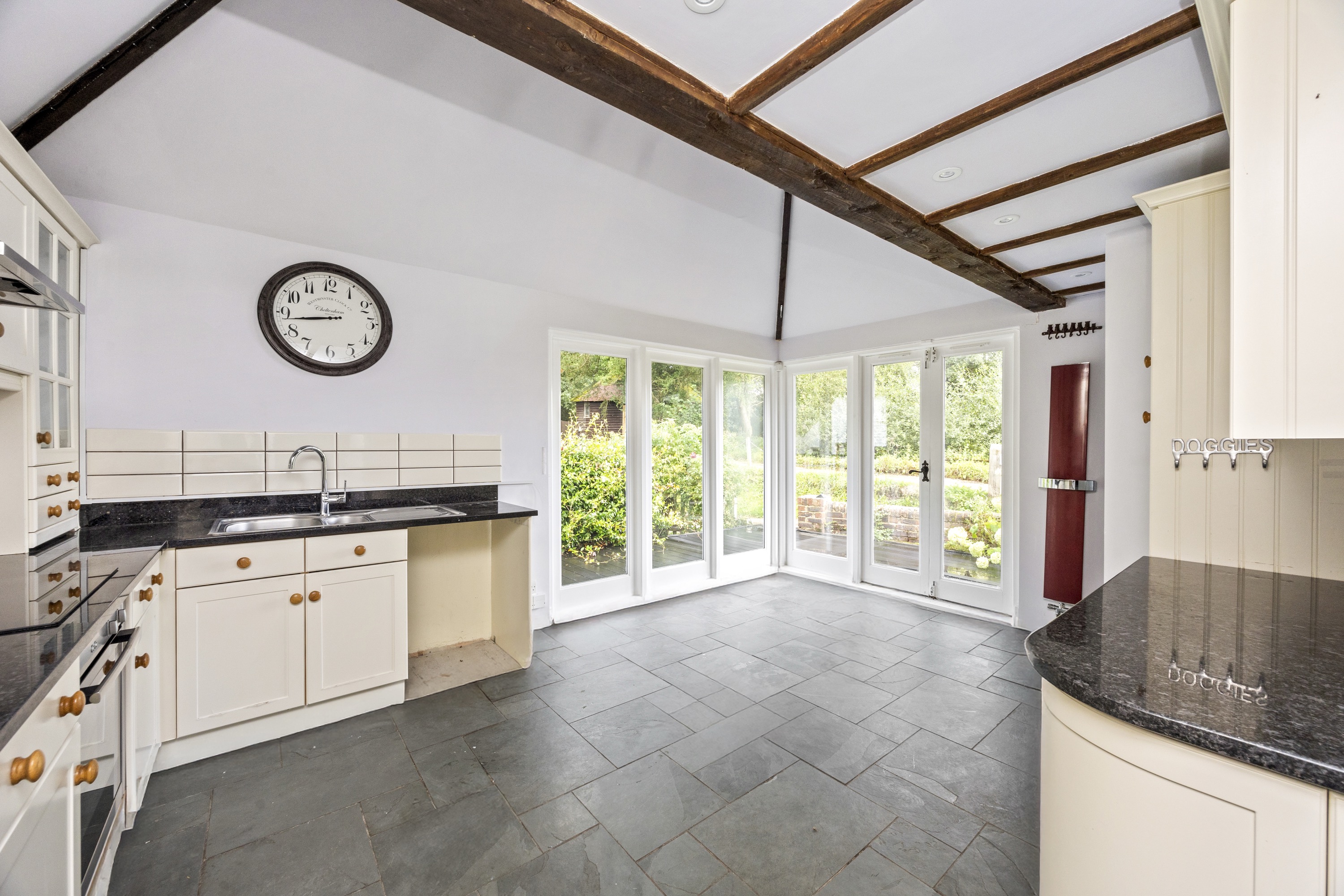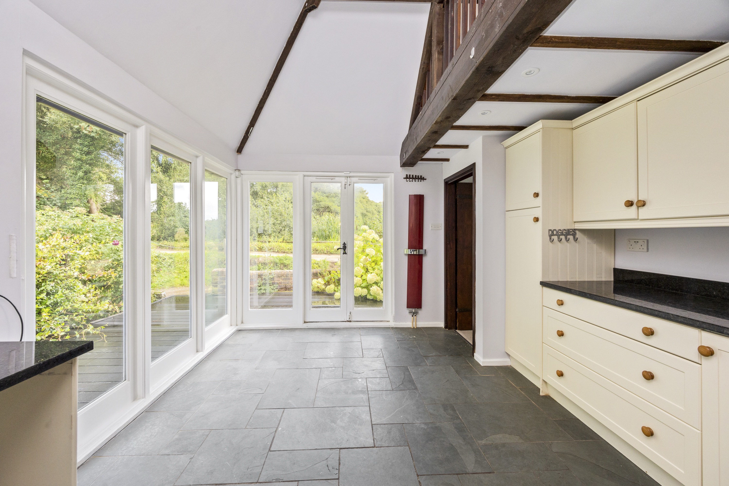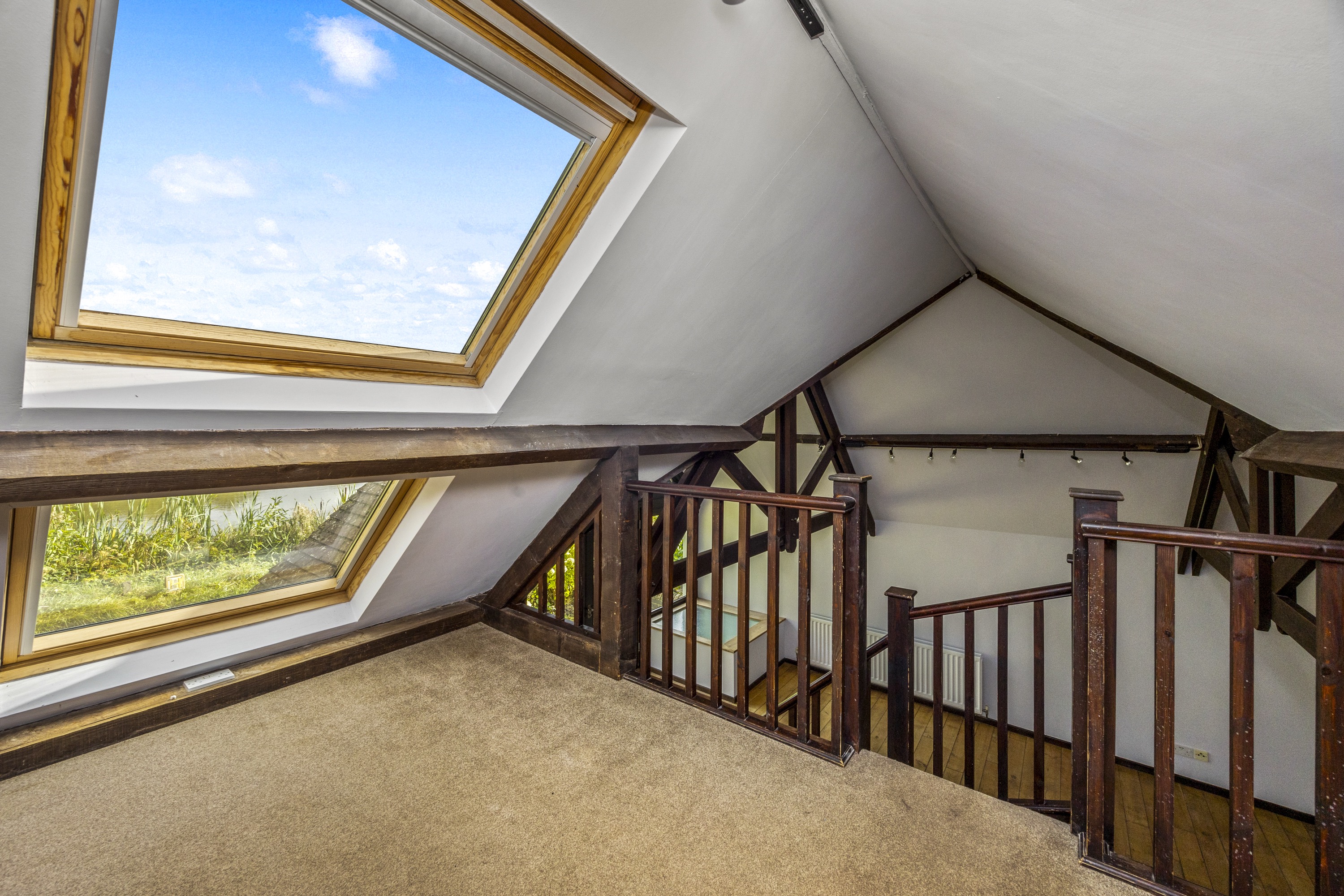 From the kitchen, a striking staircase leads to a mezzanine study area, which provides an excellent vantage point overlooking both the kitchen and the sitting room. This gallery-style space offers the ideal setting for home working, a library, or a quiet retreat, and is complemented by a cloakroom and a useful store cupboard. The sitting room itself is full of charm and warmth, with exposed beams and generous proportions, making it an inviting place to relax and unwind.