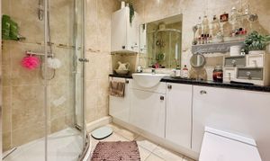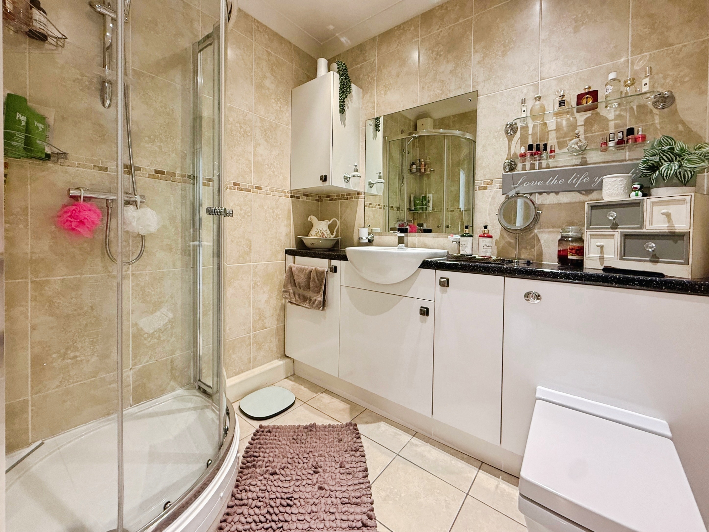 Tiled flooring, fully tiled walls, corner shower, combination vanity unit with wash hand basin, storage and WC with concealed cistern, heated towel rail.