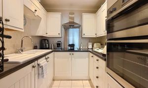 Tiled flooring, range of matching wall and base units, in-built double oven at head height, integrated dishwasher, one and a quarter bowl ceramic sink with side drainer, integrated electric induction hob with cooker hood over.