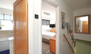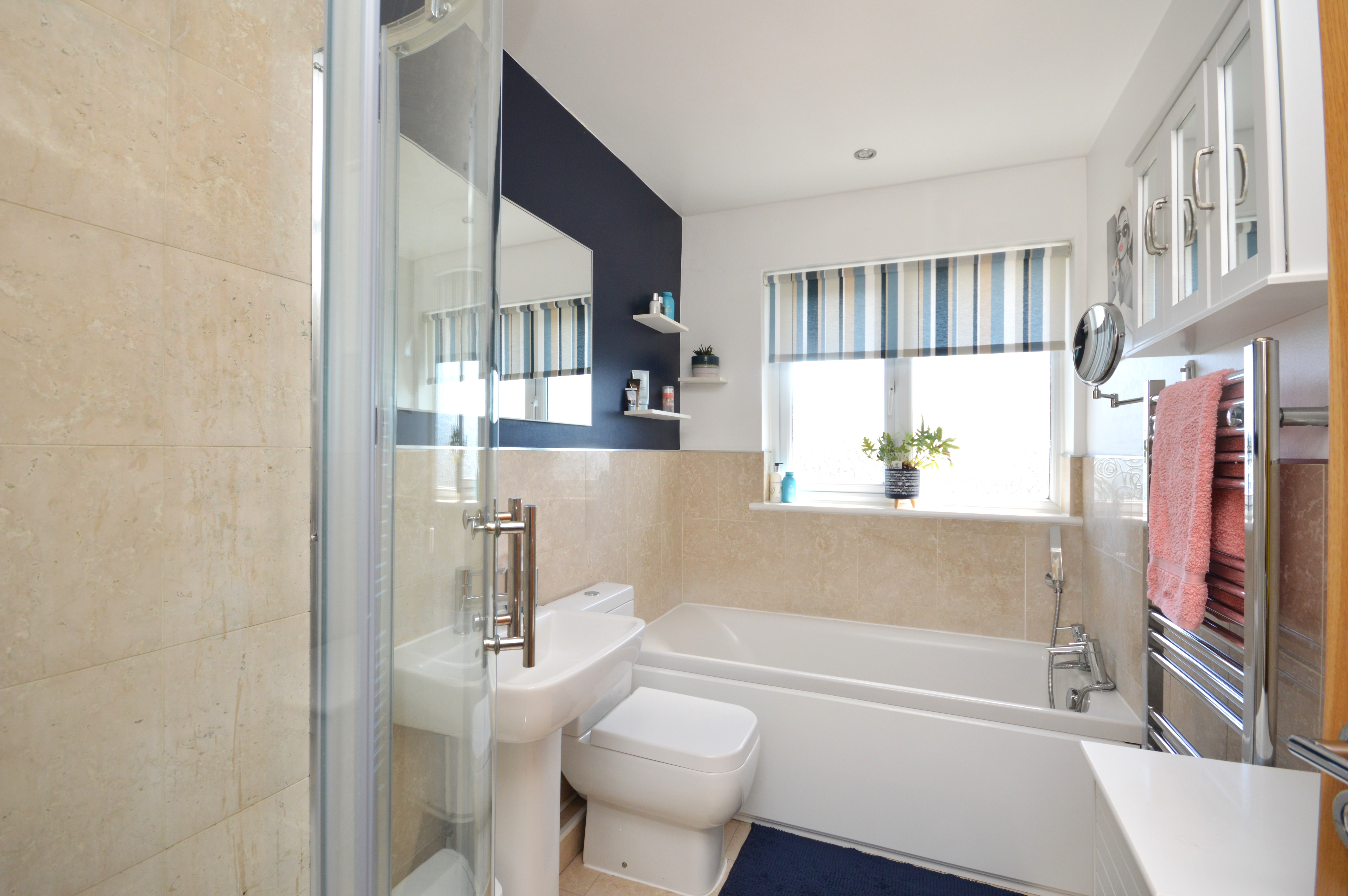 UPVC double glazed frosted window to the front of the property with a roller blind. Bath with shower mixer taps, separate thermostatic shower. Close coupled WC, pedestal hand basin, tiled flooring, part tiled walls, heated towel rail and a large mirror.