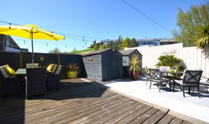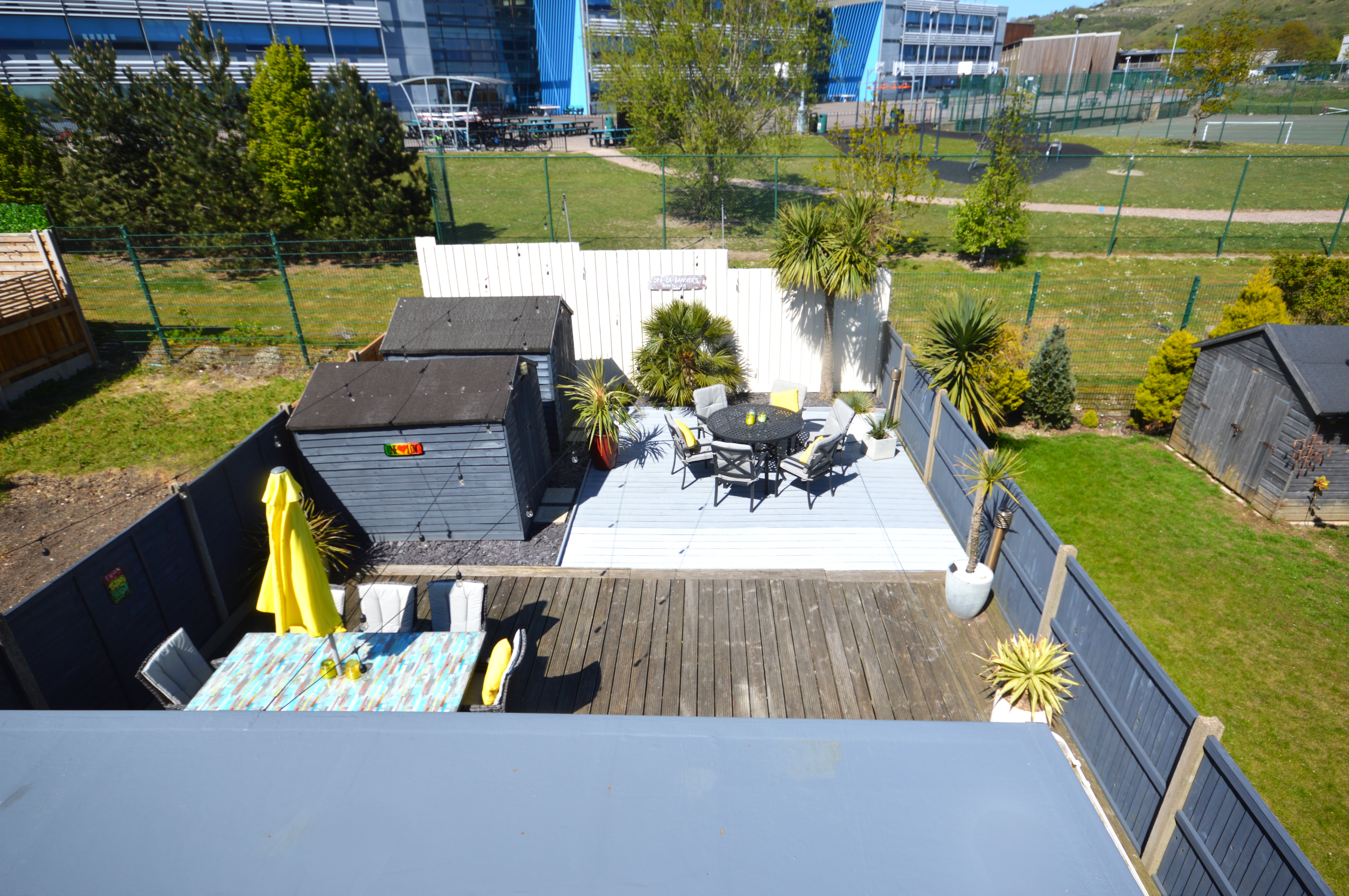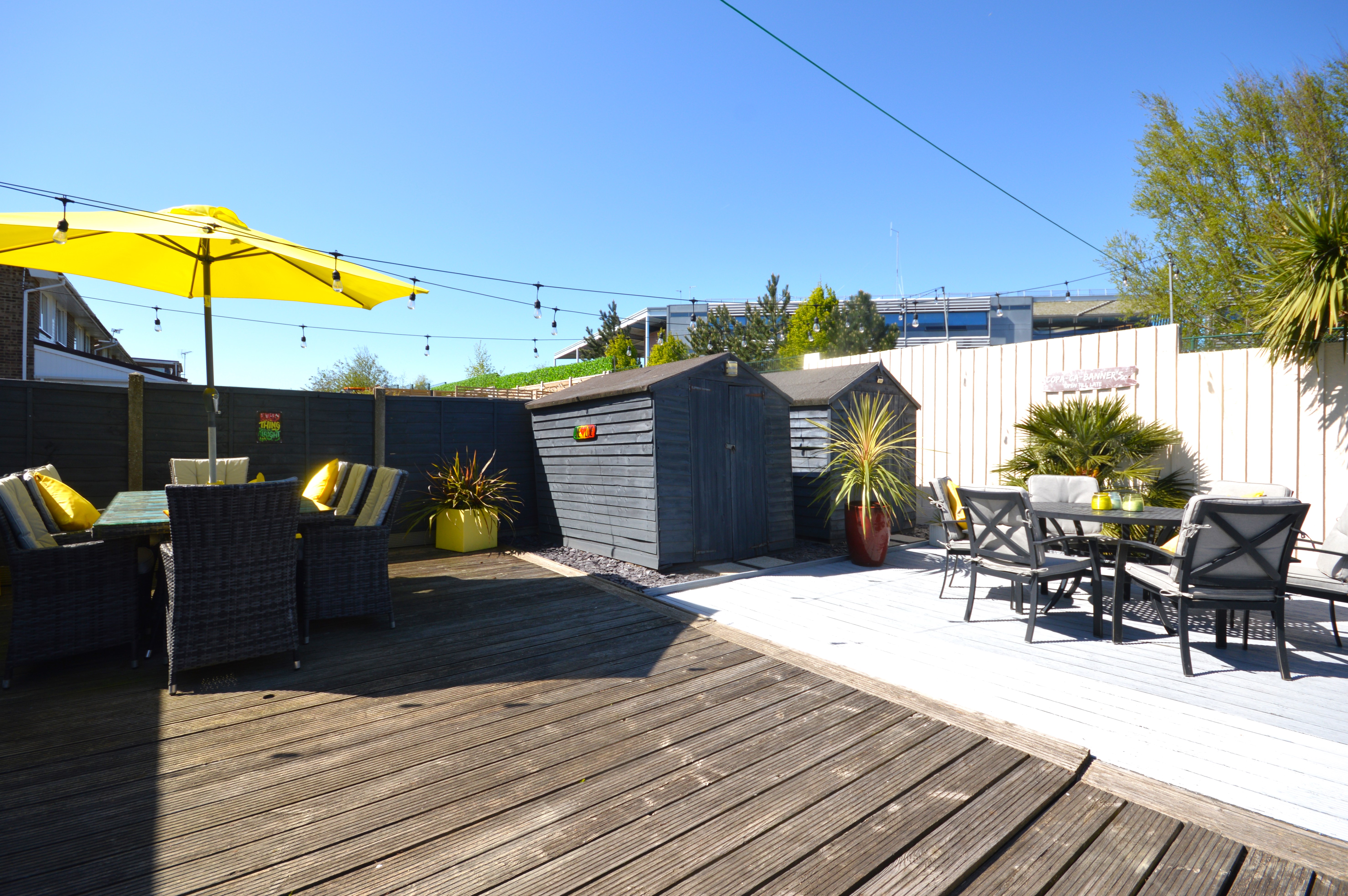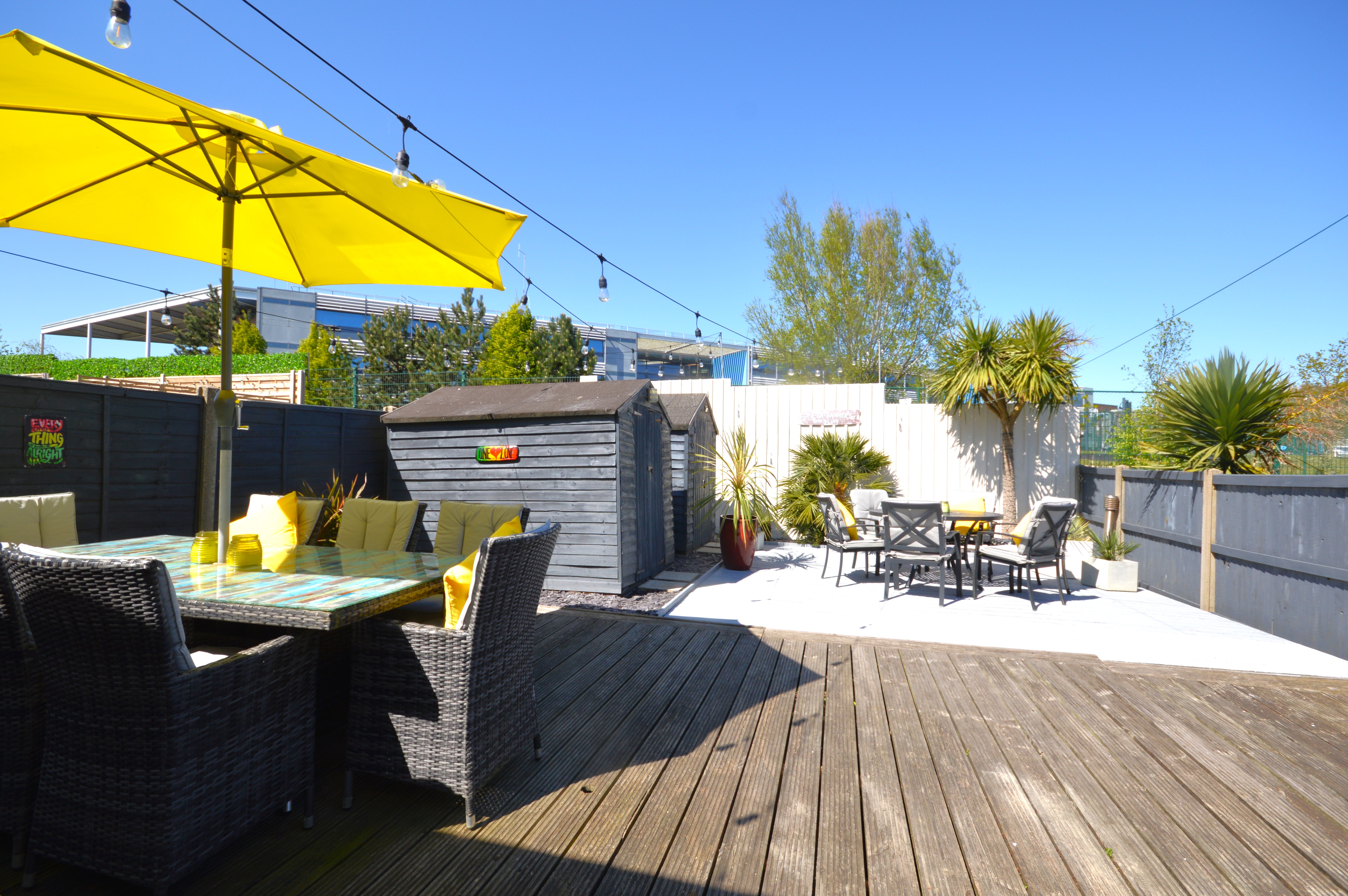 Exiting out from the kitchen is a low maintenance garden consisting of large decking area as you exit out currently laid out with table and chairs. Small area to the side laid with shingle/stone. Small step up to another raised decking area also currently laid out with table and chairs. Area at the far end of the garden with two well established palm trees and outside lights around the garden. Two outside sheds one with electric supply. Outside tap also.