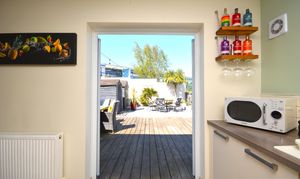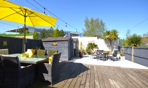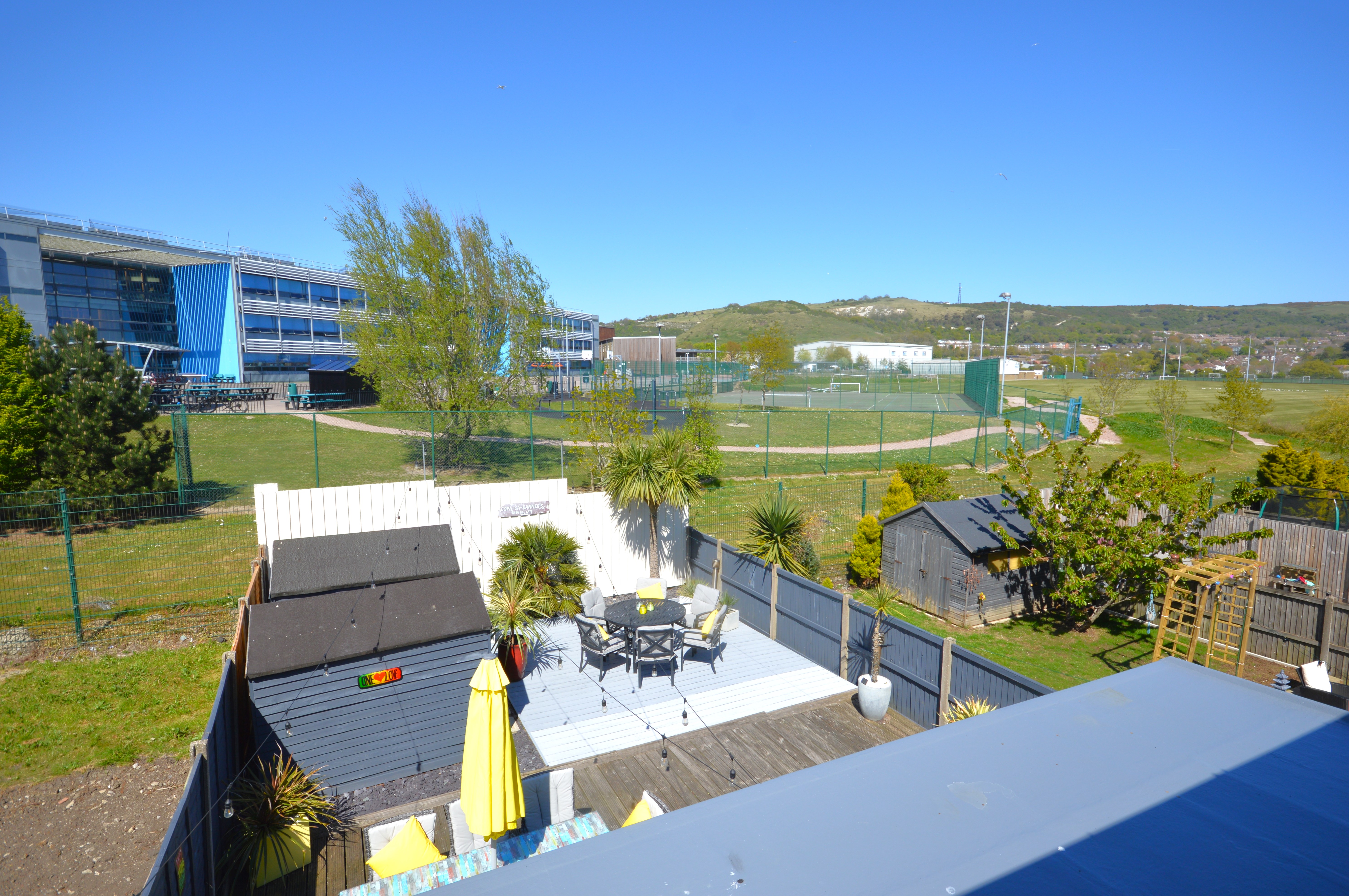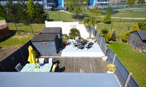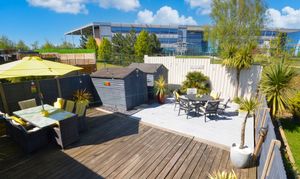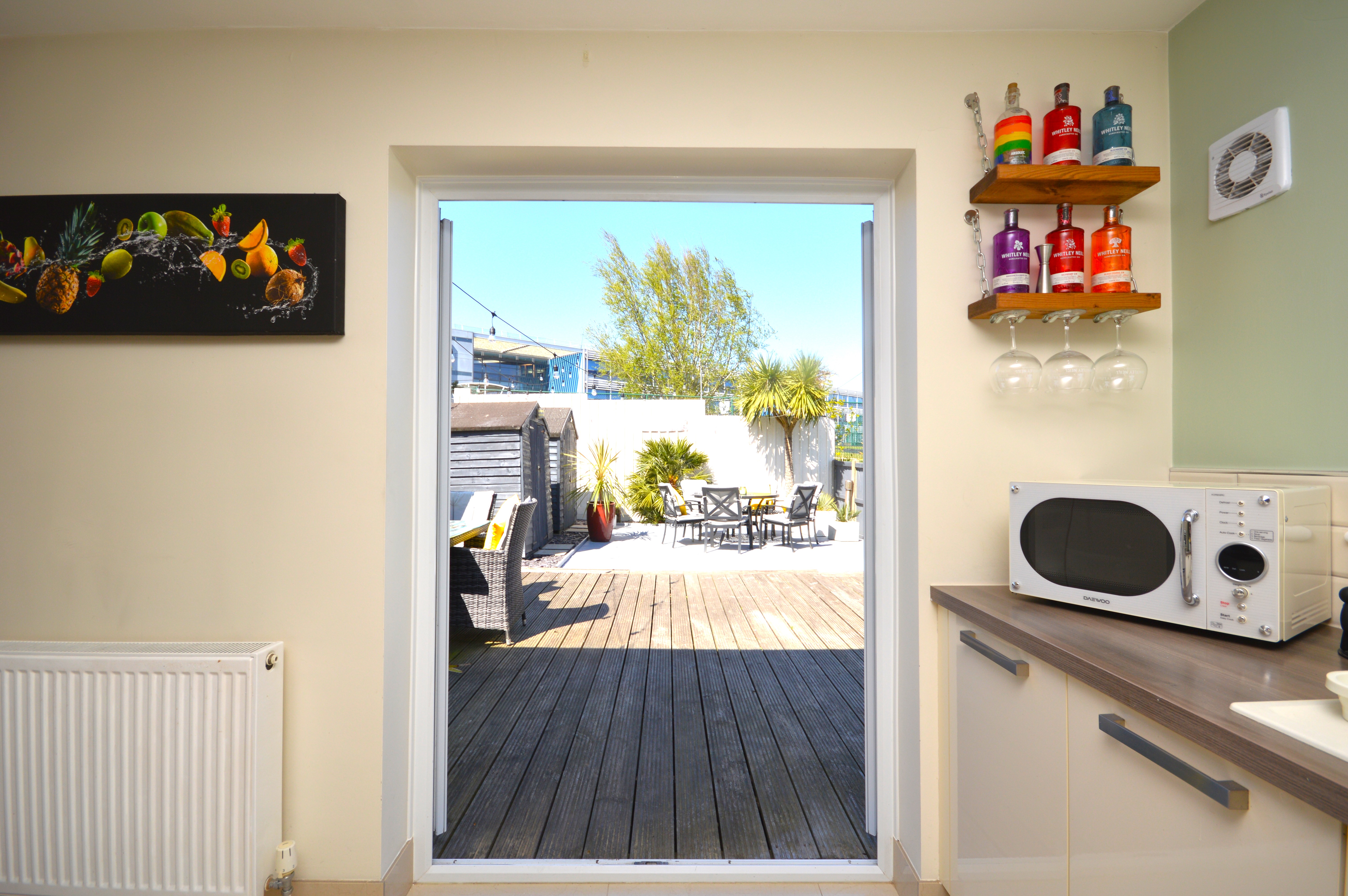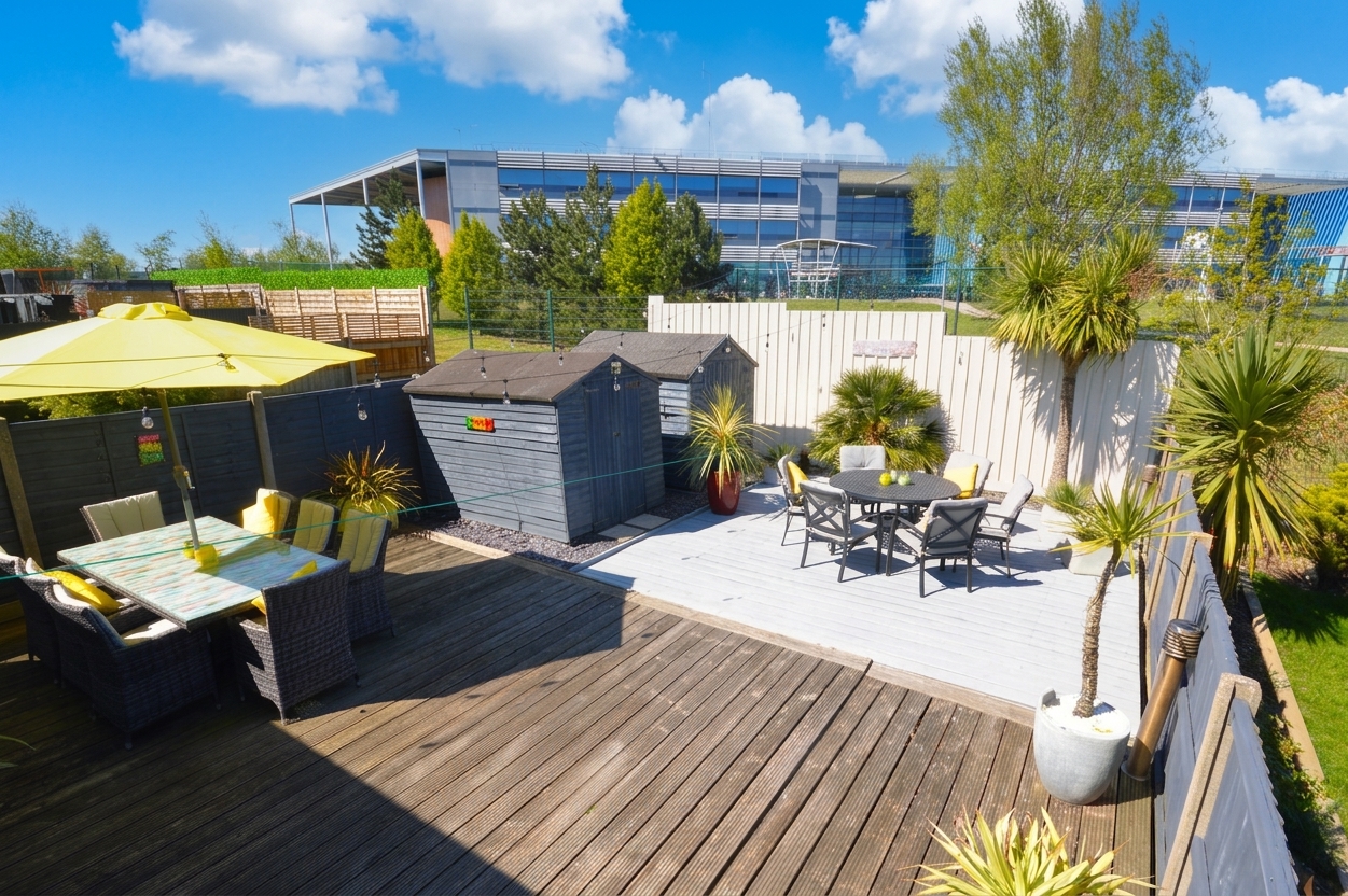 Exiting out from the kitchen is a low maintenance garden consisting of large decking area as you exit out currently laid out with table and chairs. Small area to the side laid with shingle/stone. Small step up to another raised decking area also currently laid out with table and chairs. Area at the far end of the garden with two well established palm trees and outside lights around the garden. Two outside sheds one with electric supply. Outside tap also.