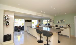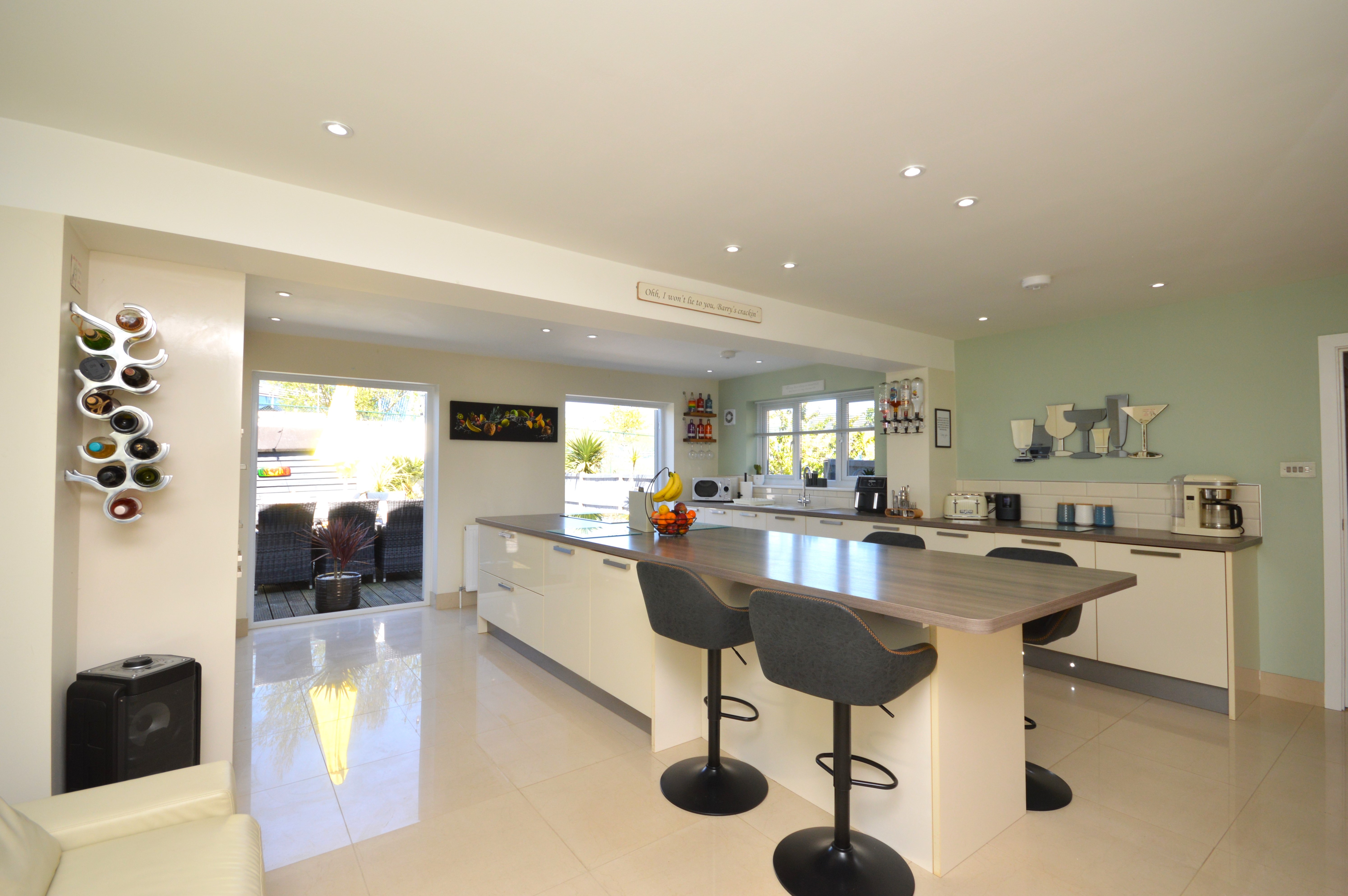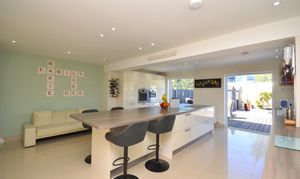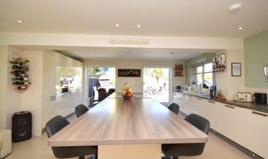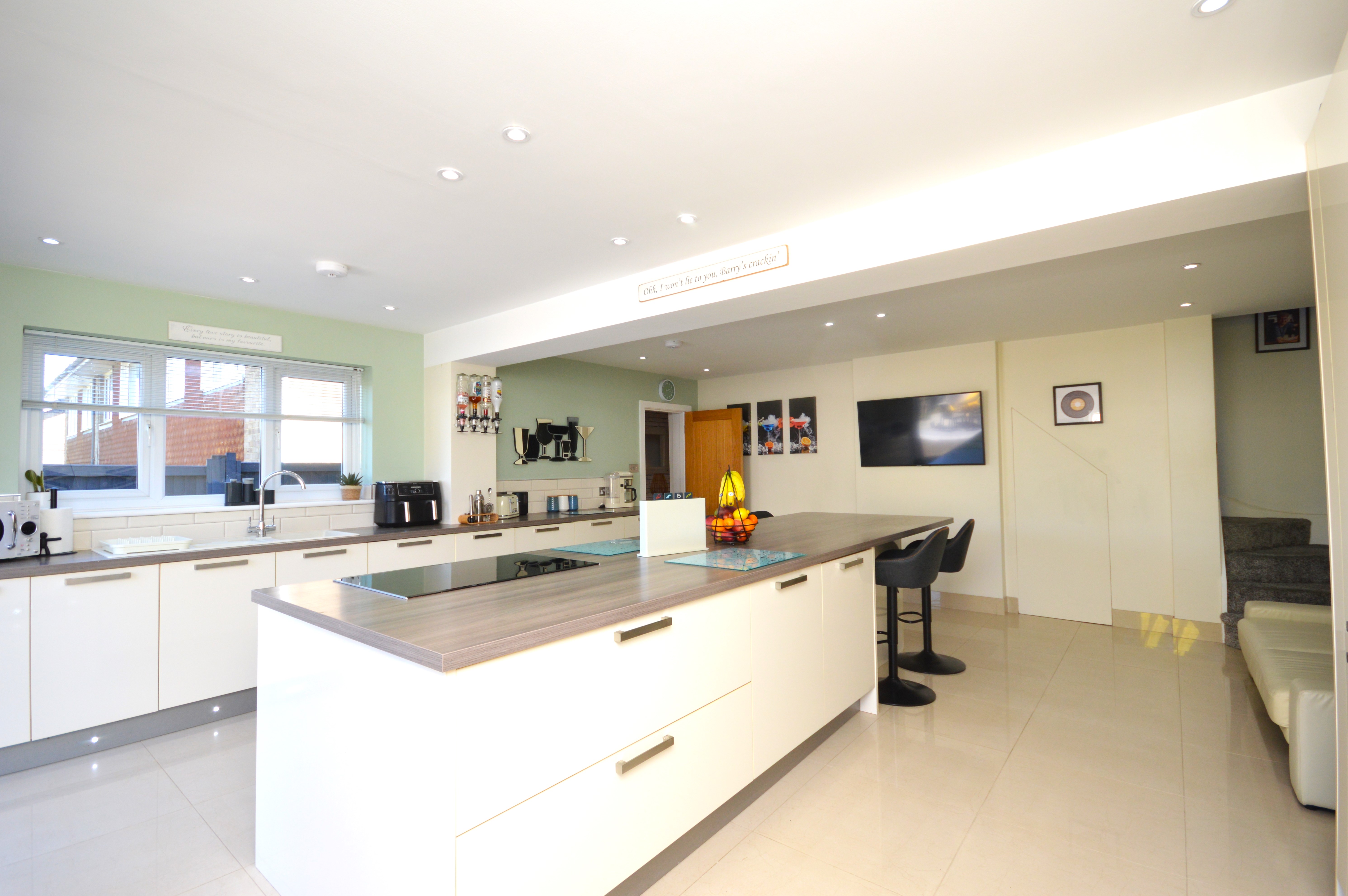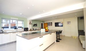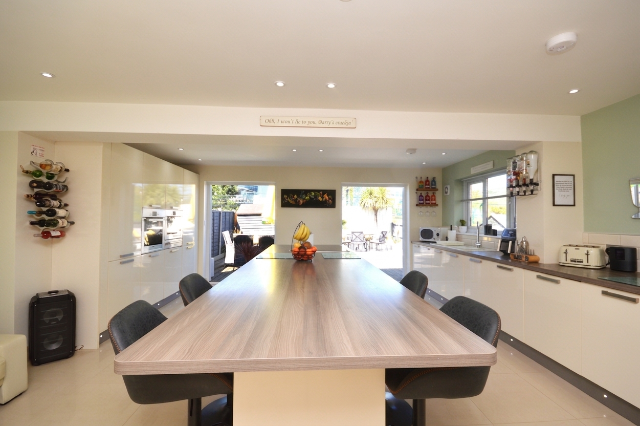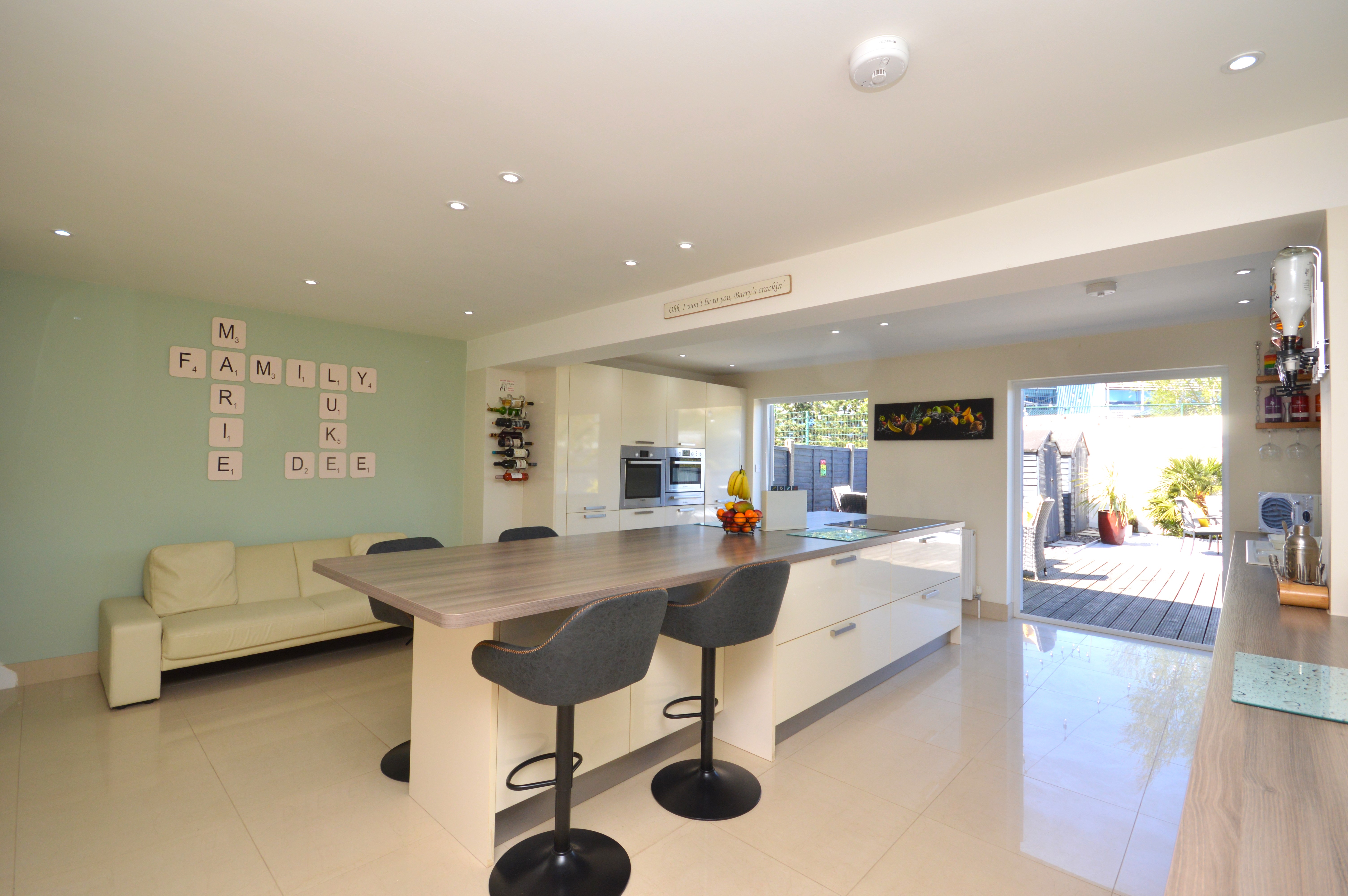 Lovely bright open plan room with a German fitted kitchen and high gloss wall and base units. Integrated Bosch oven, microwave and plate warming drawer. Bosch induction hob, integrated large fridge, integrated low level freezer. Integrated washing machine, Integrated dishwasher and composite sink, Pair of UPVC double glazed patio doors with integrated blinds leading out to the garden idea for family parties or social gatherings. UPVC double glazed window to the side. Tiled splash backs, porcelain floor tiles and two radiators. Space for sofa and breakfast bar area big enough for 6 stools. Stairs leading to first floor landing and storage cupboard under the stairs.