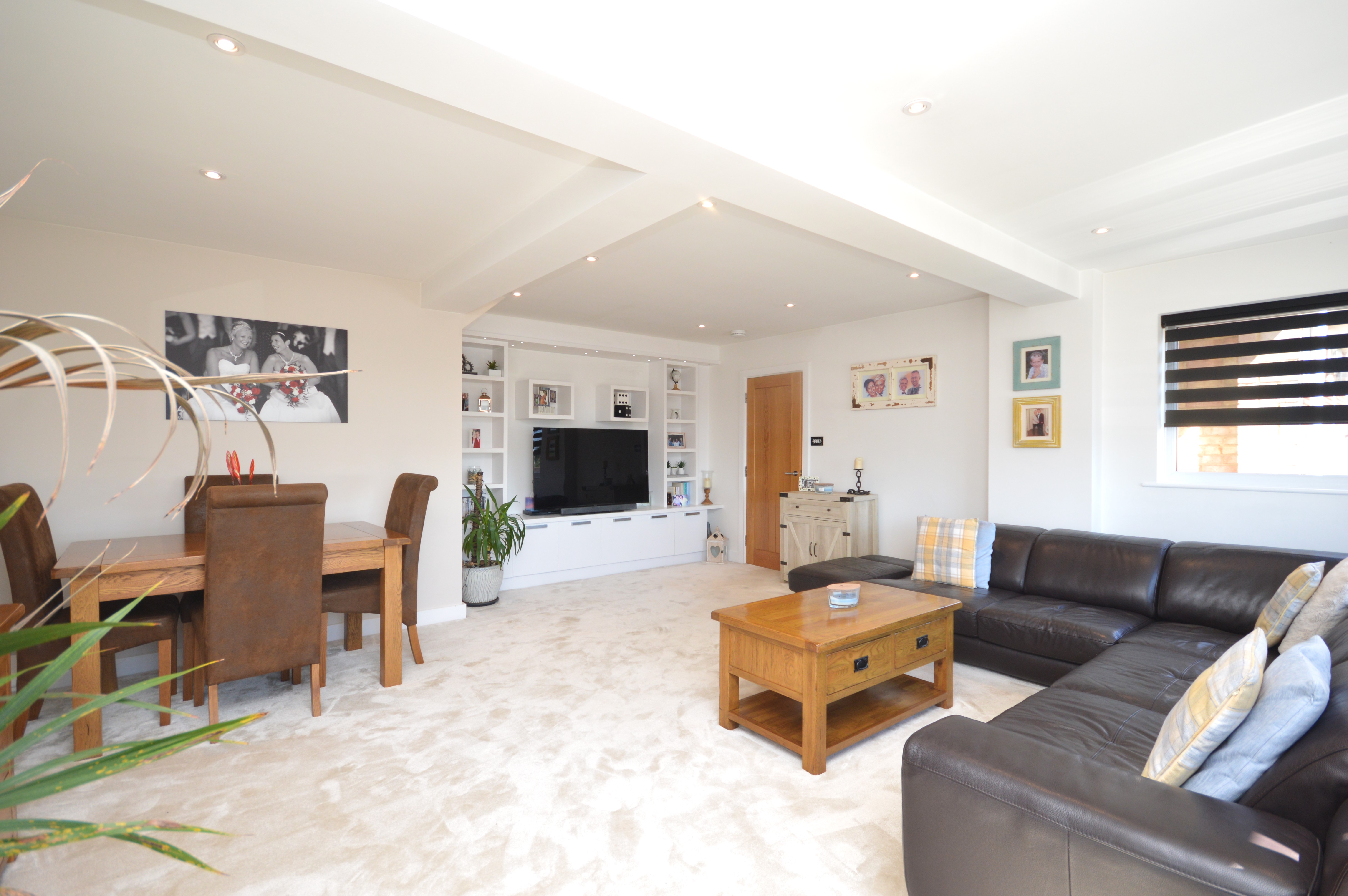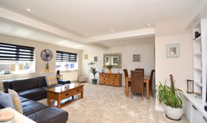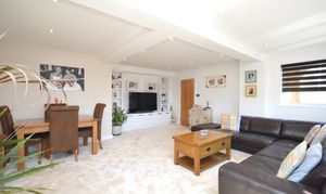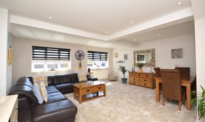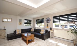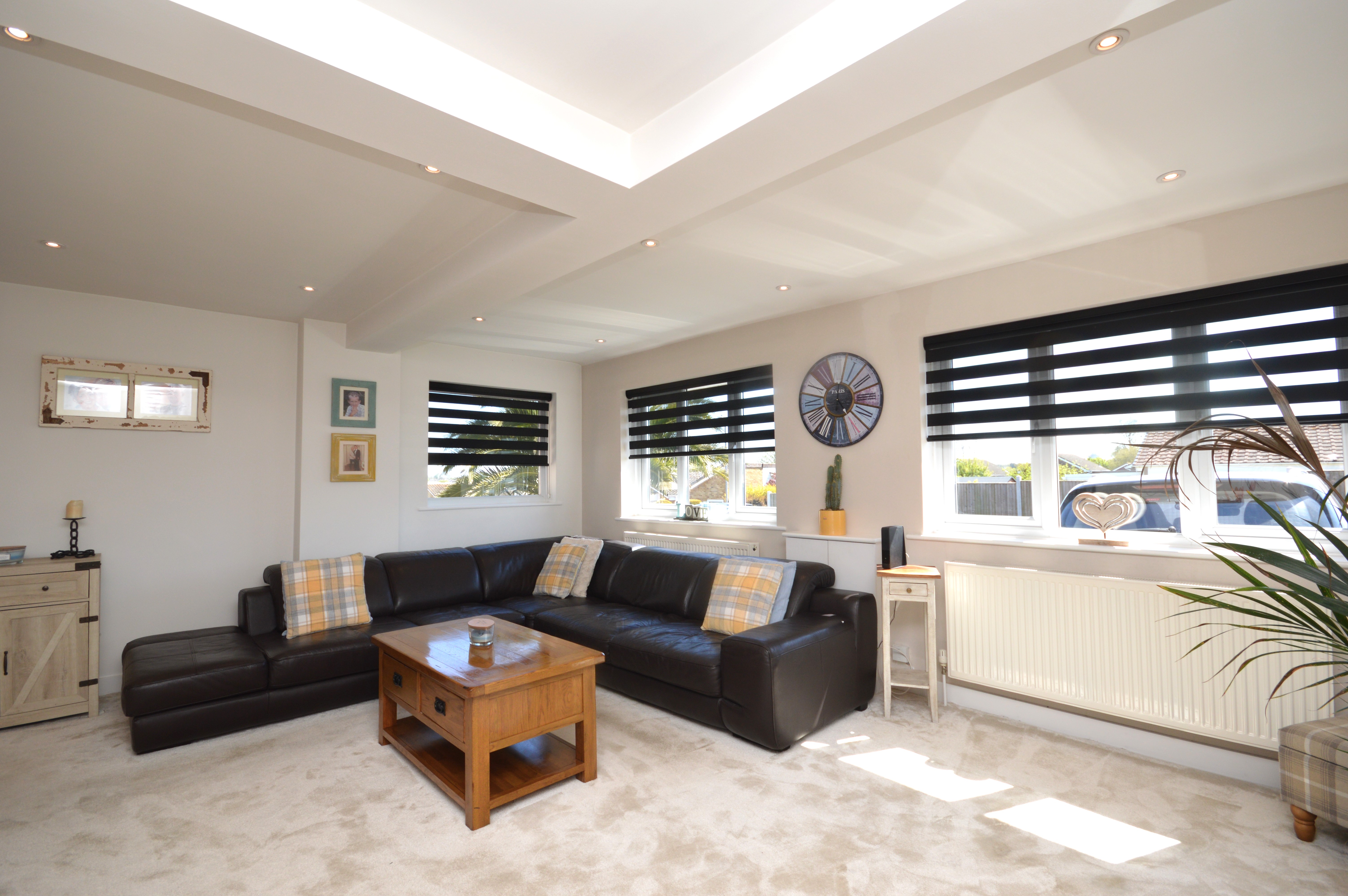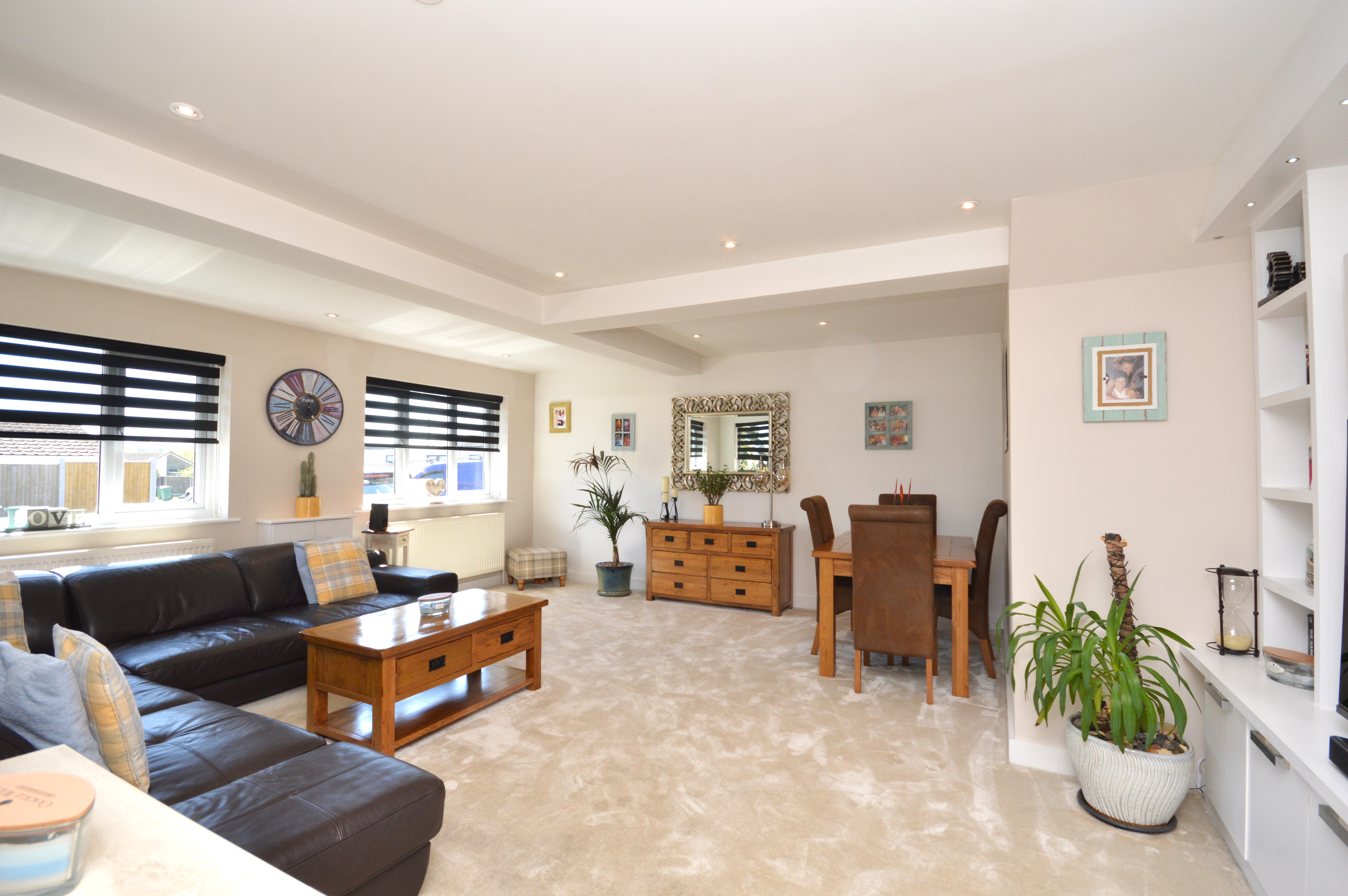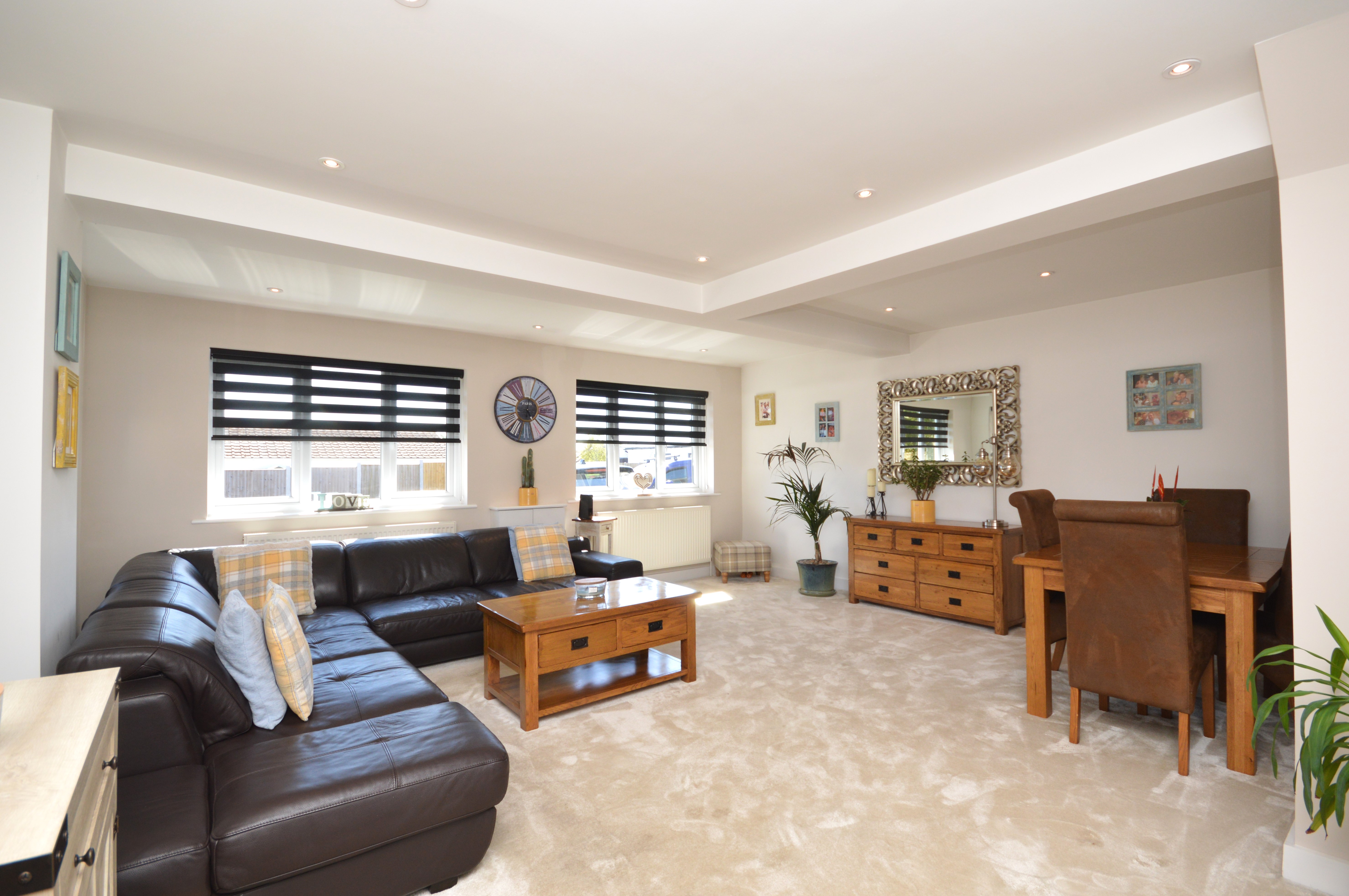 Two UPVC double glazed windows to the front of the property with fitted day/night roller blinds and UPVC double glazed window to the side with fitted day/night blind also. Two radiators, large media wall with storage either side and cupboards underneath. Luxury carpeted floor coverings, space for large corner suite and extendable dining table.