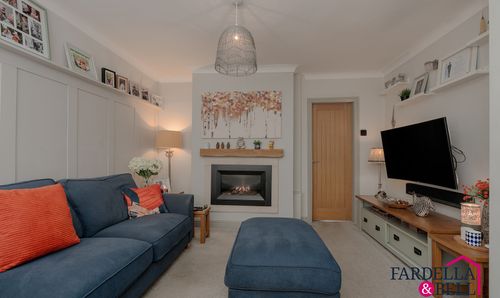 Exposed stone walls to the front elevation, spotlights to the ceiling, fitted carpet, multi fuel stove set within chimney breast, TV point, open beams, double glazed sash windows, two radiators and open balustrade staircase leading to the first floor.