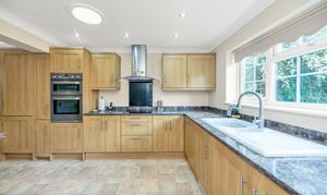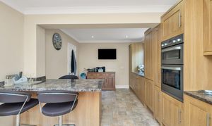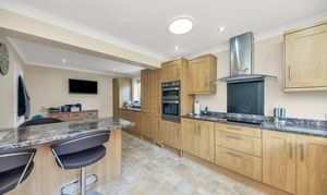 The kitchen/breakfast room is equally an incredible size, benefiting from windows and a door to a triple aspect, an extensive range of modern base and wall units, granite worktops, an island/breakfast bar, tiled flooring, inset lighting, an integrated double oven, hob, extractor hood, fridge/freezer, dishwasher, and space for other small kitchen appliances.