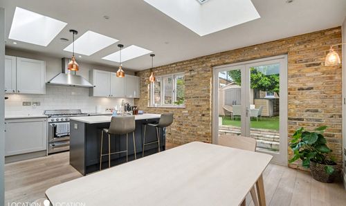 The ground floor is host to a large double reception with original features and solid wooden flooring, complete with built in storage. There is also a very stylish downstairs guest WC. One of the standout features of this property is the beautifully extended kitchen complete with island and seating, which has been designed with both style, elegance and functionality in mind.The custom-designed picture window frames the garden while the bifold doors create the perfect indoor outdoor living in the warmer months.