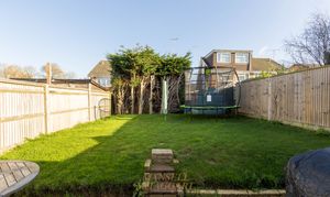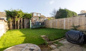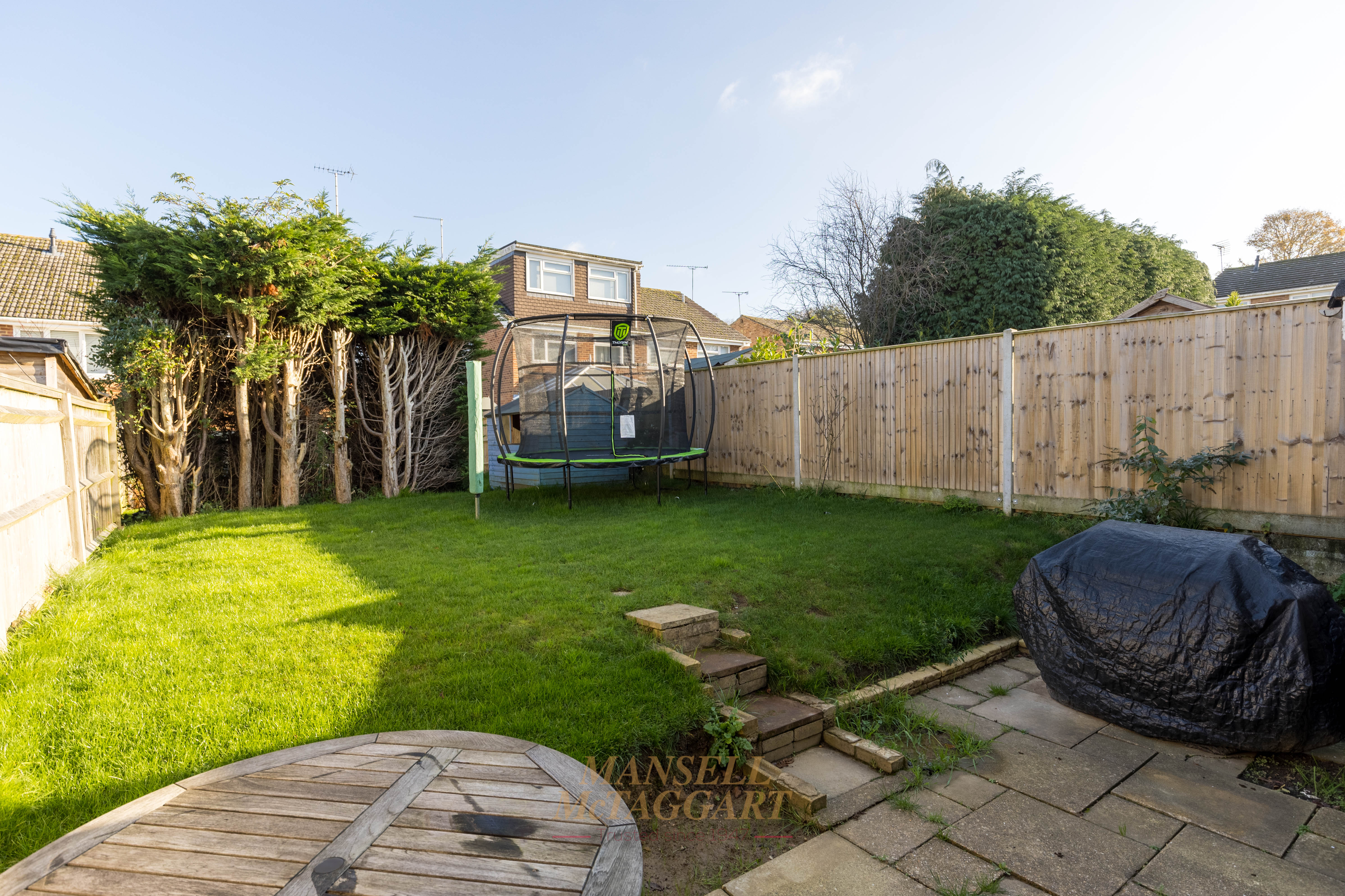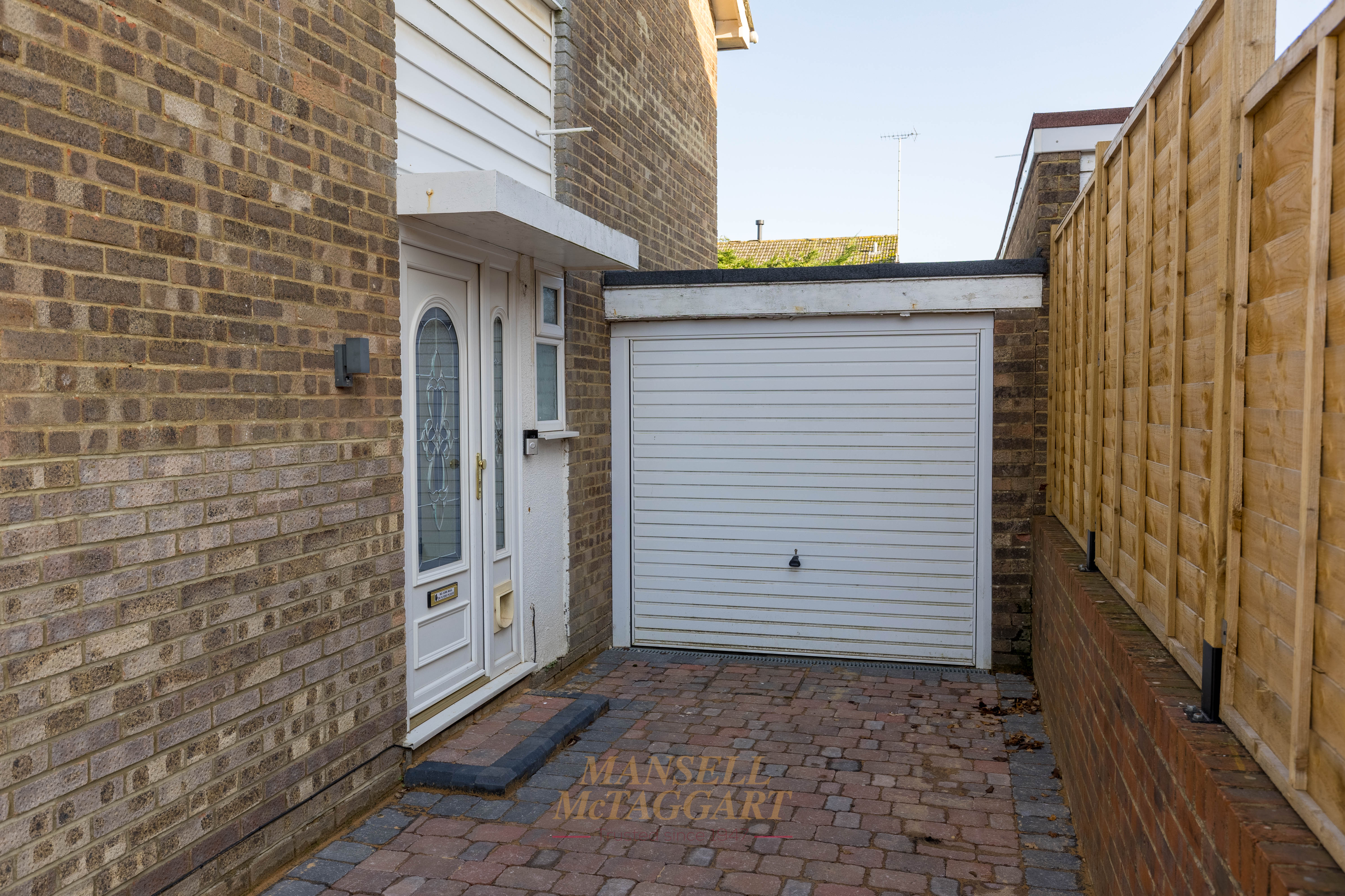The attached garage benefits from power, lighting, and an up-and-over front door, with an additional rear door providing access to the garden. The rear garden is mainly laid to patio, designed for low maintenance, and enclosed by panel fencing with partial tree screening, offering privacy and a pleasant outdoor retreat for relaxing or entertaining.