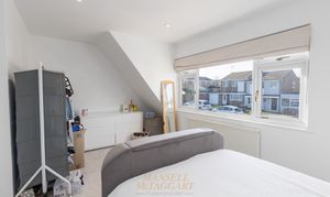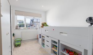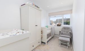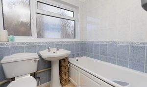 Stairs from the entrance hall lead to a bright first-floor landing with access to the loft and an airing cupboard. There are two generously sized double bedrooms, each large enough for a king-size bed and fitted or freestanding wardrobes, while the third bedroom is perfect for a single bed, nursery, or home office. The family bathroom includes a frosted window to the side, a panelled bath with a shower attachment, a wash hand basin, a WC, part-tiled walls, a heated towel rail, and recessed spotlights for a clean, modern finish.