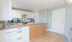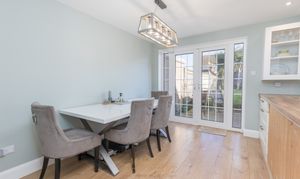 A side entrance leads into a bright and welcoming hallway with space for coats and shoes, an under-stairs storage cupboard, and a convenient downstairs cloakroom fitted with a frosted window, WC, and wash hand basin—the ground floor benefits from elegant light ceramic stone flooring throughout, giving a modern feel. The spacious living room is filled with natural light from a large picture window overlooking the front of the property. There is ample room for two or three-seater sofas and additional freestanding furniture, making it an ideal space for relaxation and family time. Positioned at the rear of the home, the open-plan kitchen and dining area offer a perfect setting for everyday living and entertaining. The kitchen is fitted with an attractive range of wall and base units, work surfaces with an inset sink, space for a gas oven, plumbing for a washing machine, and room for a fridge-freezer. A breakfast bar provides additional seating and preparation space. The adjoining dining area comfortably accommodates a six-seater table, with patio doors and windows overlooking the east-facing rear garden, allowing plenty of morning sunlight and direct access to the outdoors.