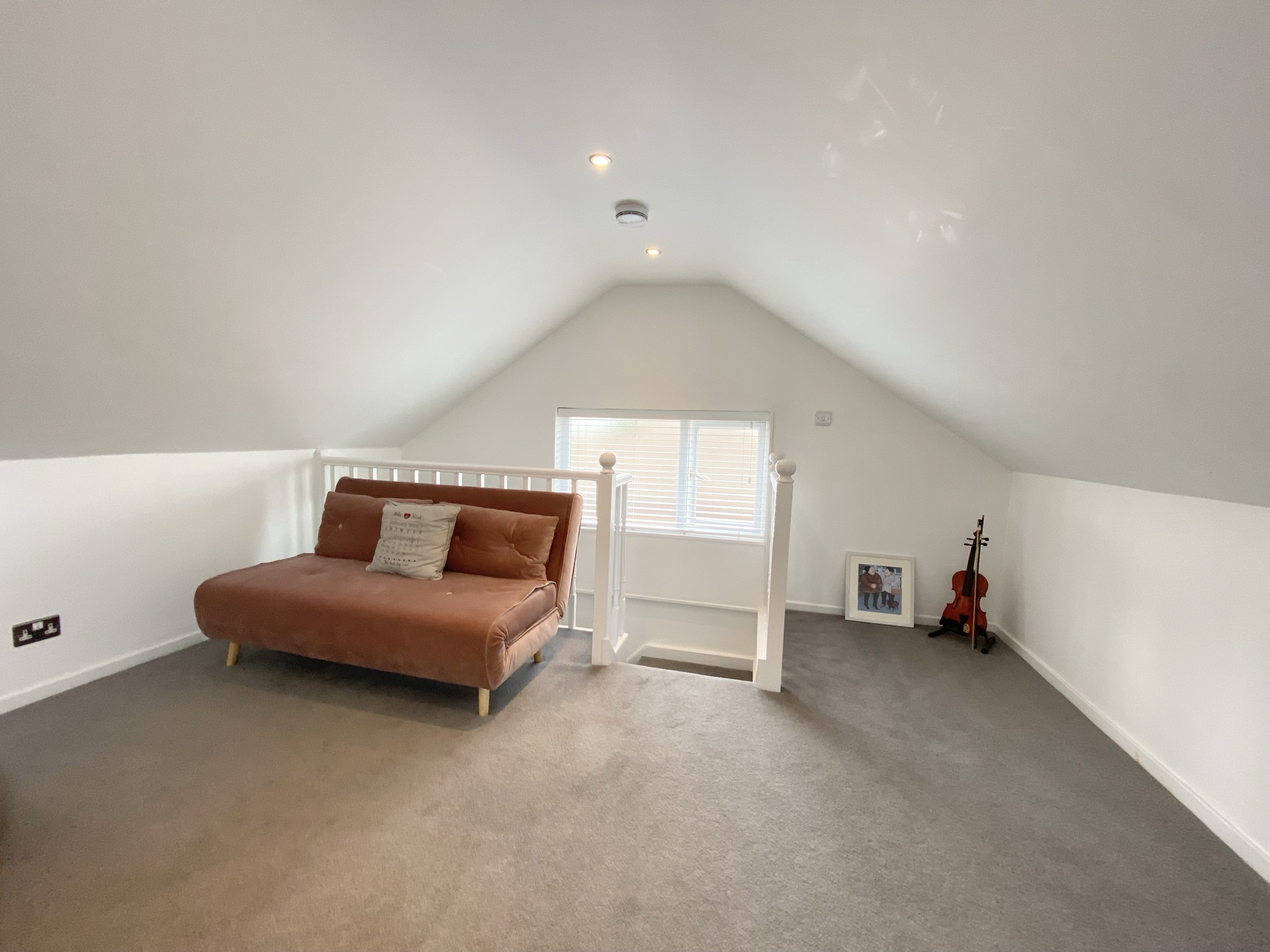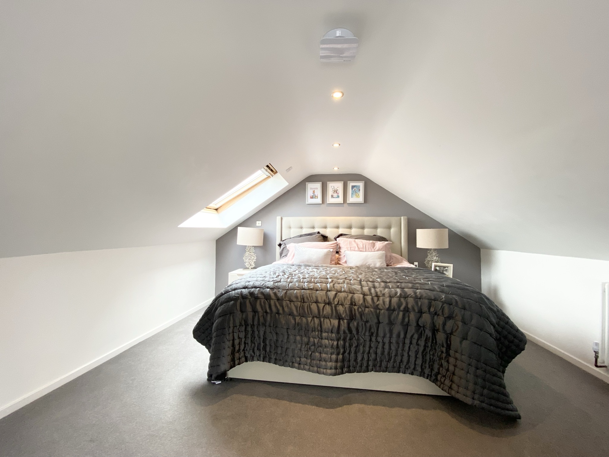 Large converted loft with a dormer to the side elevation and a sky light to the rear elevation. Inset spotlights.