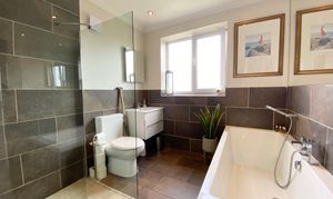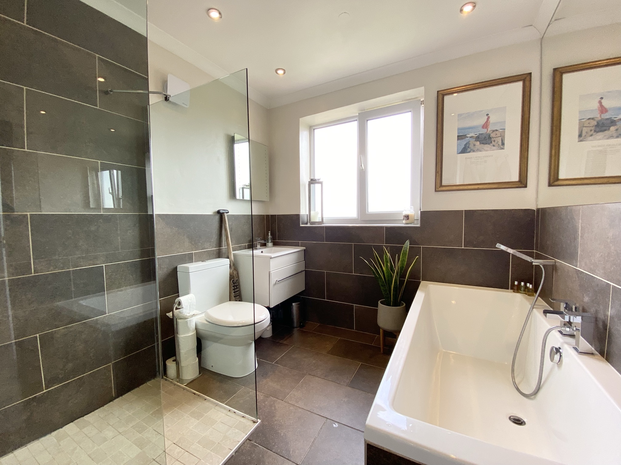 Window to rear elevation. Part tiled walls and floor. Fitted with a modern bathroom suite complete with a walk-in shower, bath, low level W.C and a vanity hand wash basin. Inset spotlights.
