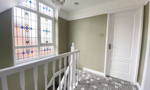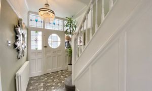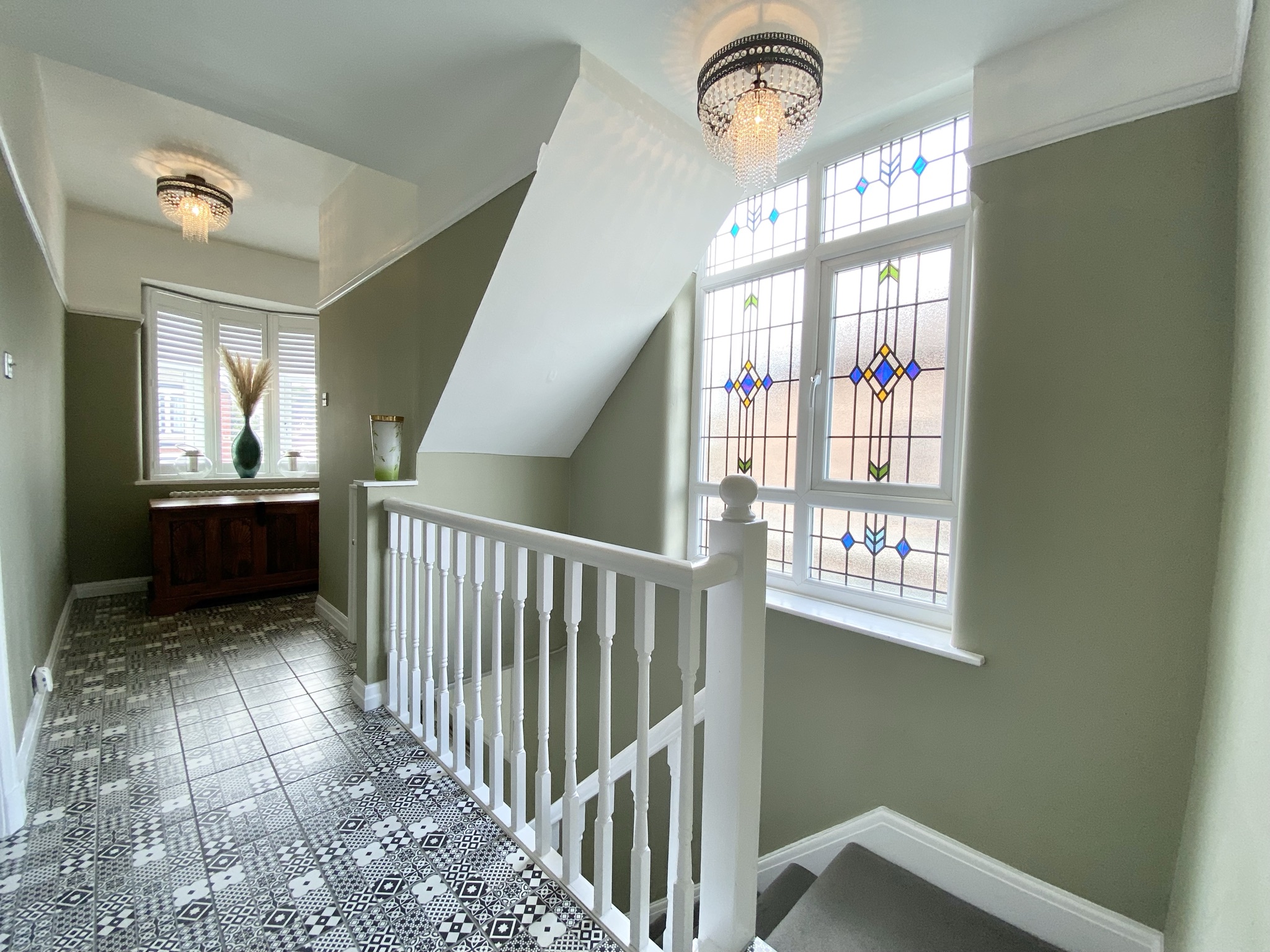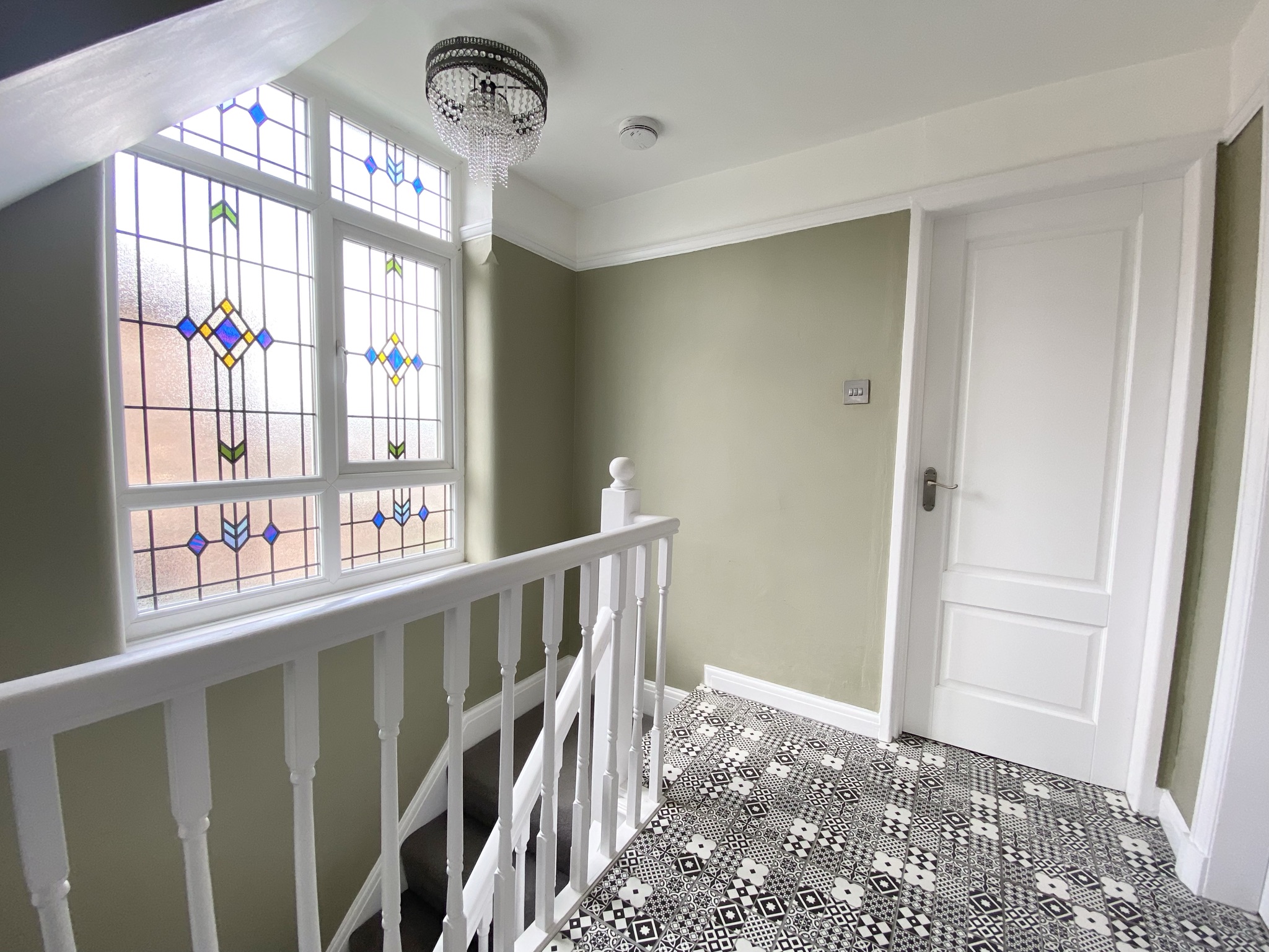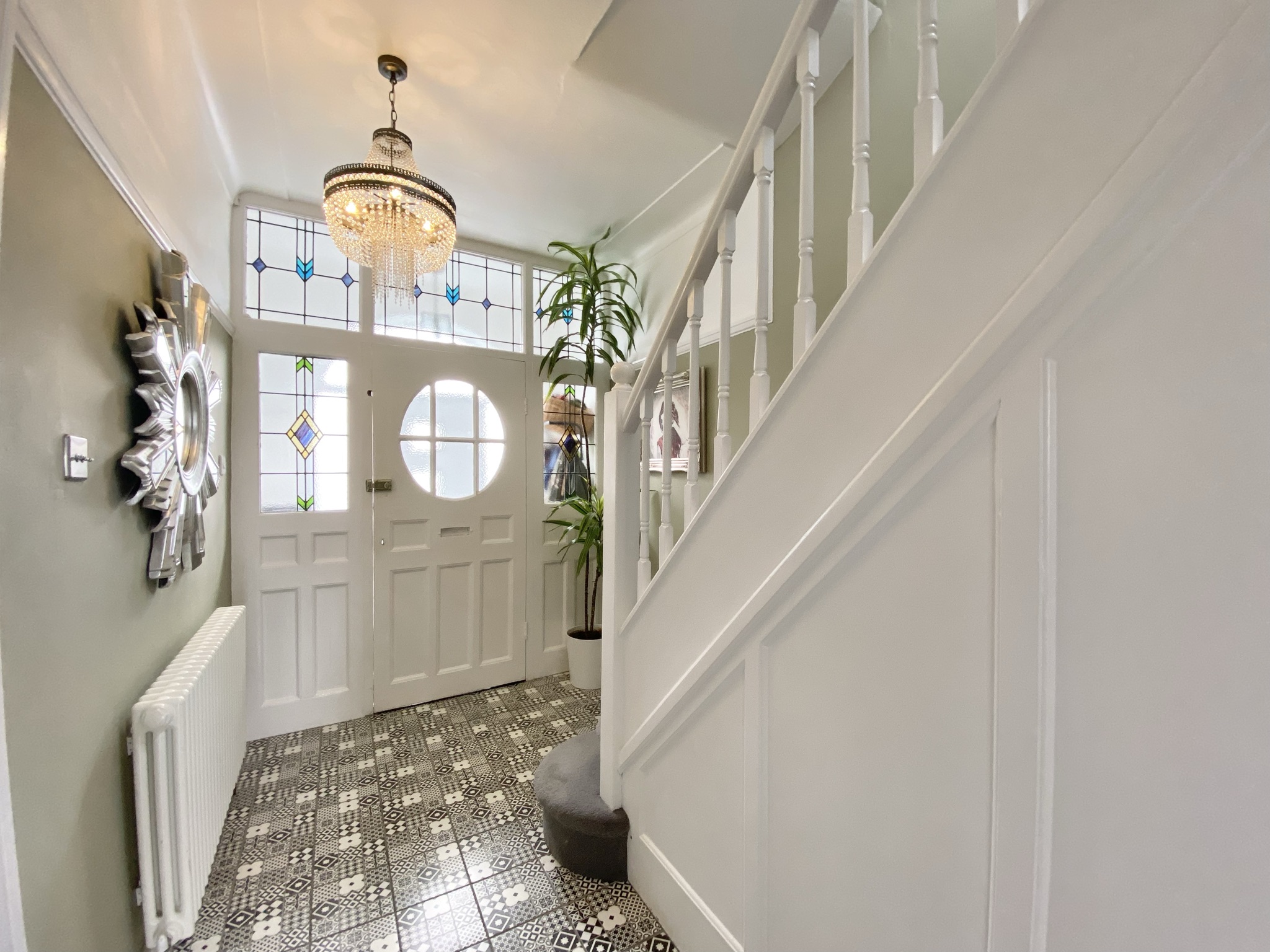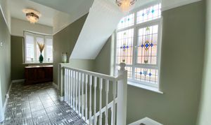 External door with a window to both sides and above to the front elevation. Part tiled walls and tiled floor. Original stained and leaded internal door with stained and leaded windows above and to both sides leads through to:
