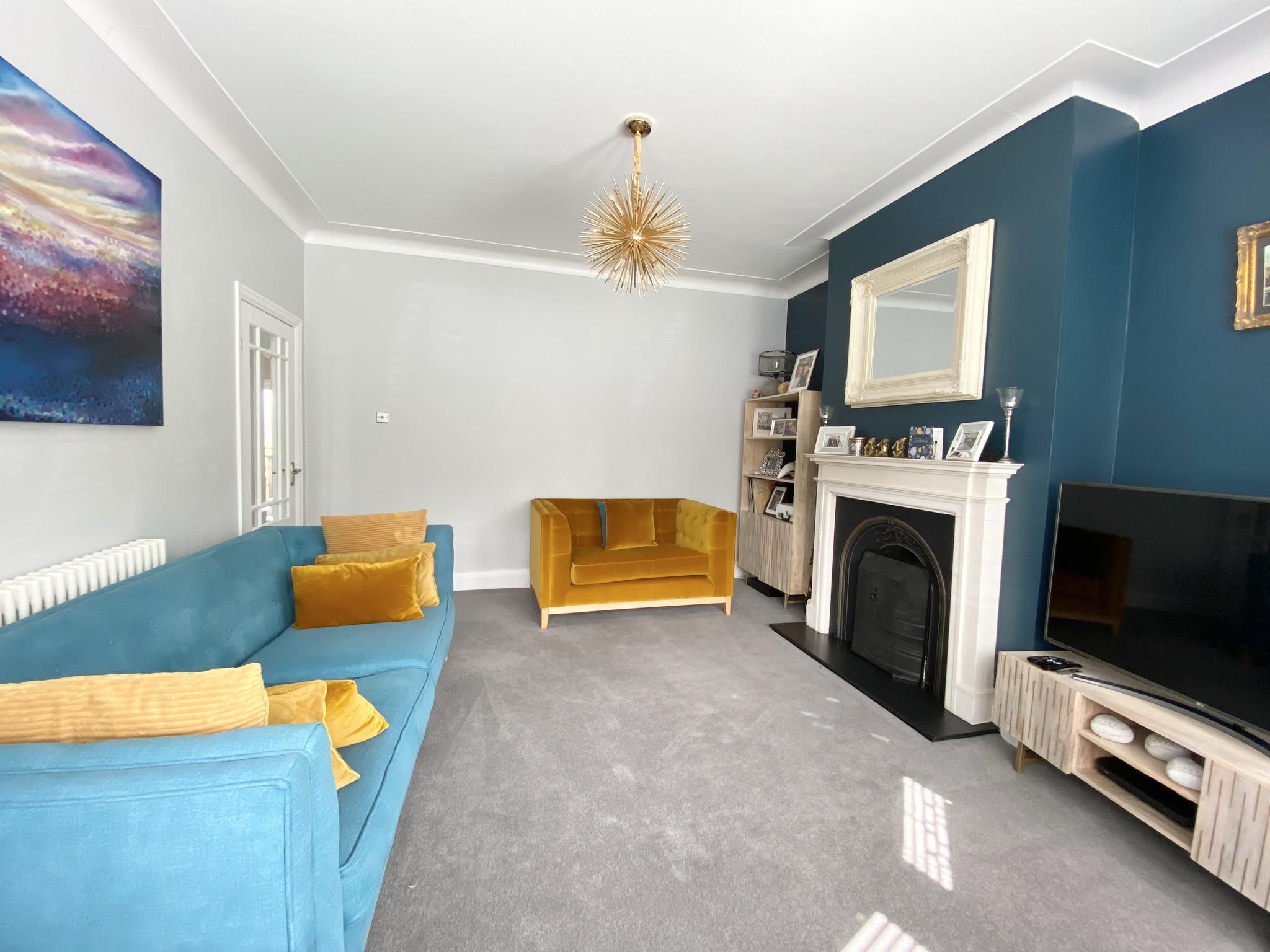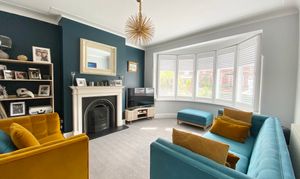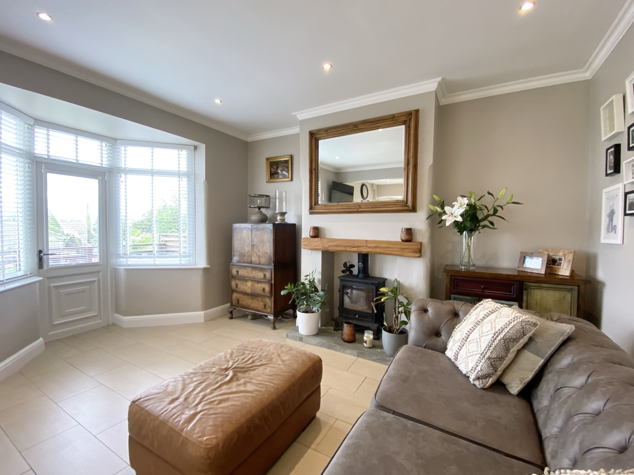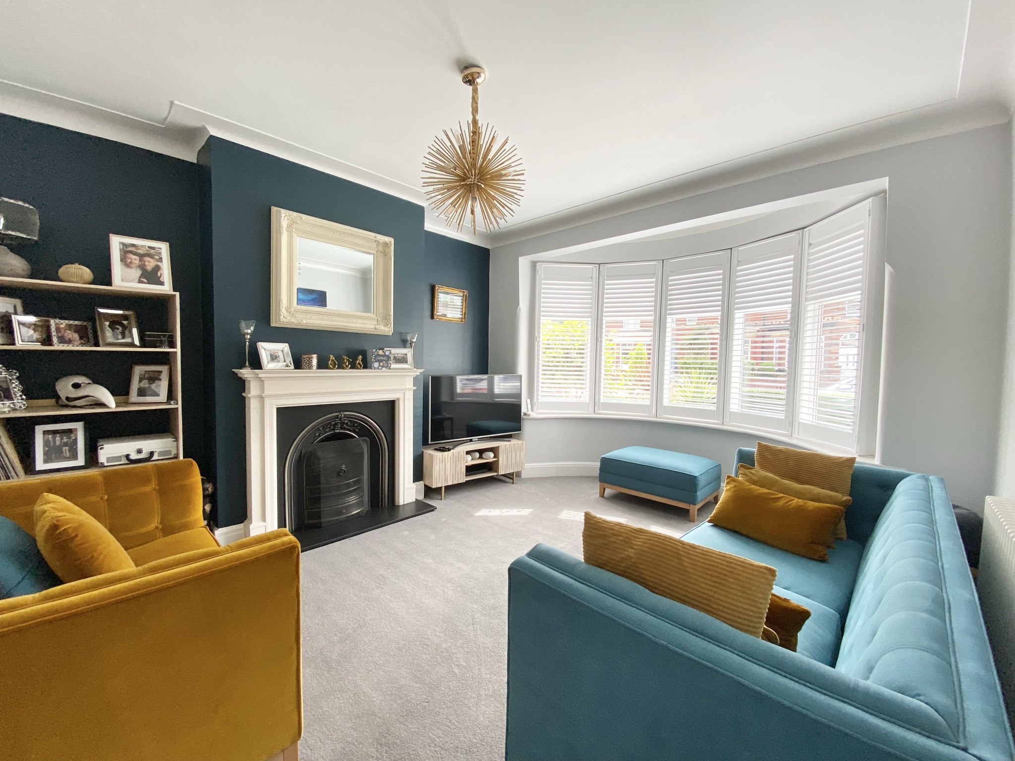 Bow bay window to the front elevation complete with fitted French Shutters. Ceiling coving. Feature fire surround complete with a cast iron insert and a gas living flame fire. T.V point.