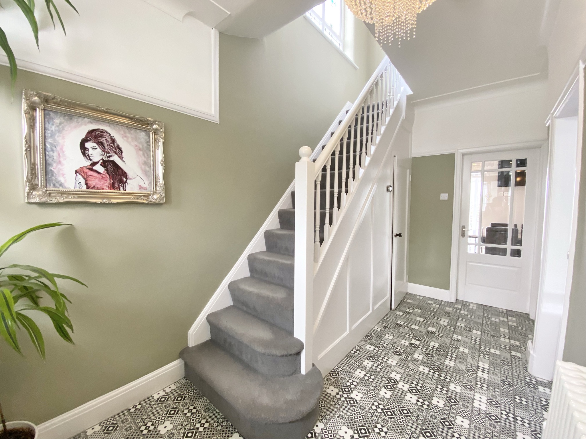 Ceiling coving. Picture rail. Tiled floor. Spindle staircase leads to the first floor landing. Under stairs store. Internal doors lead through to: