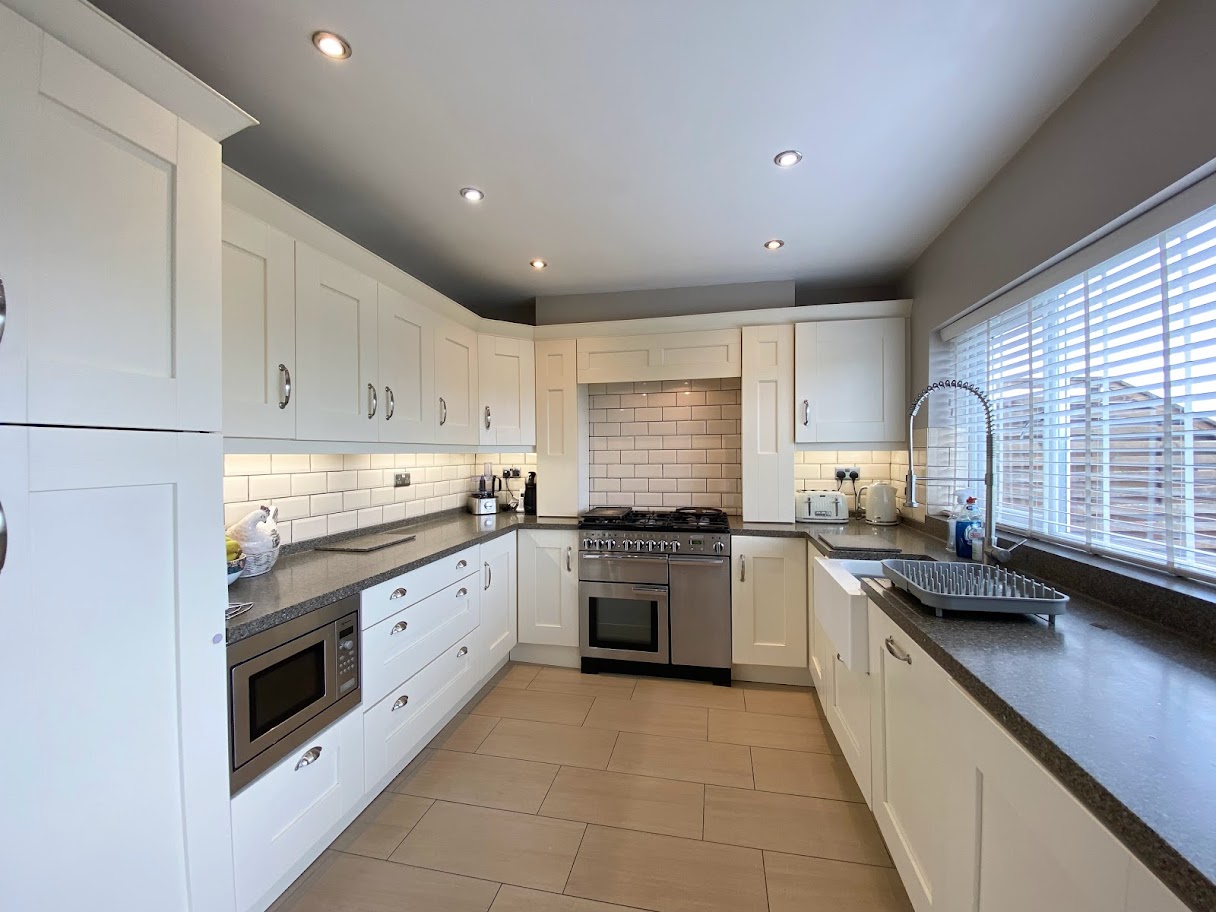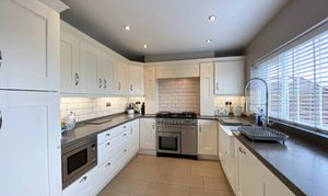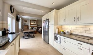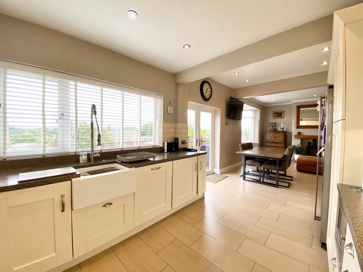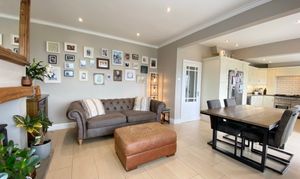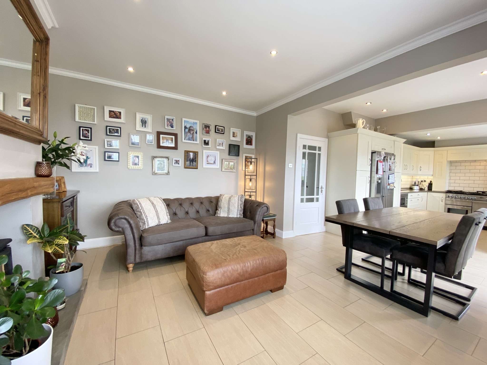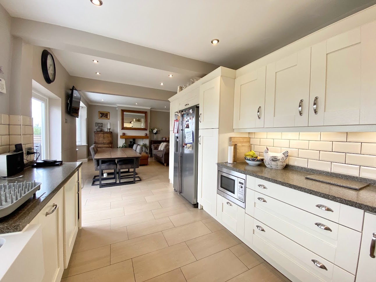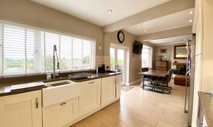 Large light and bright room complete with a seating, dining and kitchen area ideal for a family. To the rear elevation a large window to the kitchen area, French doors to the dining area leading out to a raised decked area and a bay window and external door to the seating area again leading out to the raised decked area. Tiled floor. Inset spotlights. Ceiling coving. Log burning stove. The kitchen is fitted with a range of cream wall and base units with contrasting corian work surfaces and integrated appliances including: dishwasher, washing machine and microwave with space for an American style fridge/freezer and range cooker.