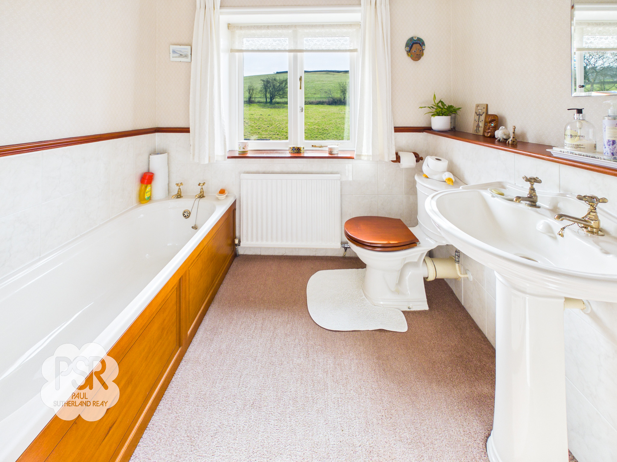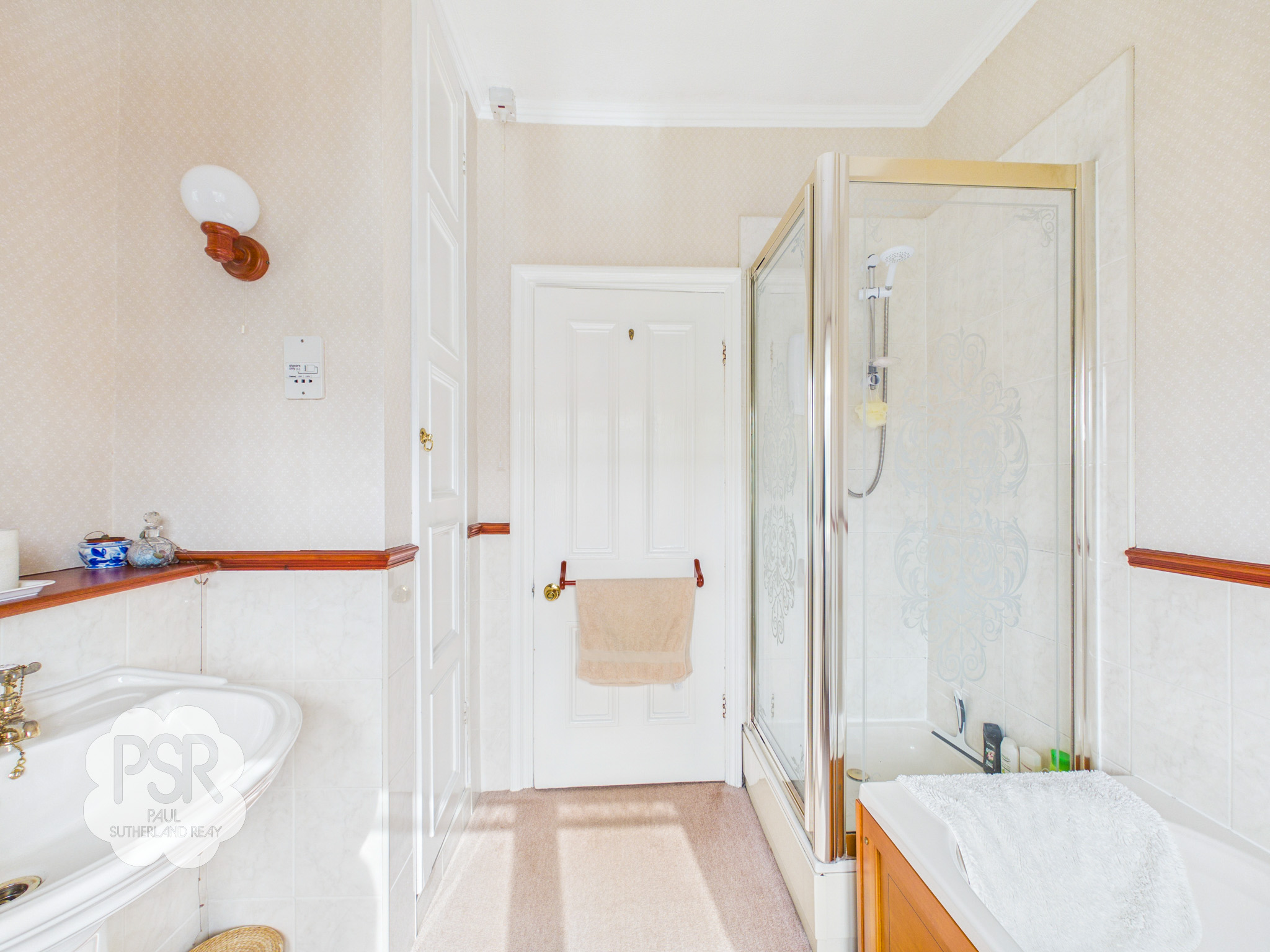 Family bathroom with a hardwood double-glazed window to the rear elevation. The space features carpeted flooring and part-tiled walls. The bathroom suite comprises a panelled bath with brass taps over, a traditional pedestal sink with brass taps over, a low-level WC, and a corner shower with electric shower. Additional features include a built-in airing cupboard, cornicing, a ceiling pendant light, wall lights, and a radiator.