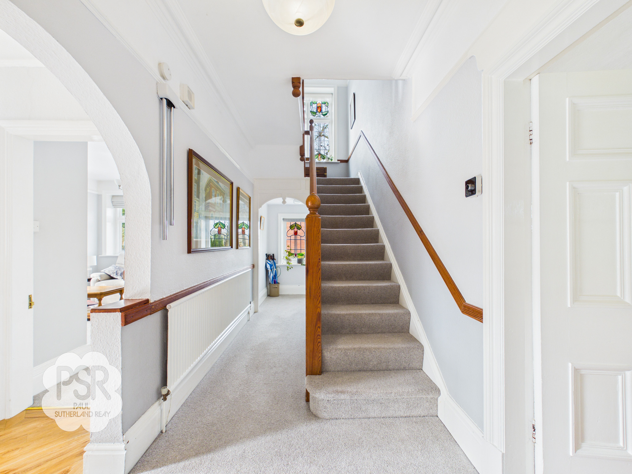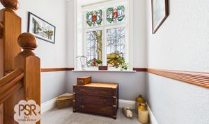 Hallway featuring an original hardwood front door and a hardwood stained, leaded glass window to the side elevation. The space includes carpeted flooring, a single radiator, and an under-stairs cupboard housing the fuse box and coat hooks. Additional features include a ceiling pendant light, coving, dado rail, and picture rail. A carpeted staircase with a stained timber balustrade leads to the first floor.