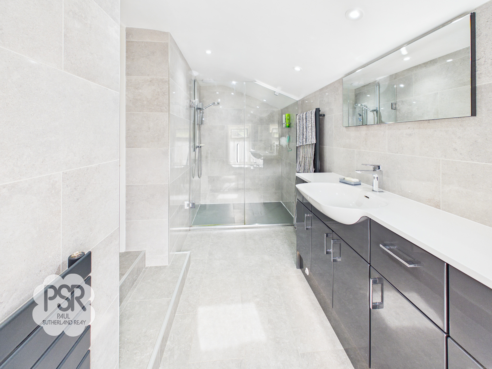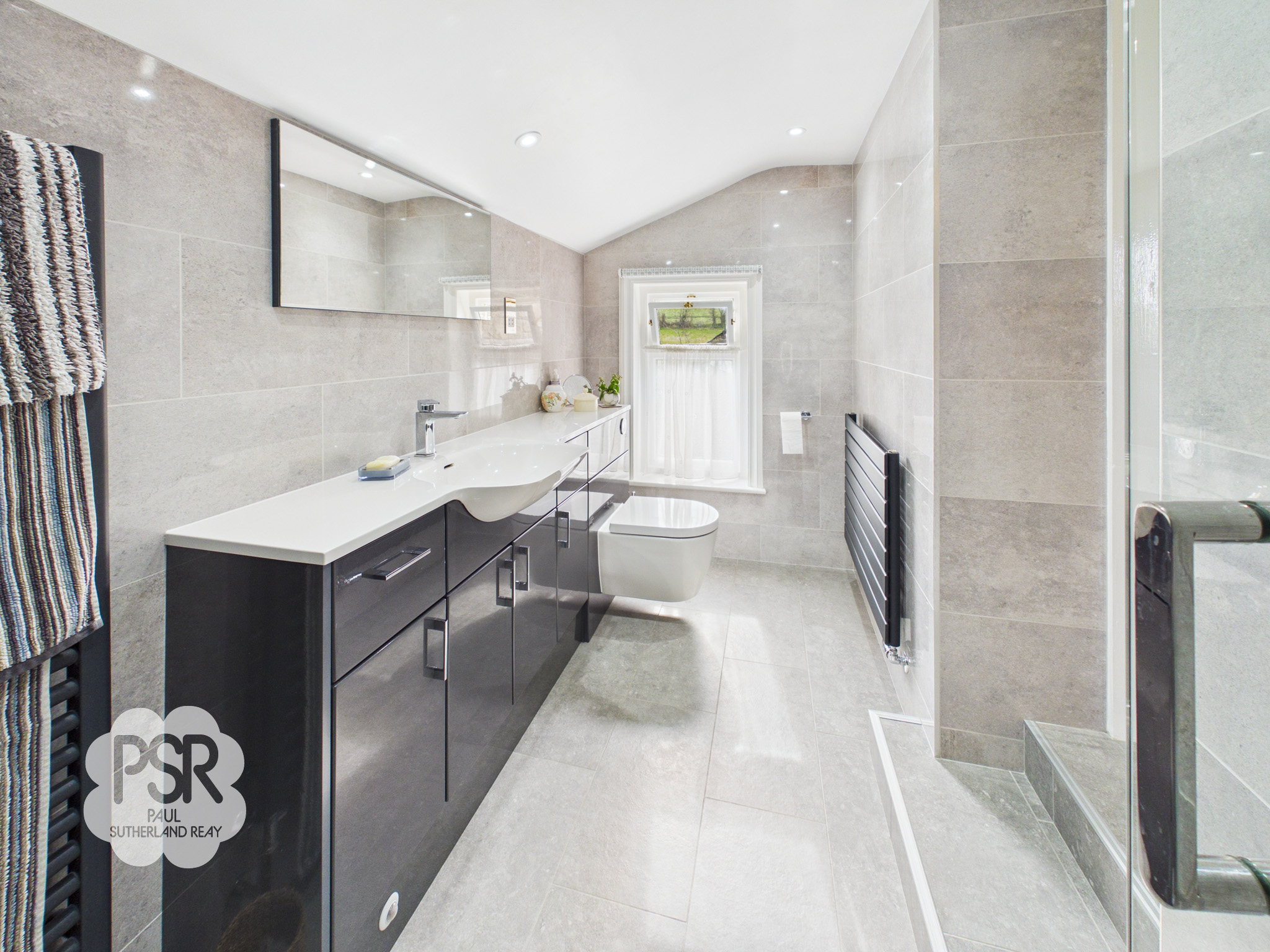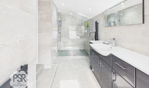 Steps down from the bedroom leading to the en-suite. The space features a tiled hardwood window to the rear elevation and is fully tiled throughout. It benefits from recessed ceiling spotlights and is fitted with a contemporary vanity unit incorporating a sink with chrome mixer tap over, and a push-flush WC. Additional features include a large vanity wall mirror, a spacious walk-in shower with chrome fittings, and a grey ladder-style radiator which can be used independently as a heated towel rail when the heating is not on.