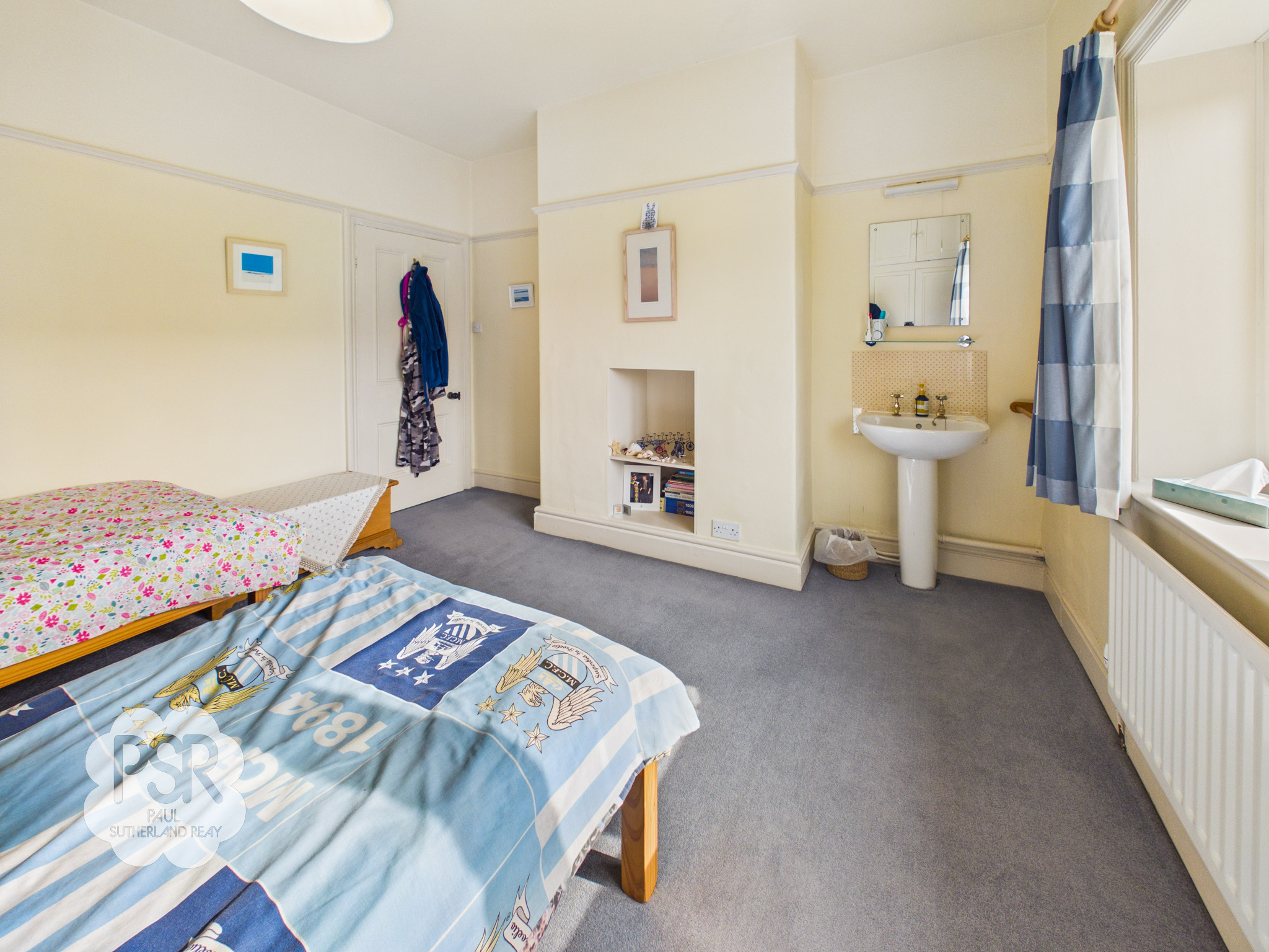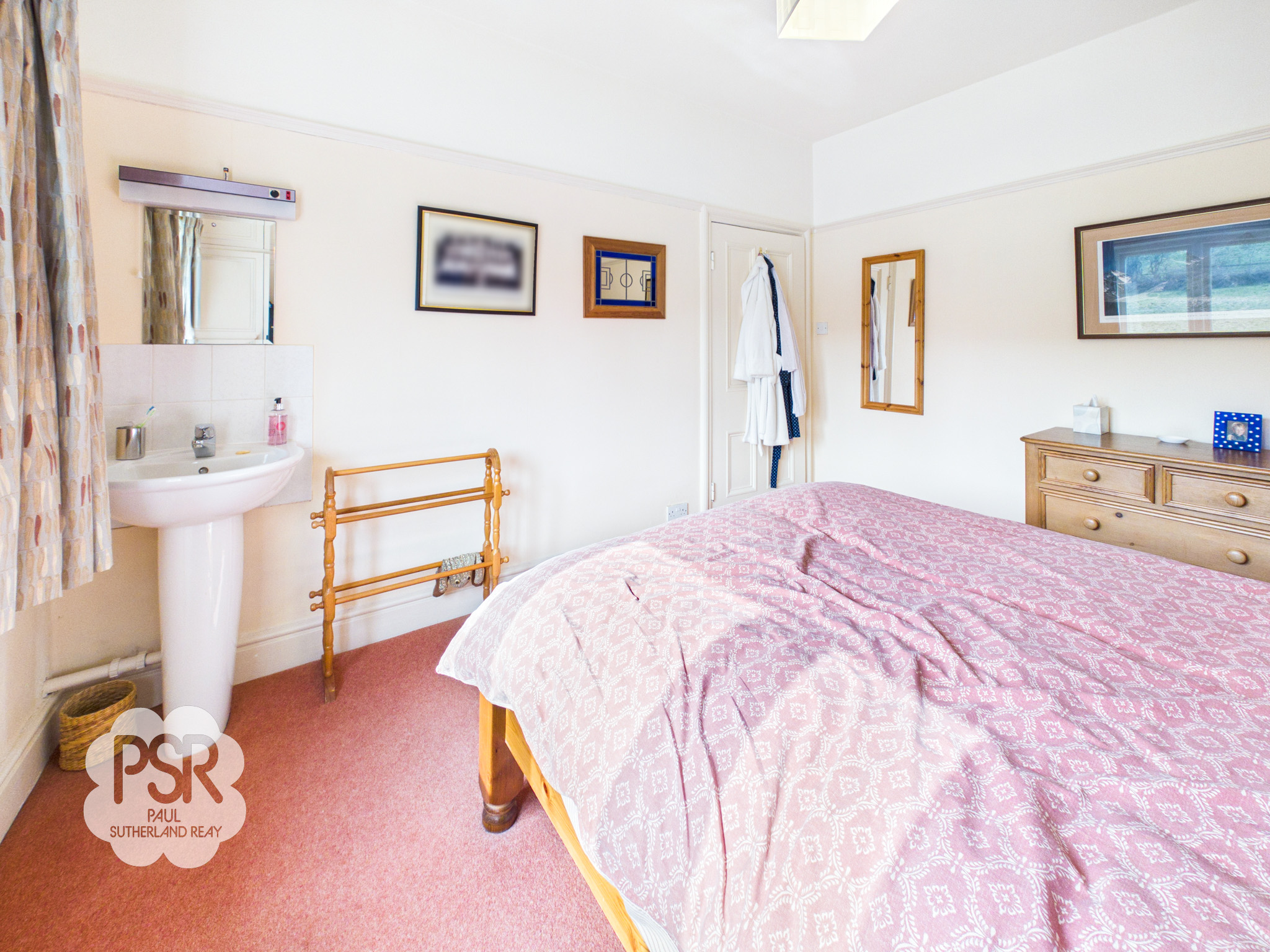 Double bedroom with a hardwood double-glazed window to the rear elevation. The room features carpeted flooring, a picture rail, and a radiator. Additional benefits include a fitted wardrobe, a pedestal sink with chrome taps, tiled splashback, and a wall-mounted mirror.