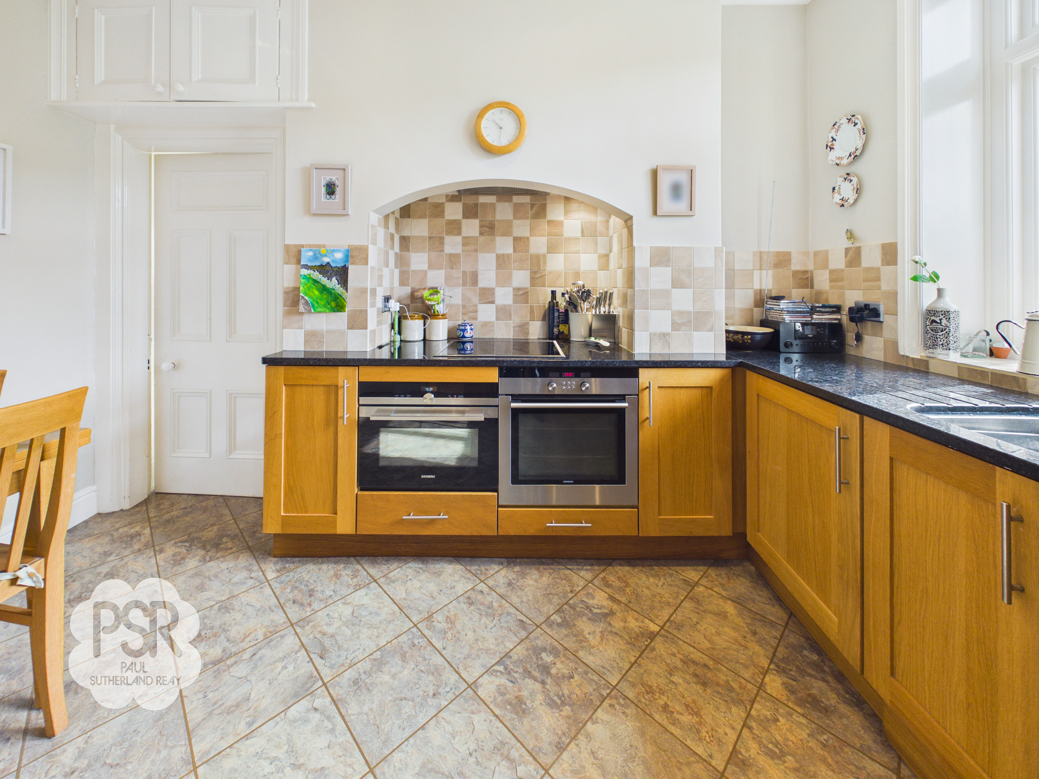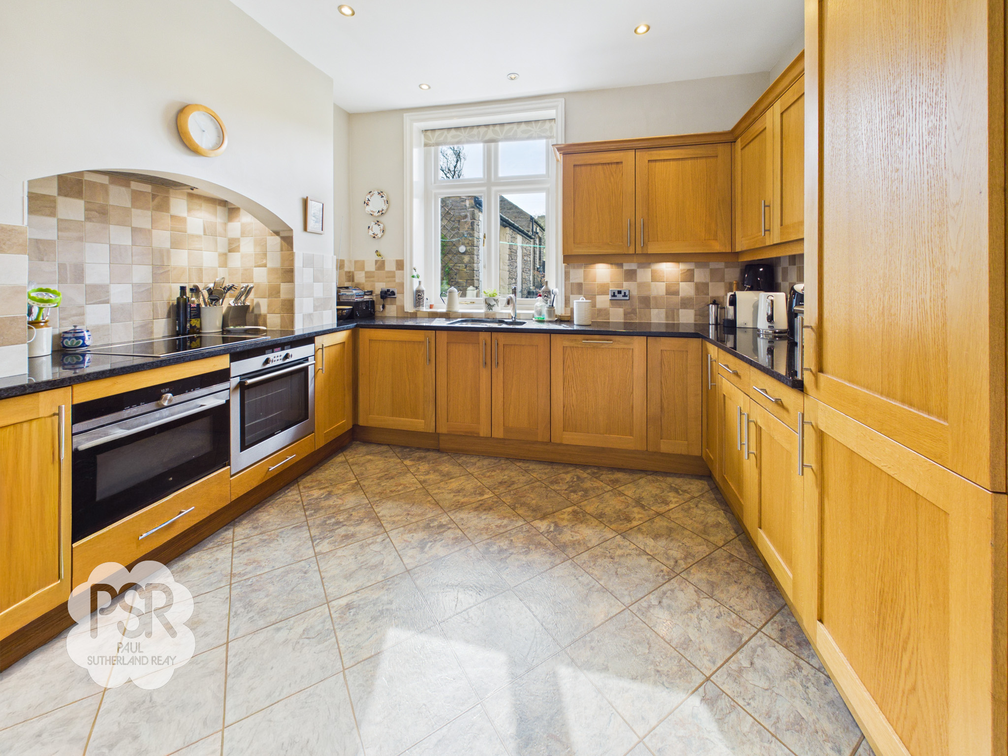 Kitchen with a hardwood double-glazed window to the rear elevation. The room is fitted with Shaker-style matching wooden wall and base units, complemented by granite worktops. Features include a one-and-a-half bowl stainless steel sink with chrome mixer tap, ceramic hob, two integrated ovens, and an extractor fan. Additional benefits include tiled splashbacks, integrated fridge freezer and dishwasher, tiled floor, radiator, and recessed ceiling spotlights.