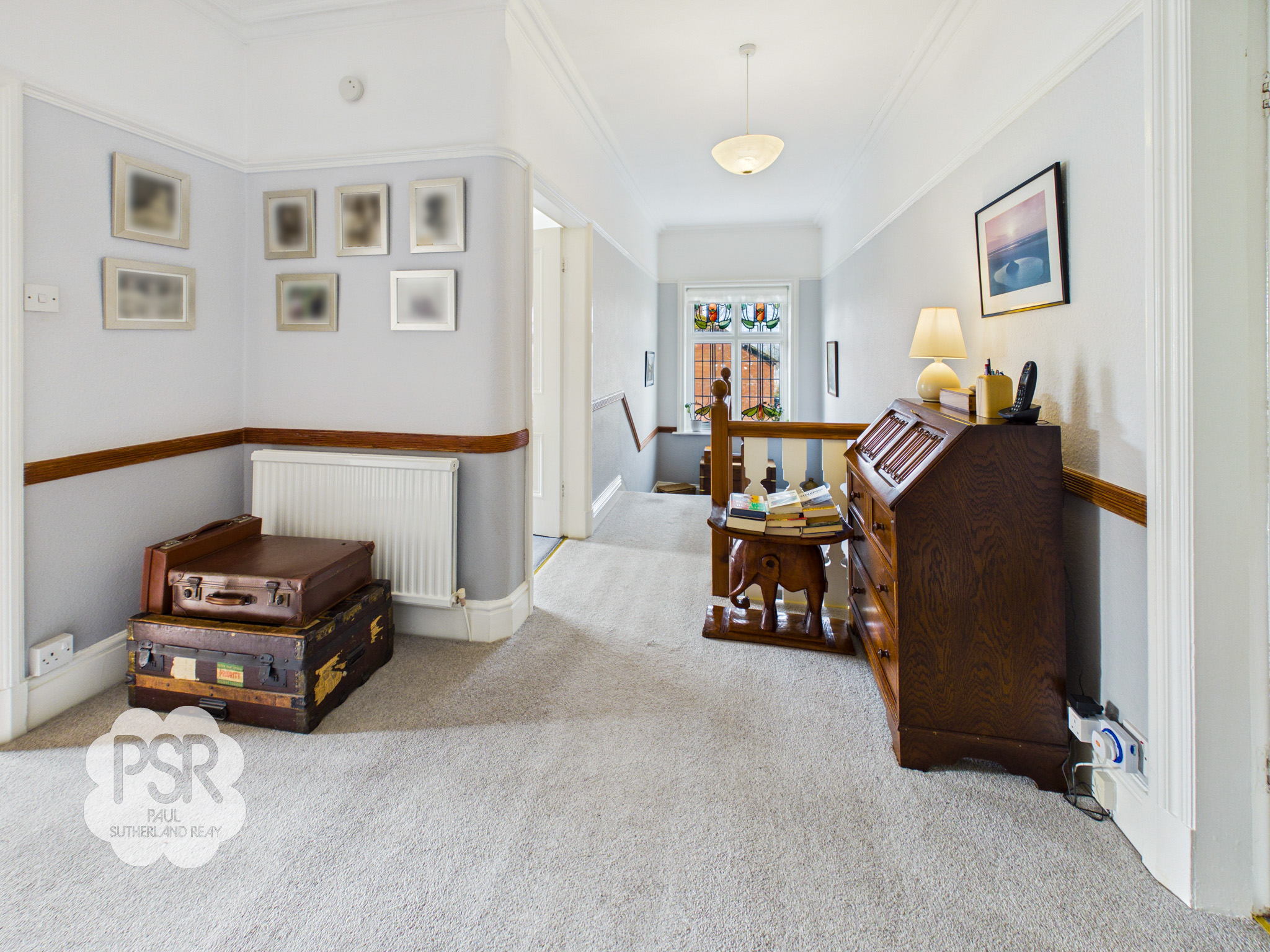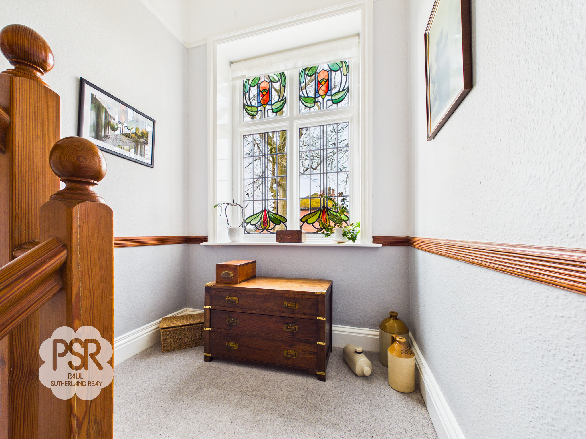 Landing with a hardwood secondary-glazed window featuring leaded and stained glass panels to the side elevation. The space includes a wooden spindled balustrade, carpeted flooring, dado rail, and cornicing. Additional features include a ceiling pendant light and a double radiator.