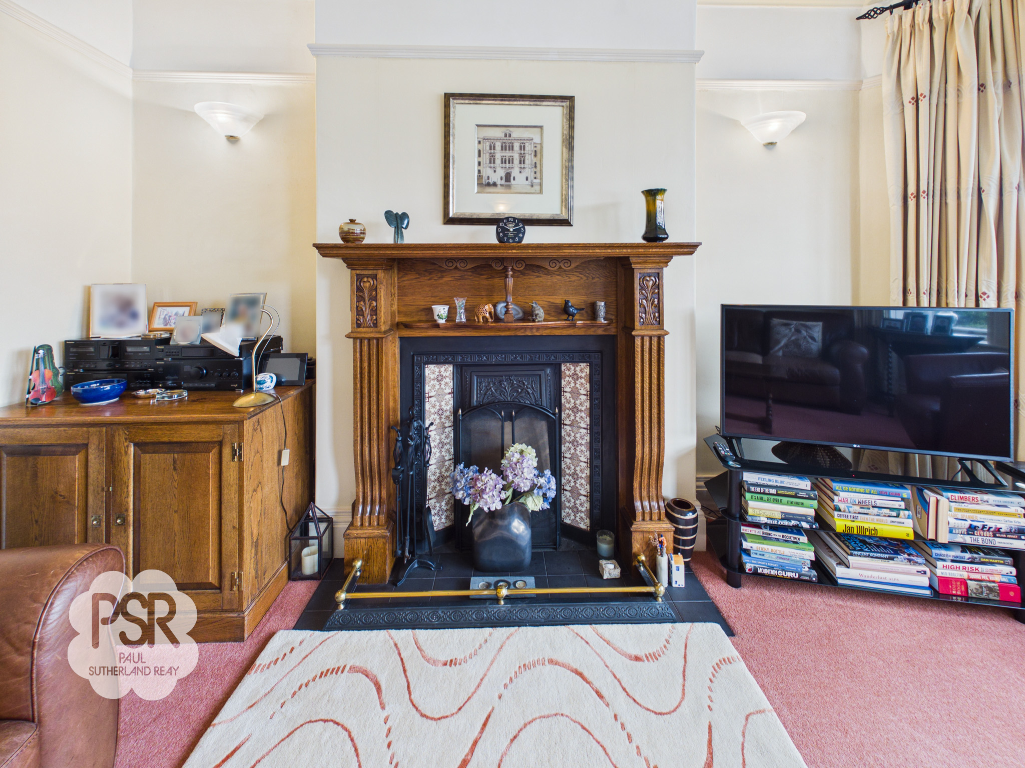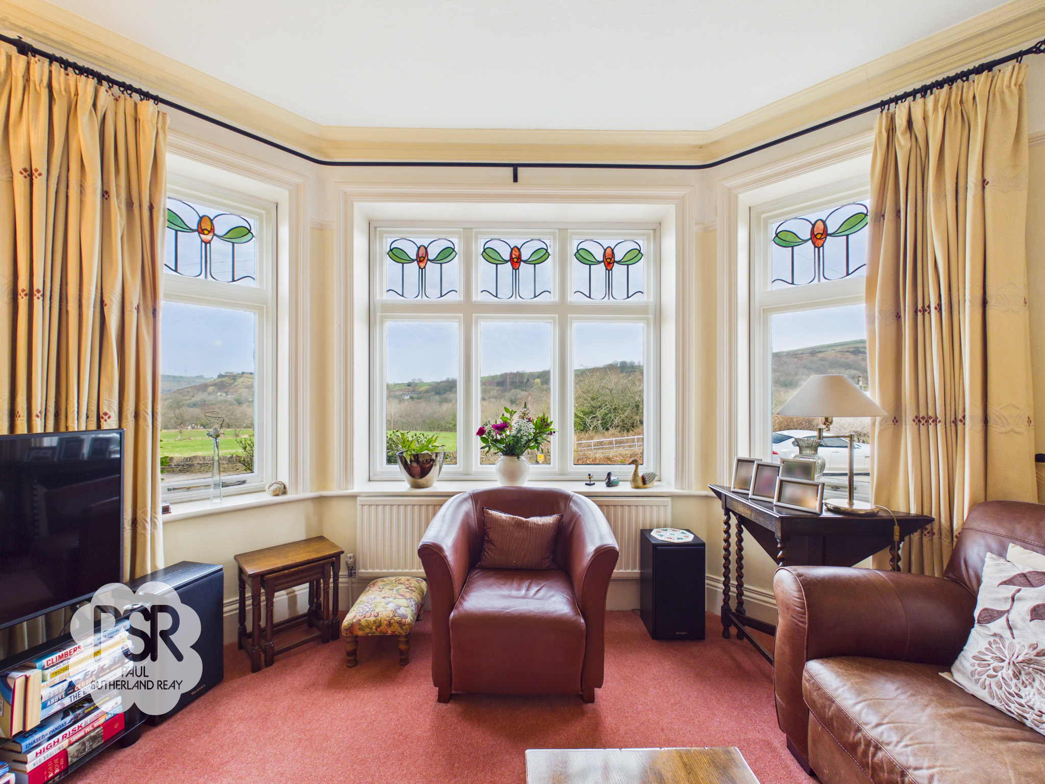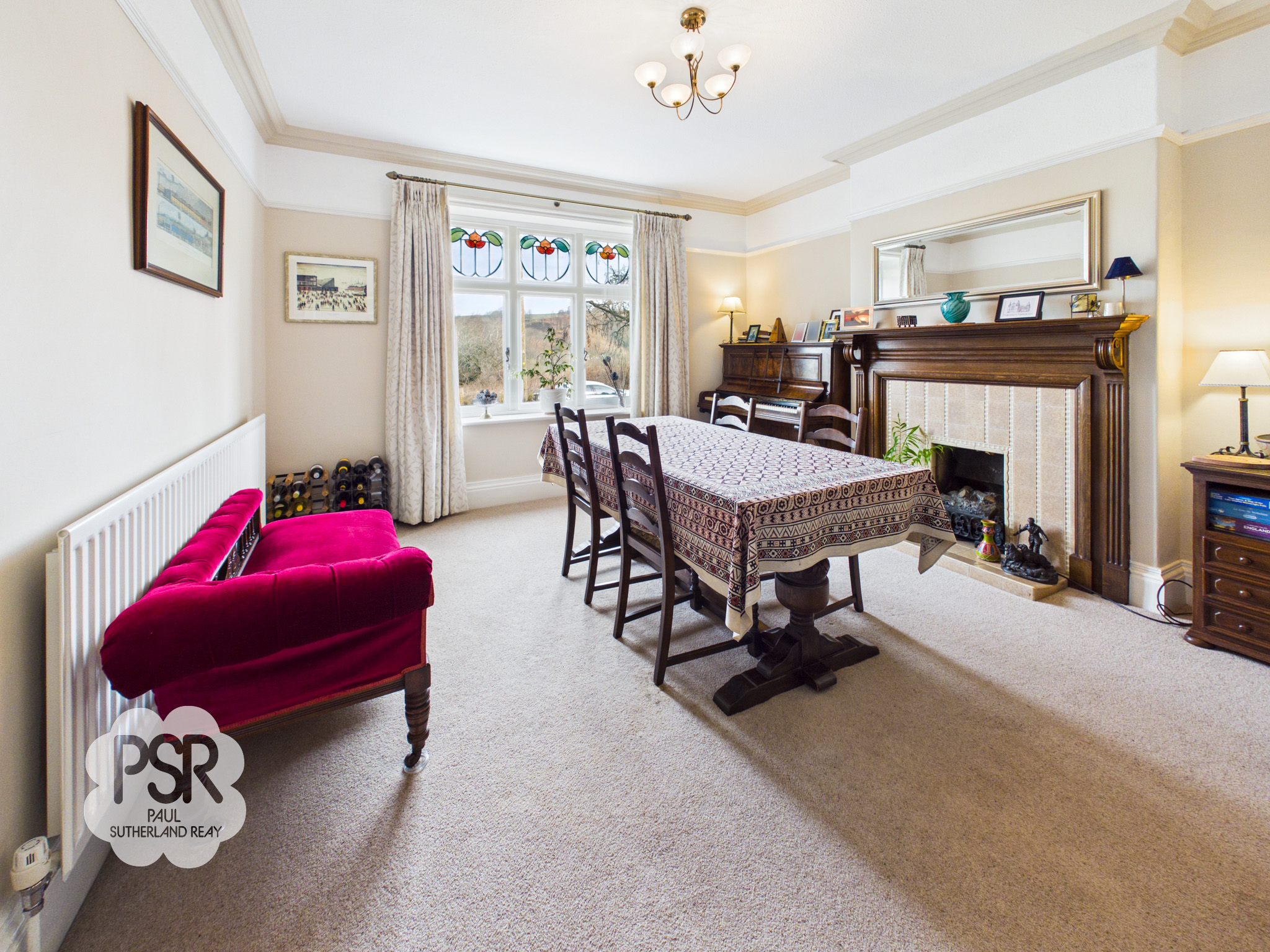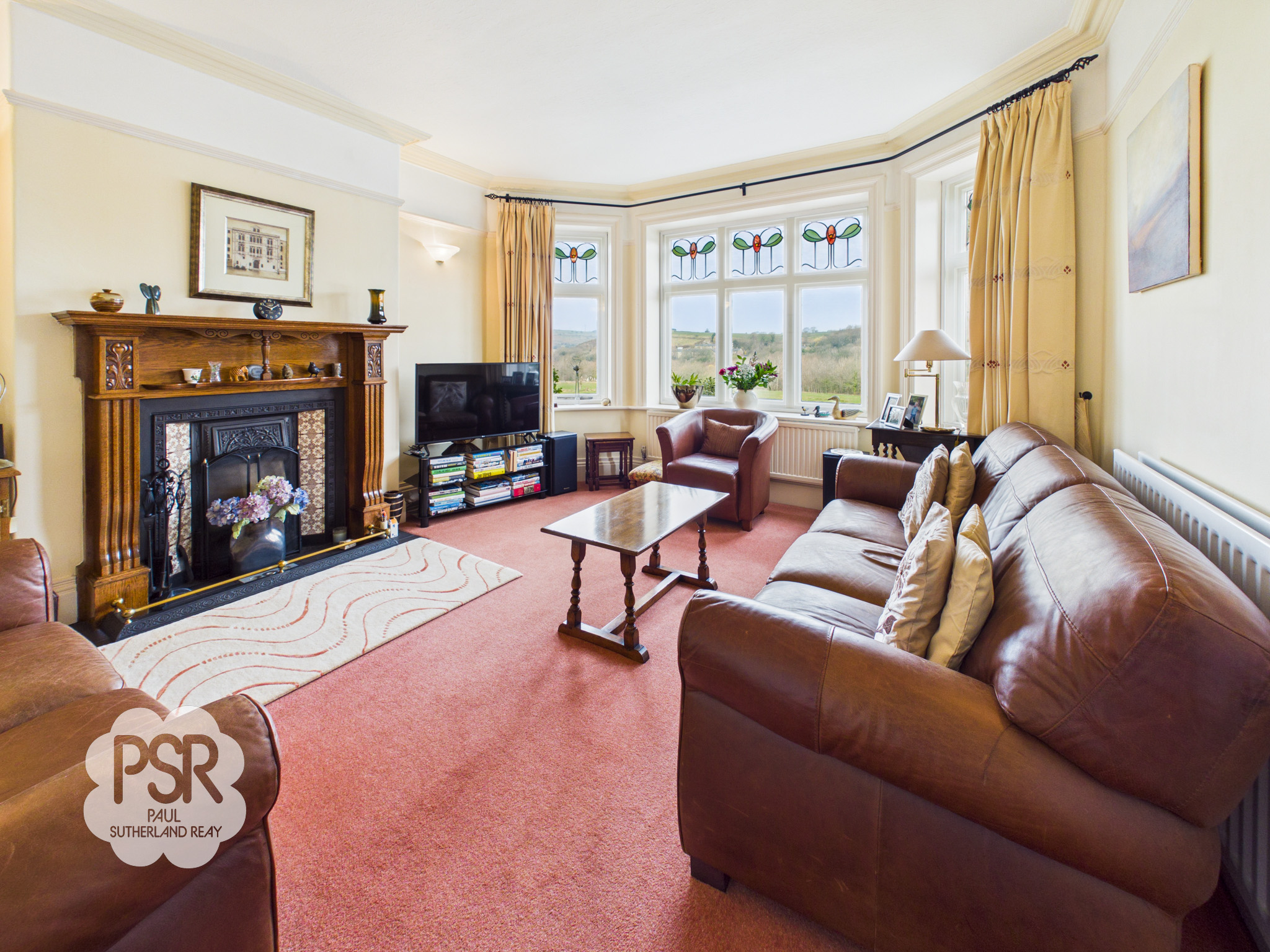 Lounge featuring a large bay with a hardwood secondary-glazed window incorporating leaded stained glass panels. The room includes cornicing, a picture rail, and carpeted flooring. Heating is provided by two radiators. There is an open fire set within a feature Victorian cast iron fireplace with an oak surround and tiled hearth. Additional lighting is provided by wall lights