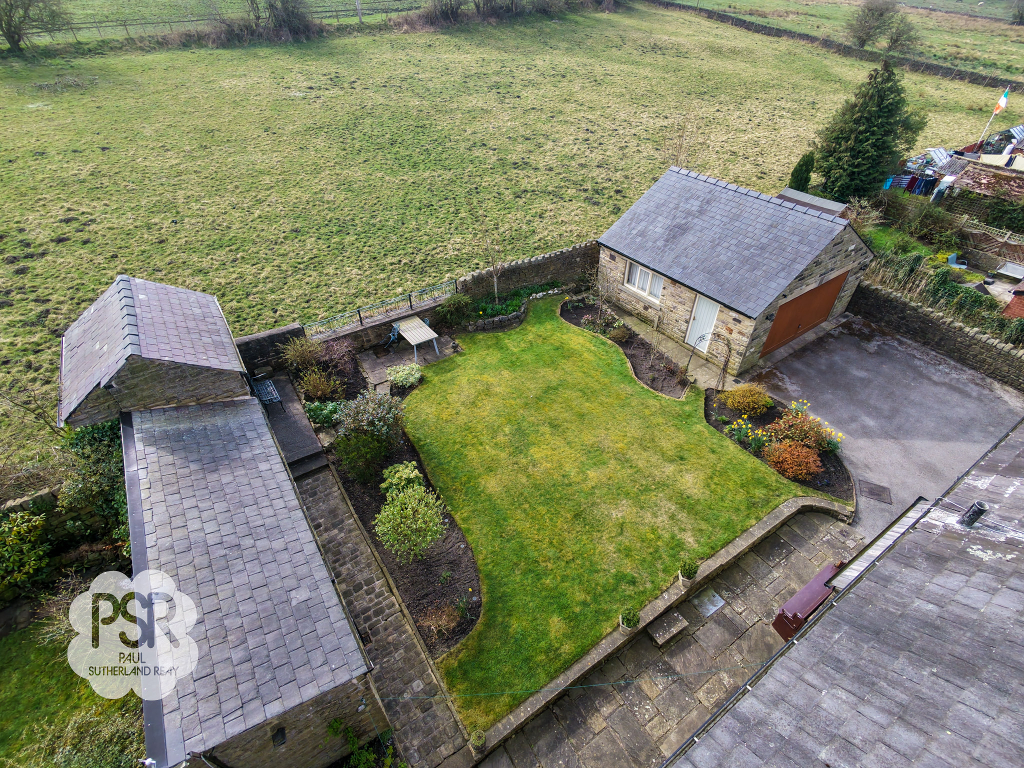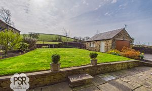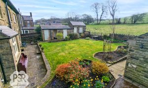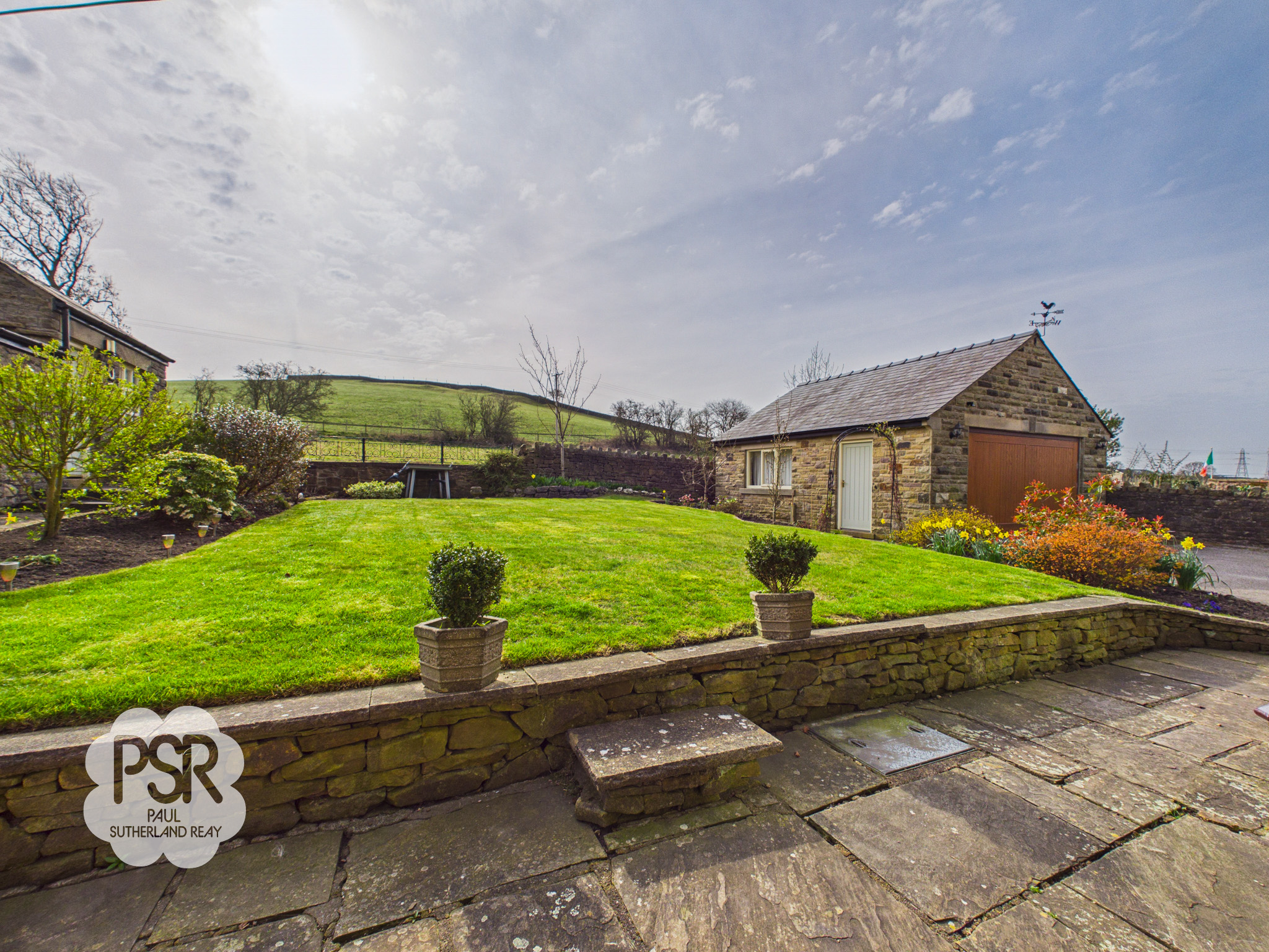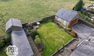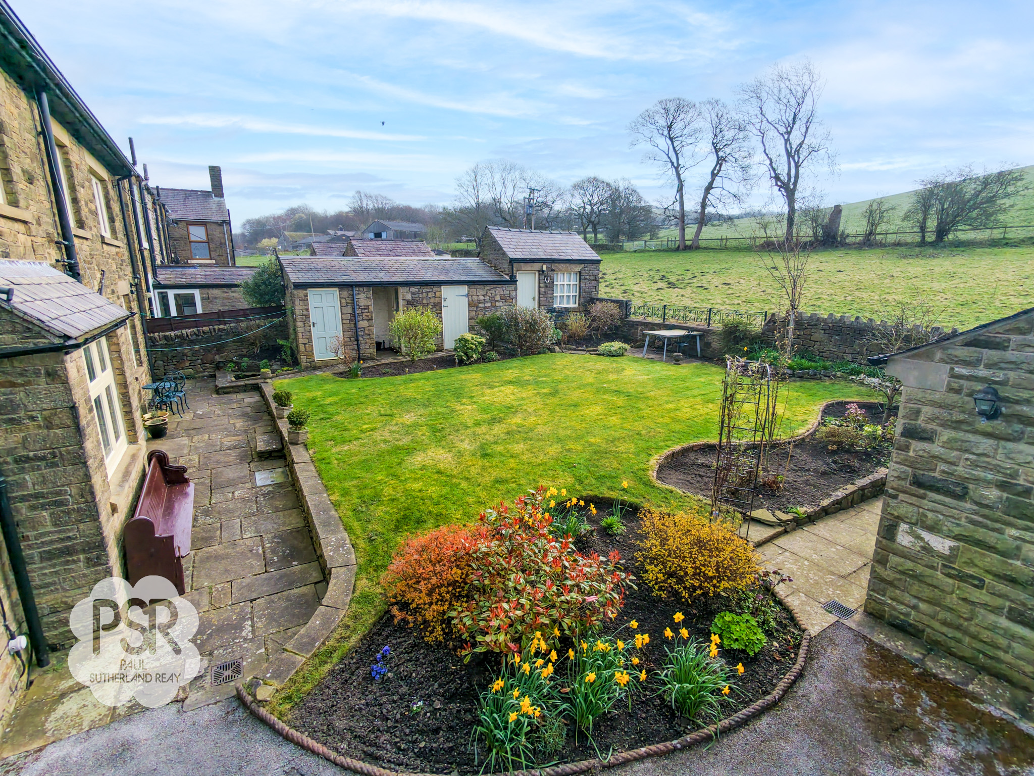 The rear garden is a well-maintained, sunny outdoor space featuring a central lawn bordered by stone-walled flower beds and mature shrubbery. A paved patio area provides ample space for outdoor dining, while stone pathways wrap around the property. The garden benefits from multiple stone-built outbuildings, including a dedicated garden shed, a traditional coal store, and an external toilet. Its open aspect ensures it enjoys sunlight throughout the day, complemented by views of the surrounding countryside.