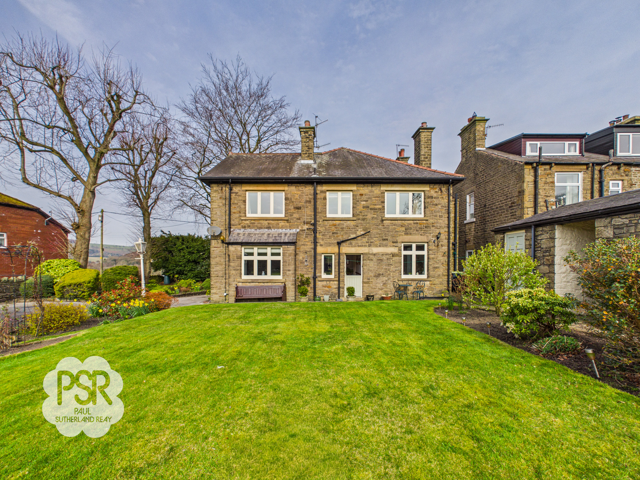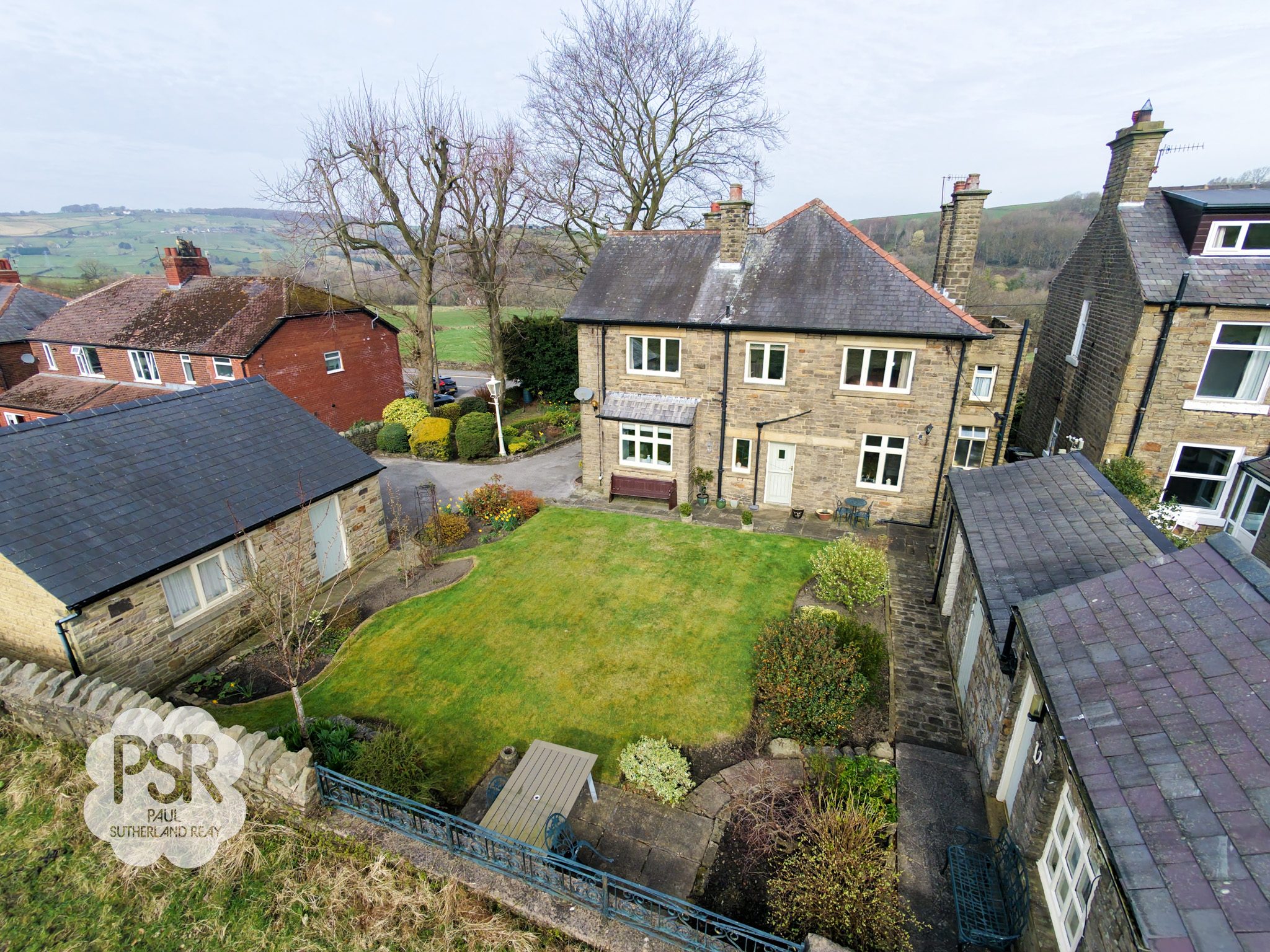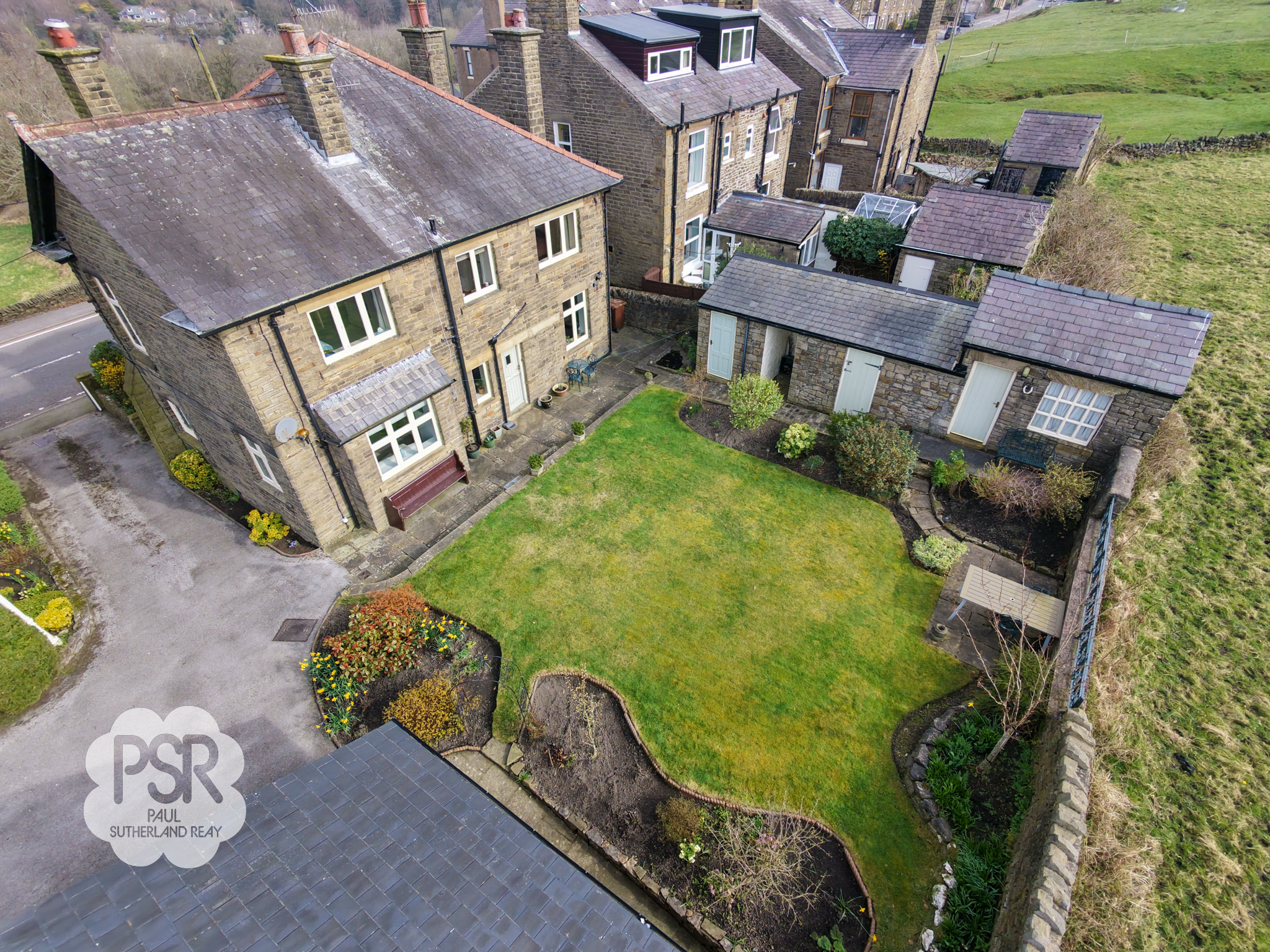 The rear garden is a well-maintained, sunny outdoor space featuring a central lawn bordered by stone-walled flower beds and mature shrubbery. A paved patio area provides ample space for outdoor dining, while stone pathways wrap around the property. The garden benefits from multiple stone-built outbuildings, including a dedicated garden shed, a traditional coal store, and an external toilet. Its open aspect ensures it enjoys sunlight throughout the day, complemented by views of the surrounding countryside.