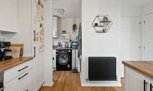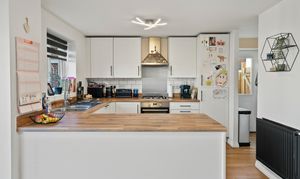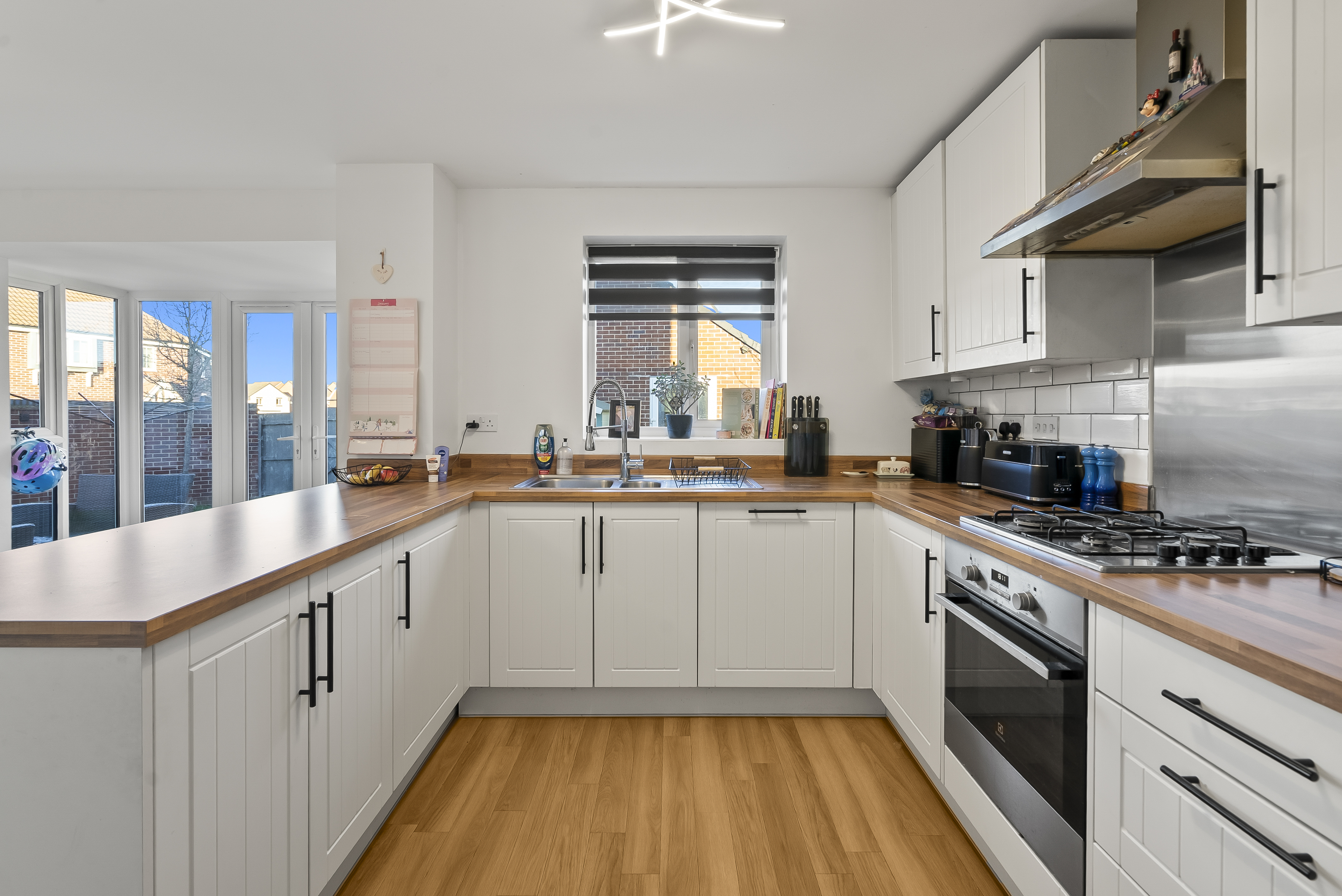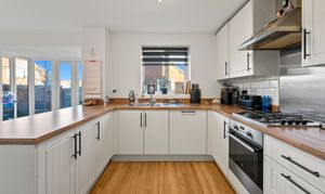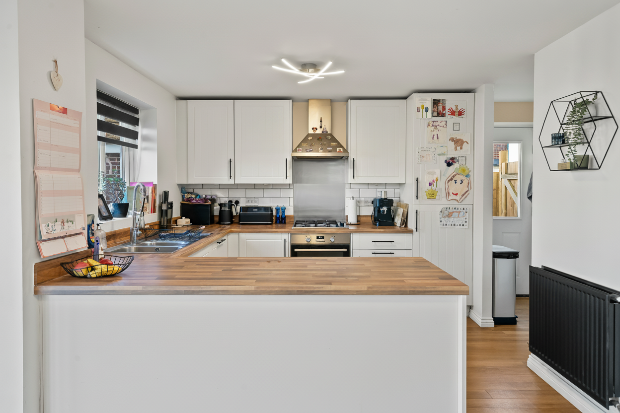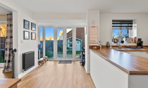 From the moment you step inside, the sense of space and light is immediately apparent. The heart of the home is the impressive open-plan kitchen/ breakfast room, thoughtfully designed with classic shaker-style cabinetry, integrated cooker, hob and extractor hood, and complemented by stylish wood flooring that flows seamlessly throughout. Patio doors open directly onto the rear gardens, creating an inviting space for everyday family living and relaxed entertaining. Adjoining the kitchen is a practical utility room, providing space for additional appliances and a useful side access door.