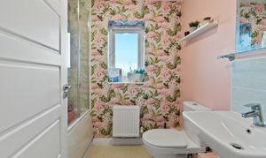 - Family bathroom with a white suite, comprising bath with shower over, basin and W.C.