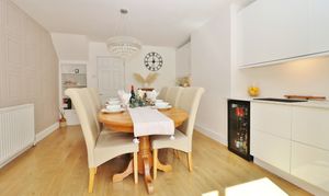 The wonderfully spacious lounge has a wood burning stove and enjoys a triple aspect, including a bay window to the side and French doors opening out to the rear garden. An opening to one side leads through to the sitting room which also has French doors to the garden and is open plan to the generous dining room which has a range of fitted units.